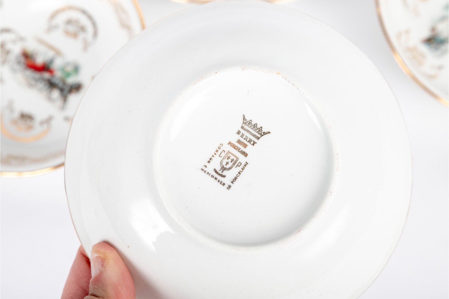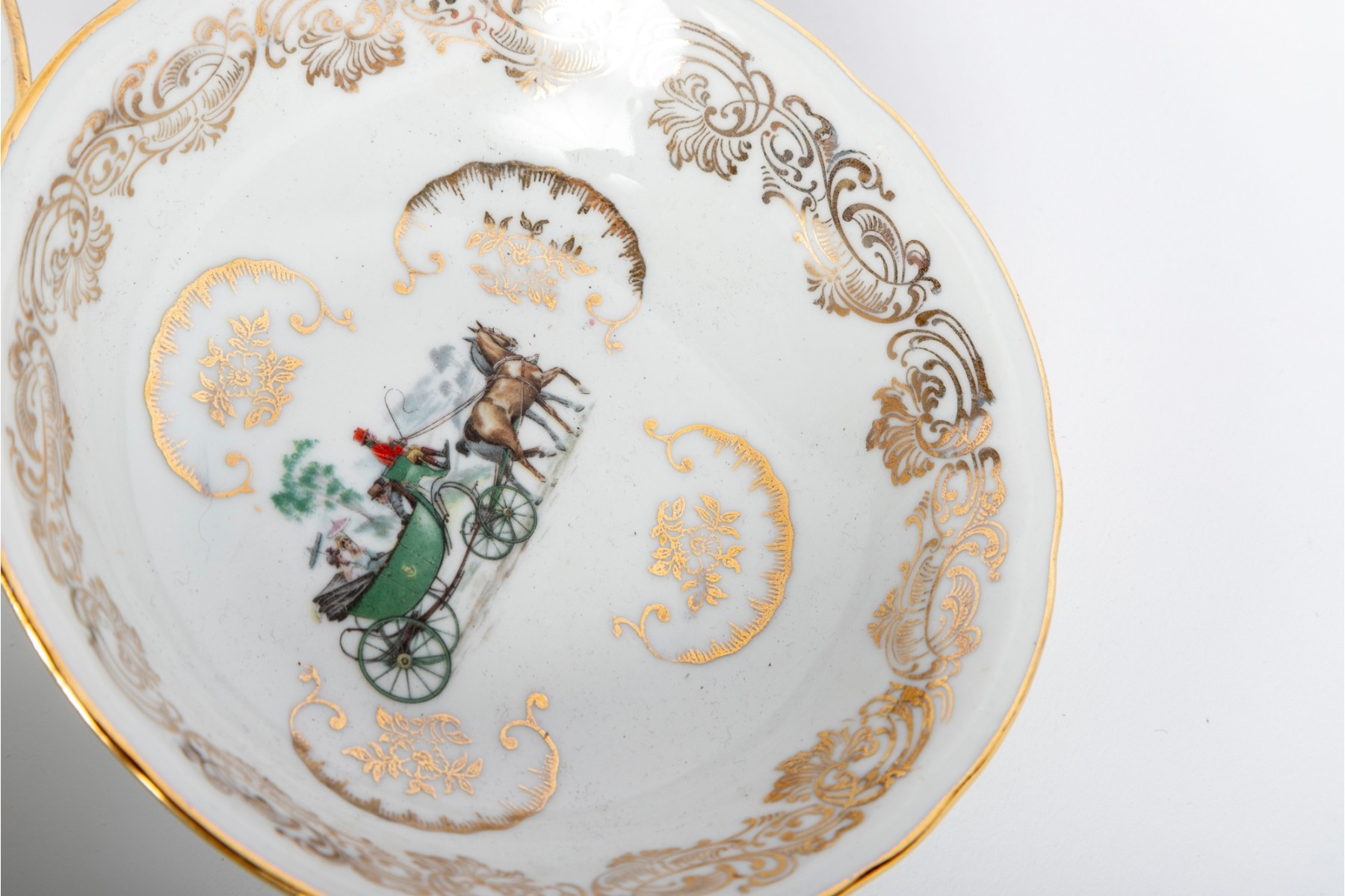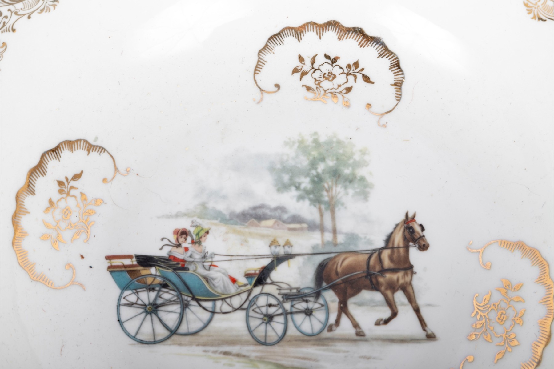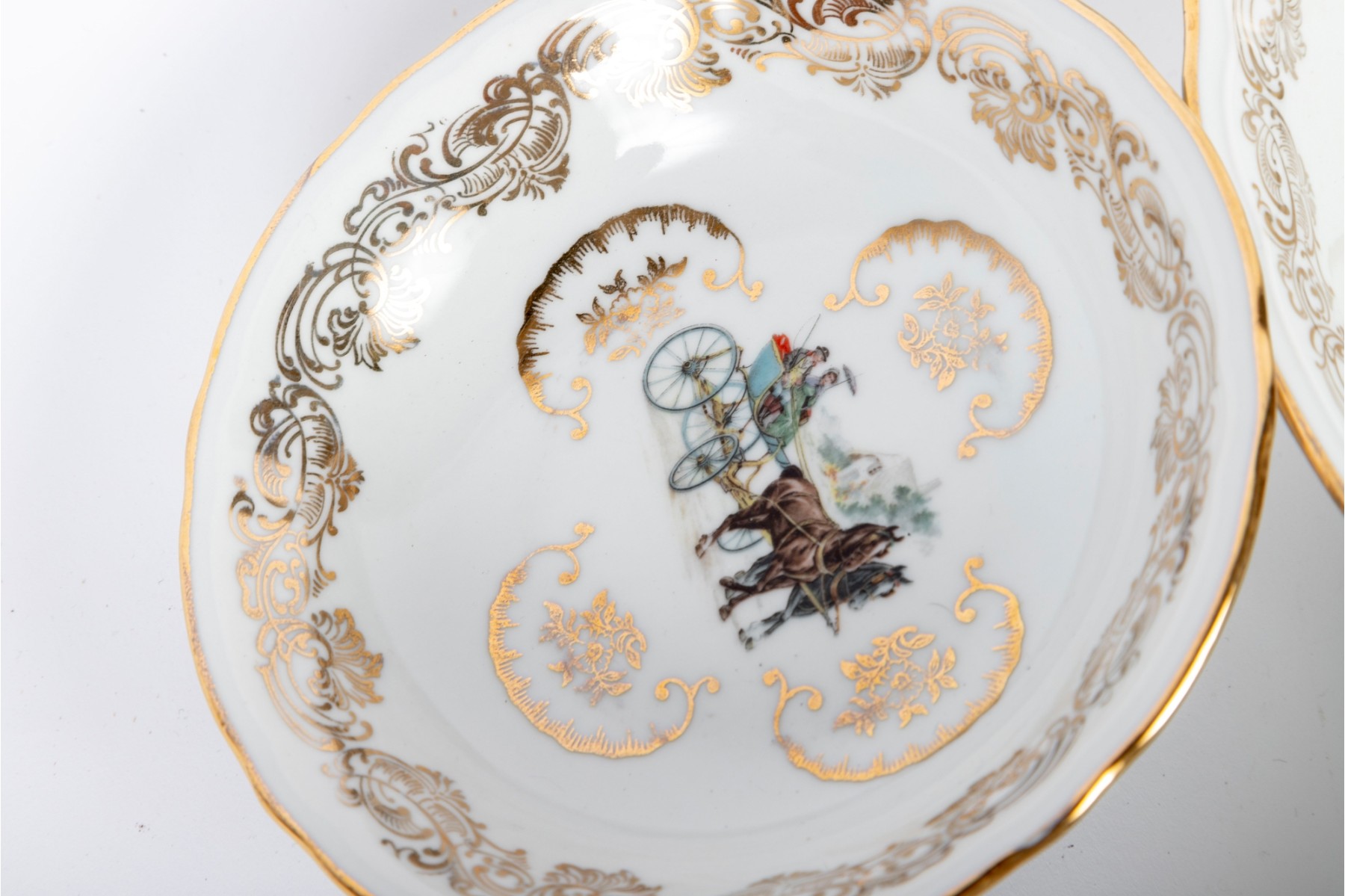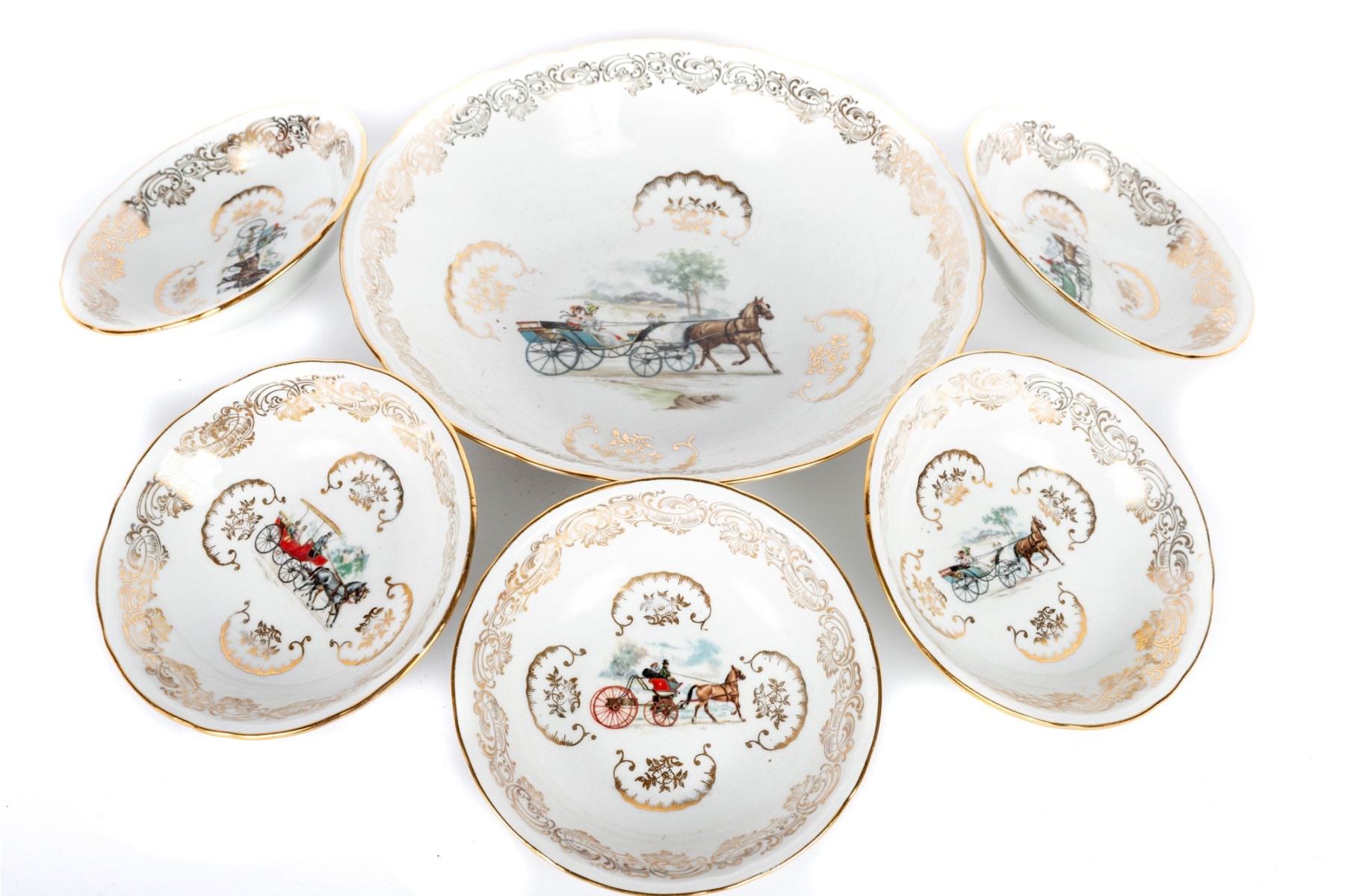 A set of Berry Haute porcelains -- bowls with gold trim representing elegant 19th century carriages and elegant couples and carriage scenes.