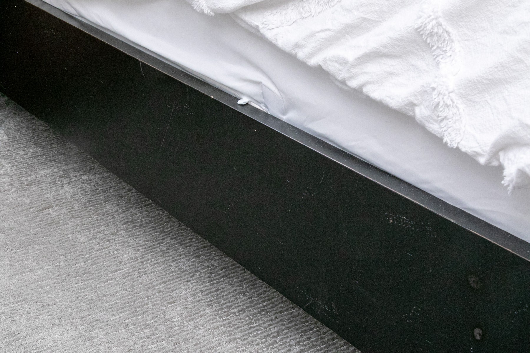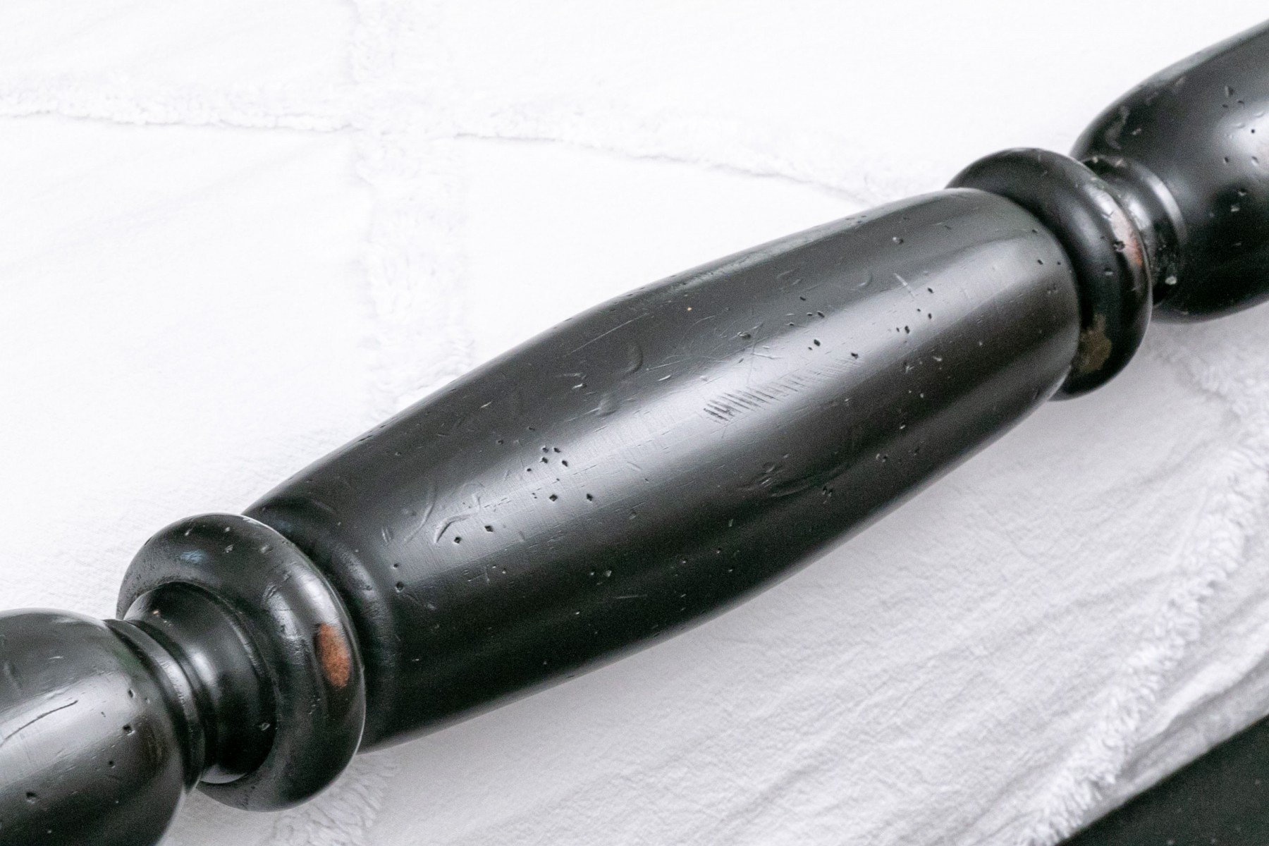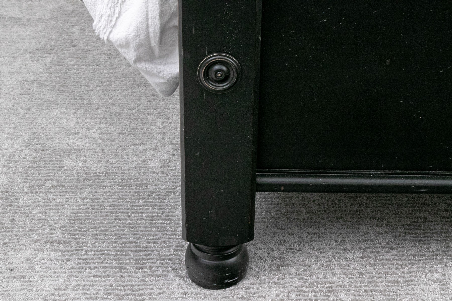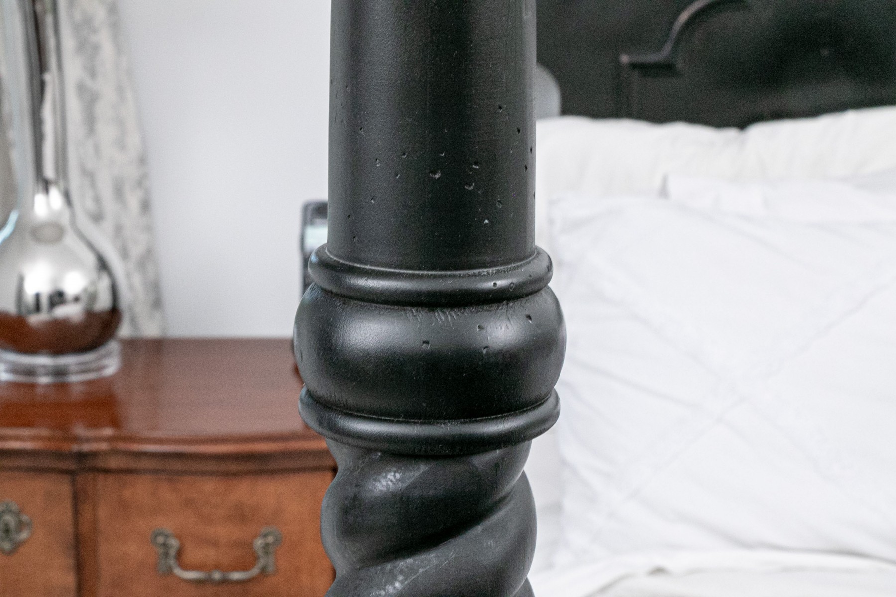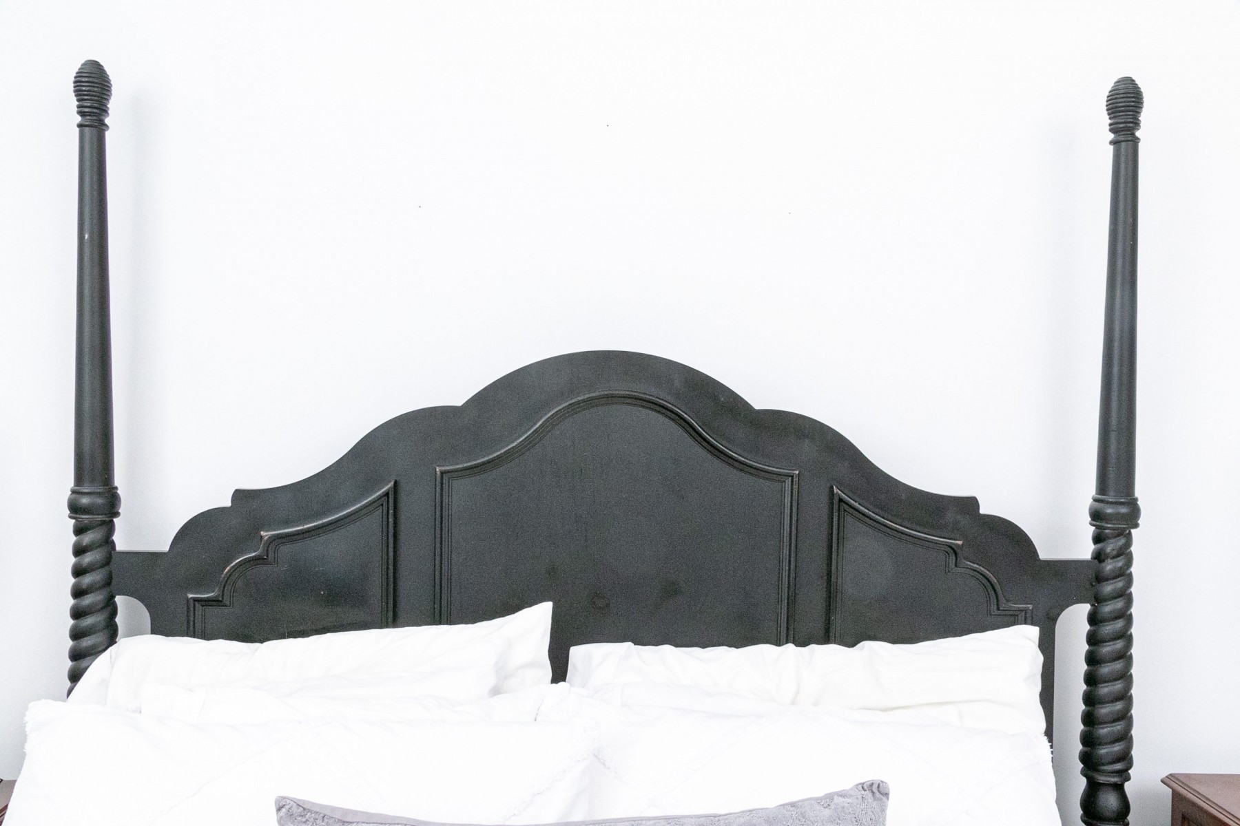 This ebony stained wooden bed has a gracefully shaped headboard with panel detail. The four posters are equal height and have a twist half way up. The rich finish is distressed for an antique look. Mattress and bedding not included.