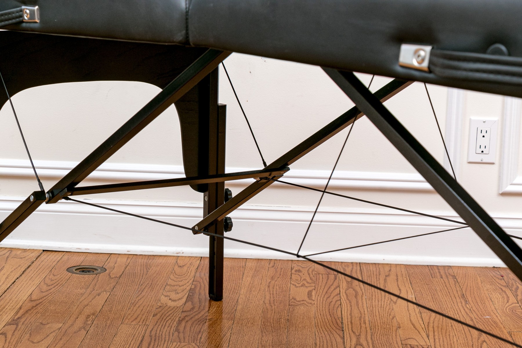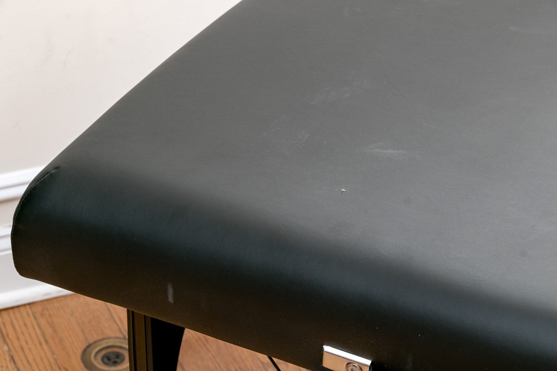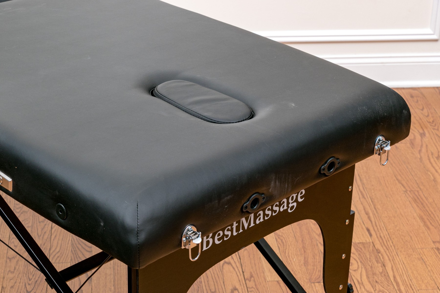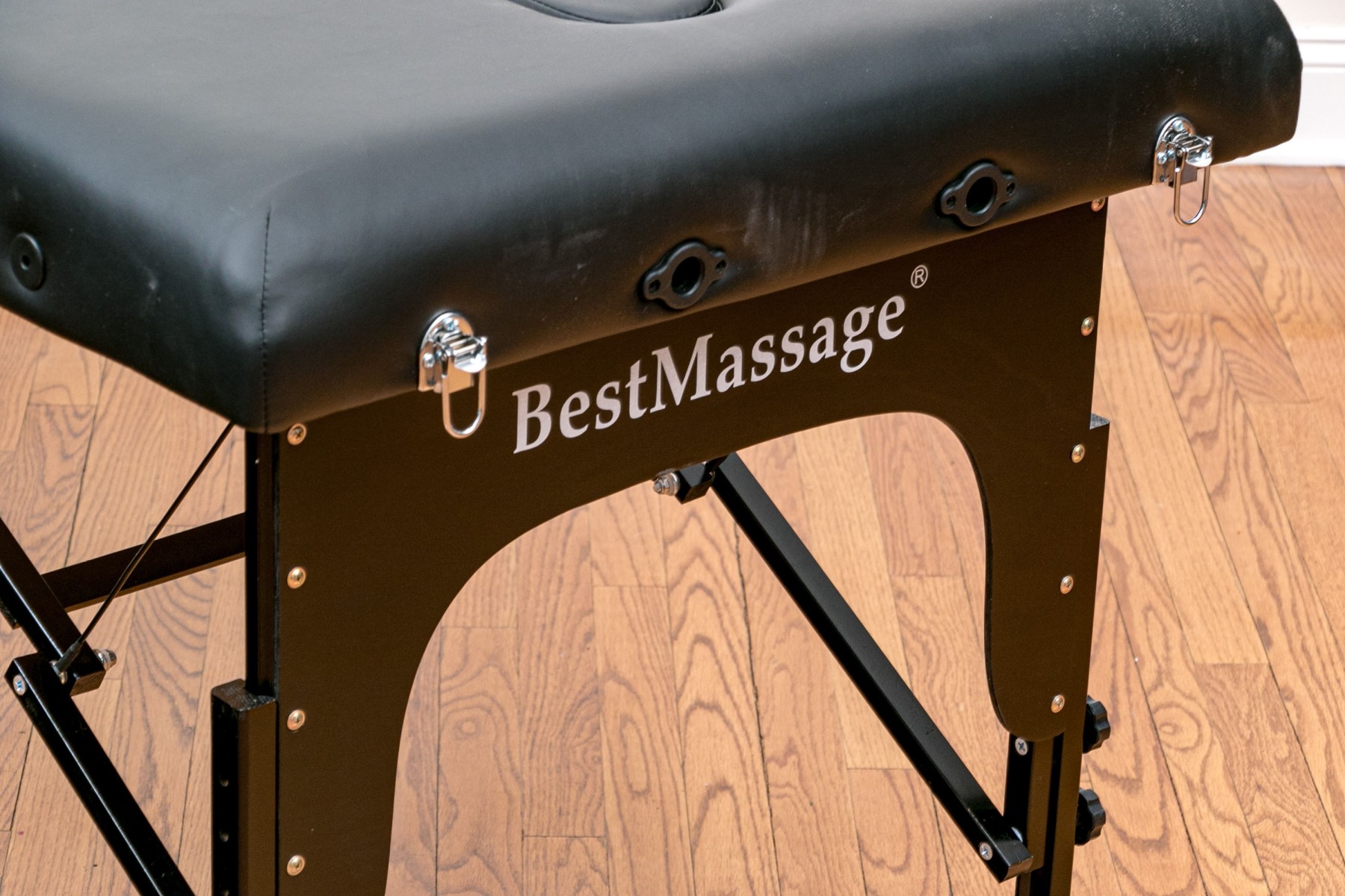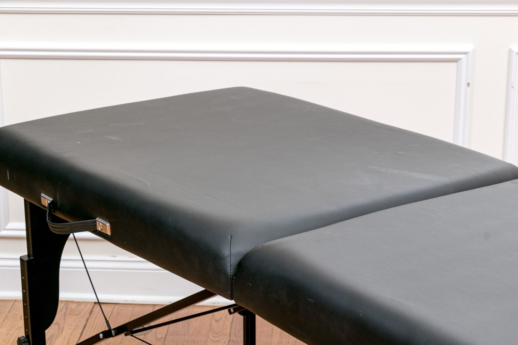 Great quality crafted message table with head extension. Folds for storage purposes. Leather upholstered mattress. Adjustable frame.