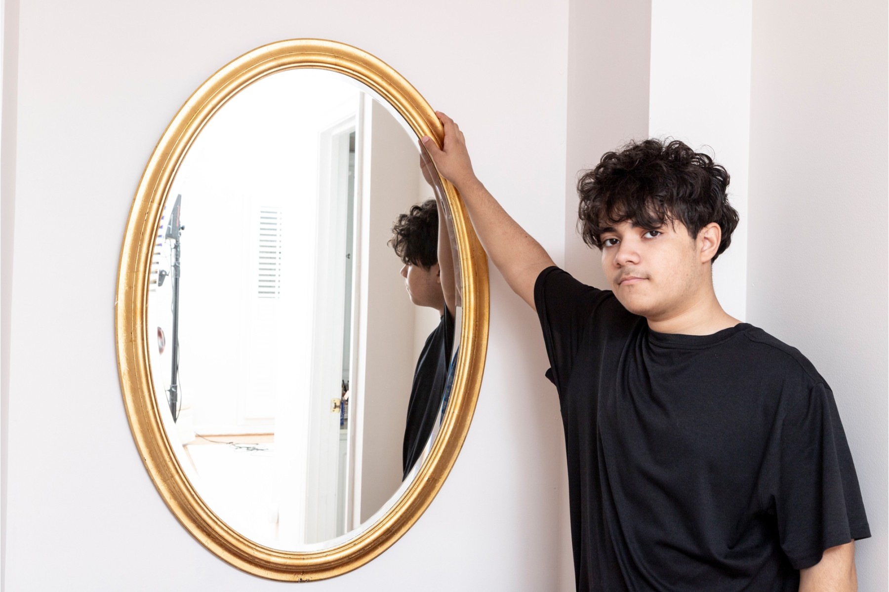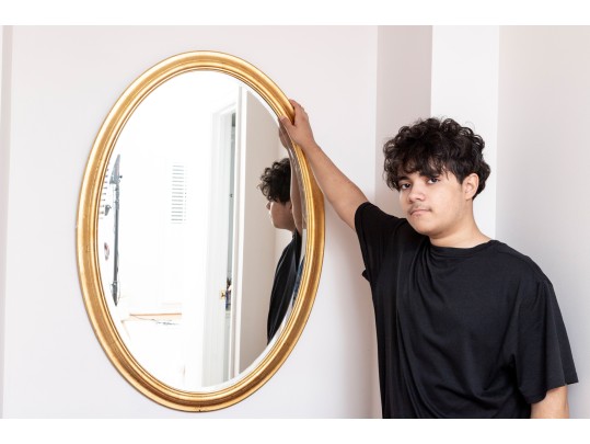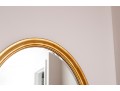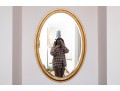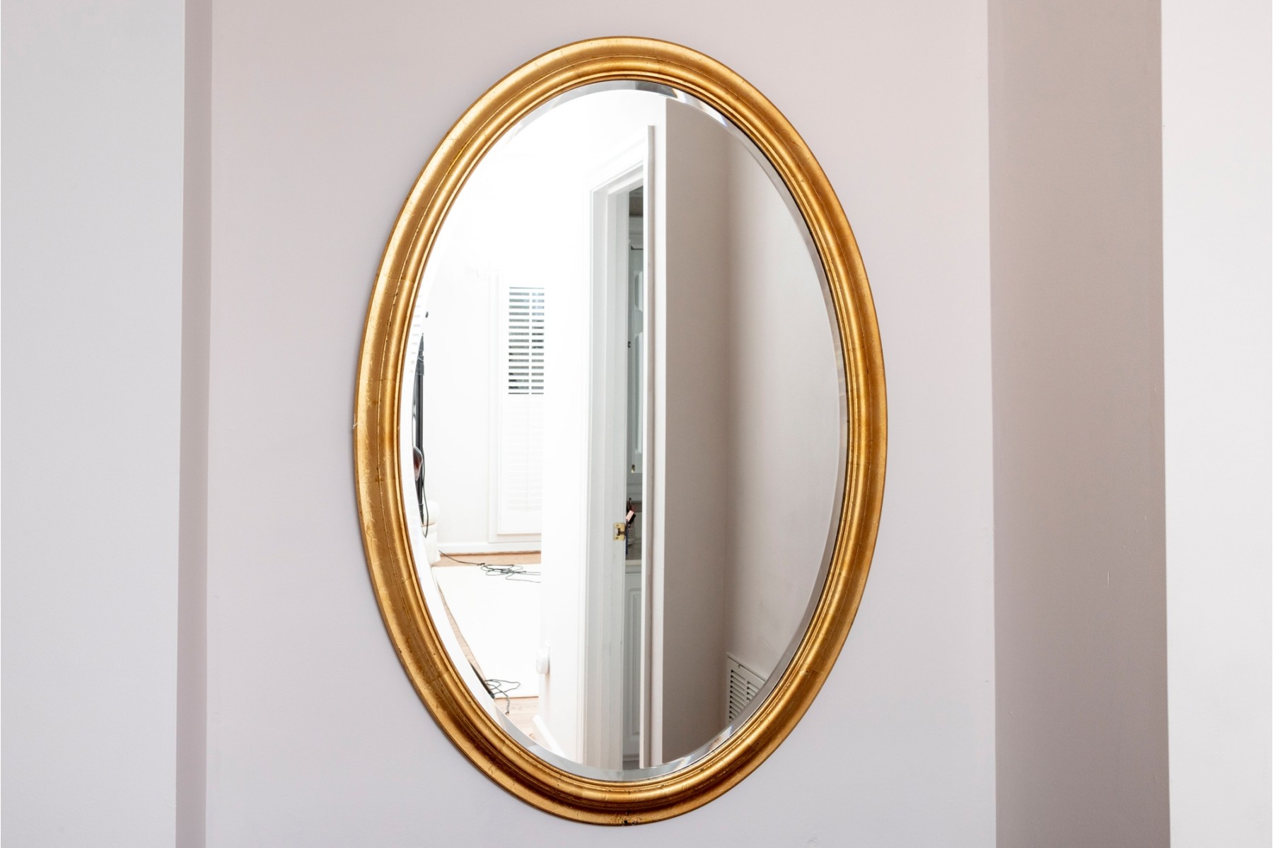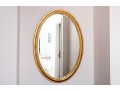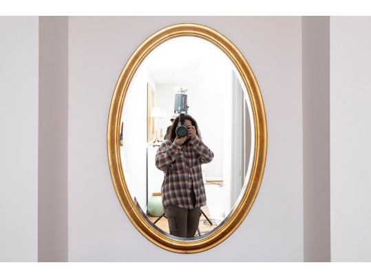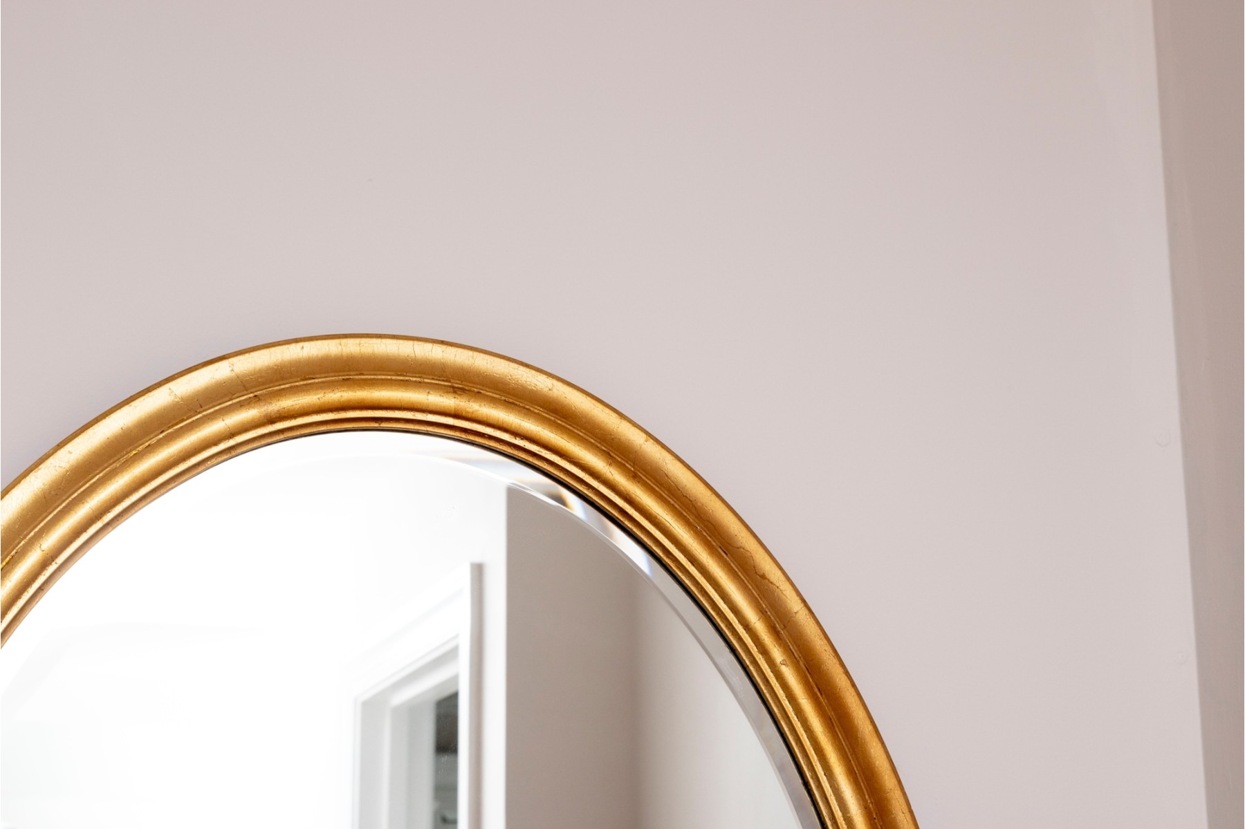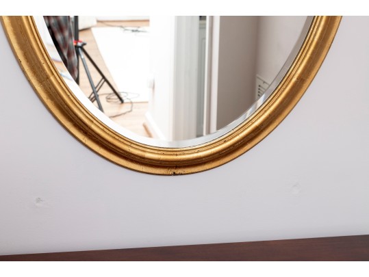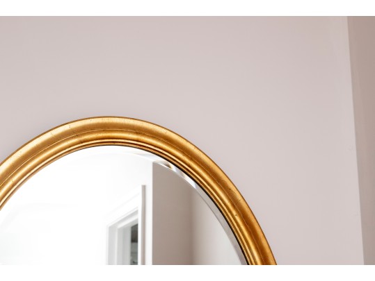 A contemporary oval mirror with a gilt frame and beveled edge detail.