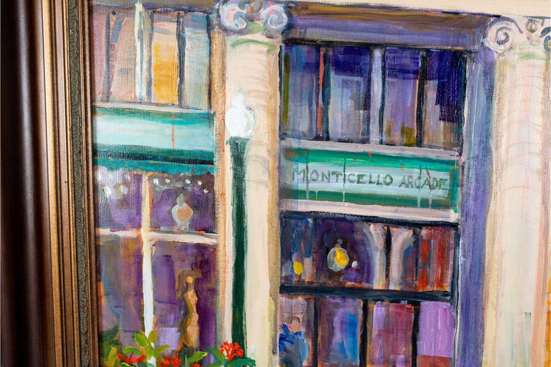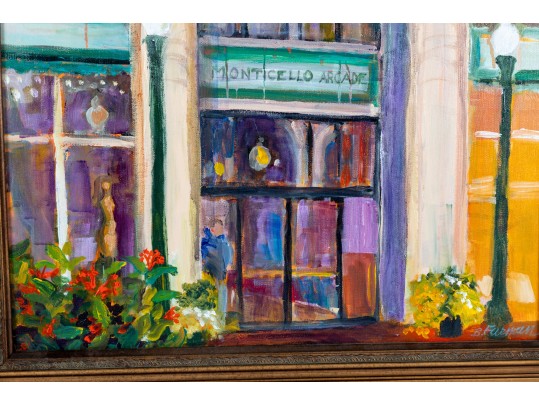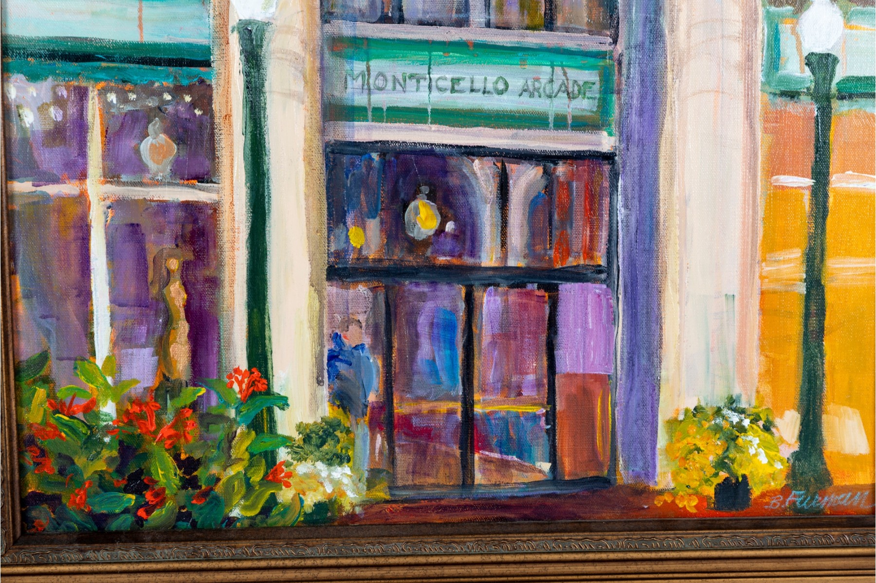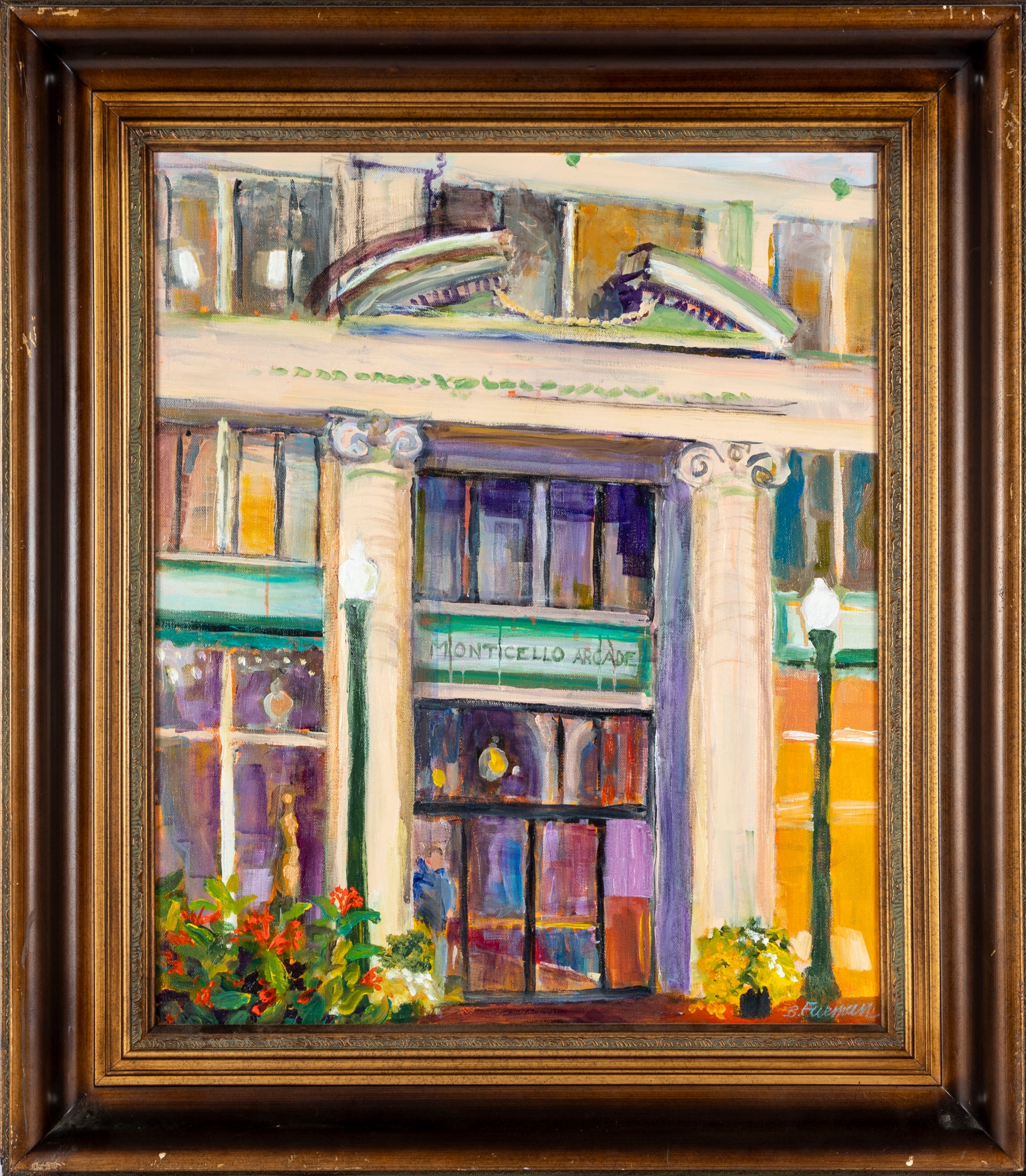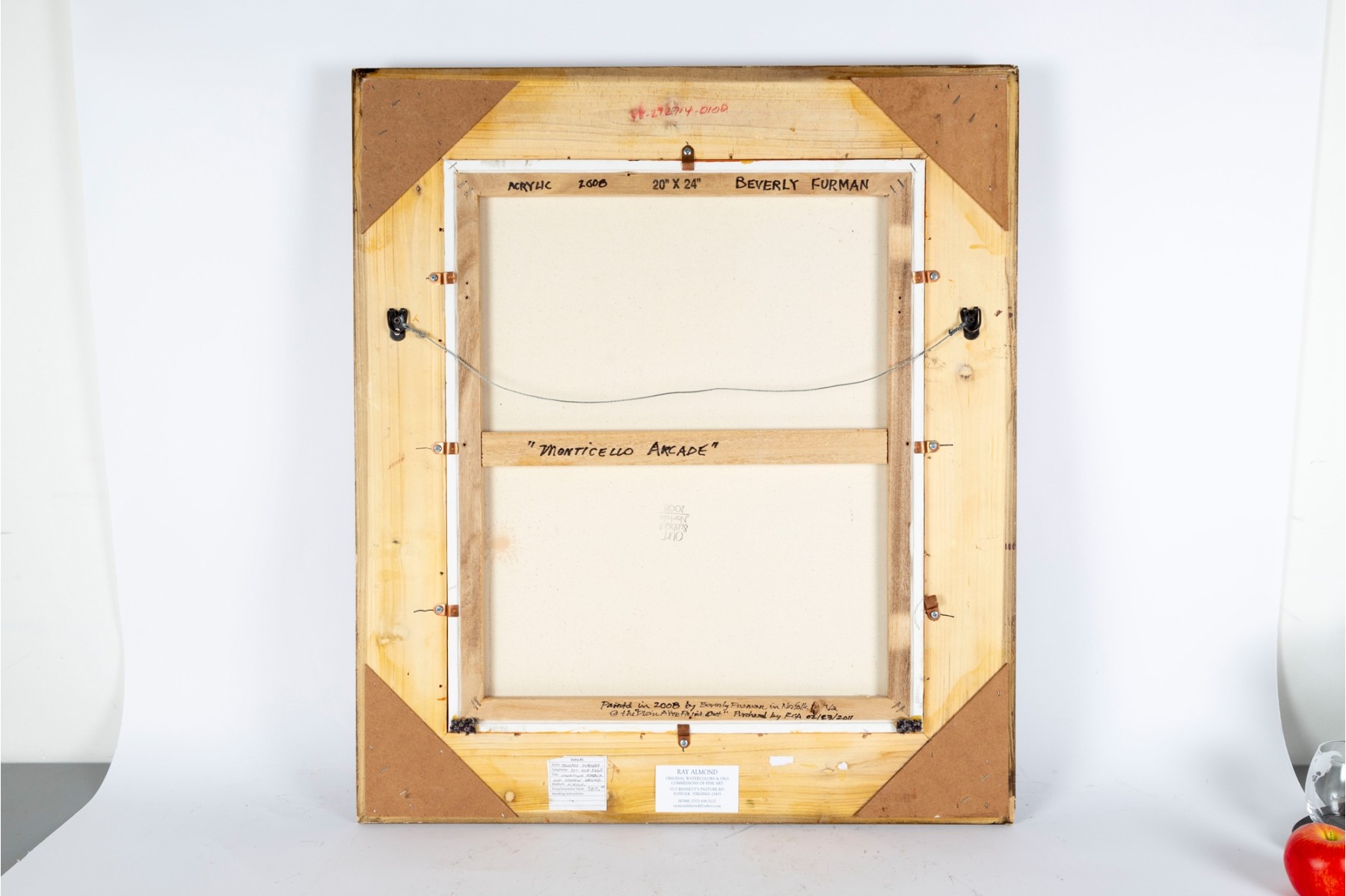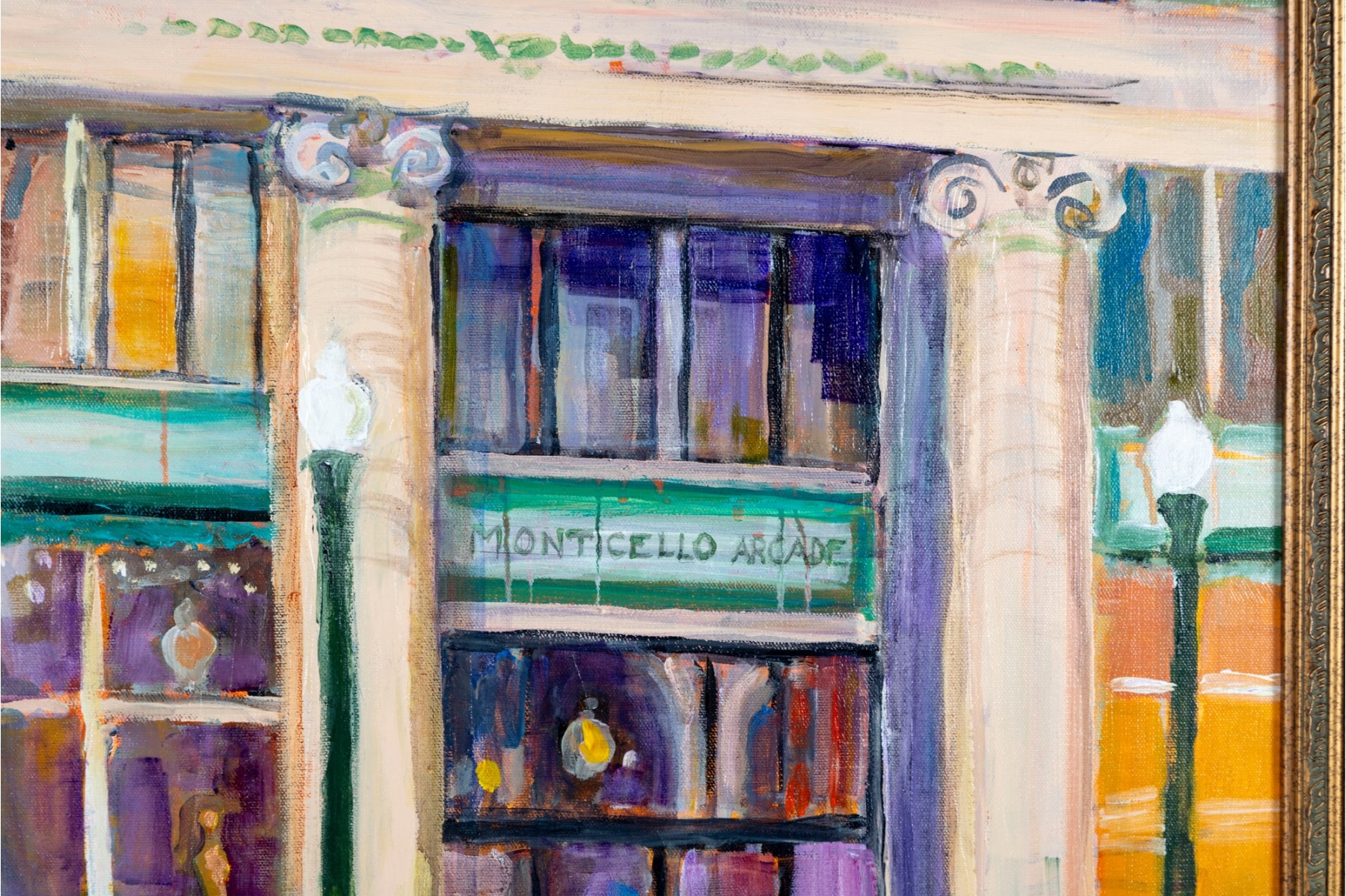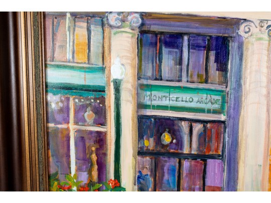 Beverly S. Furman (American, b. 1936) "Monticello Arcade" acrylic painting on canvas depicting the titled building with a stately facade of a green pediment over cream columns lined with glass windows revealing colorful interiors. Signed lower right. Titled on the stretcher verso with a label denoting another title of "Downtown Norfolk Old Stompin' Ground."