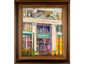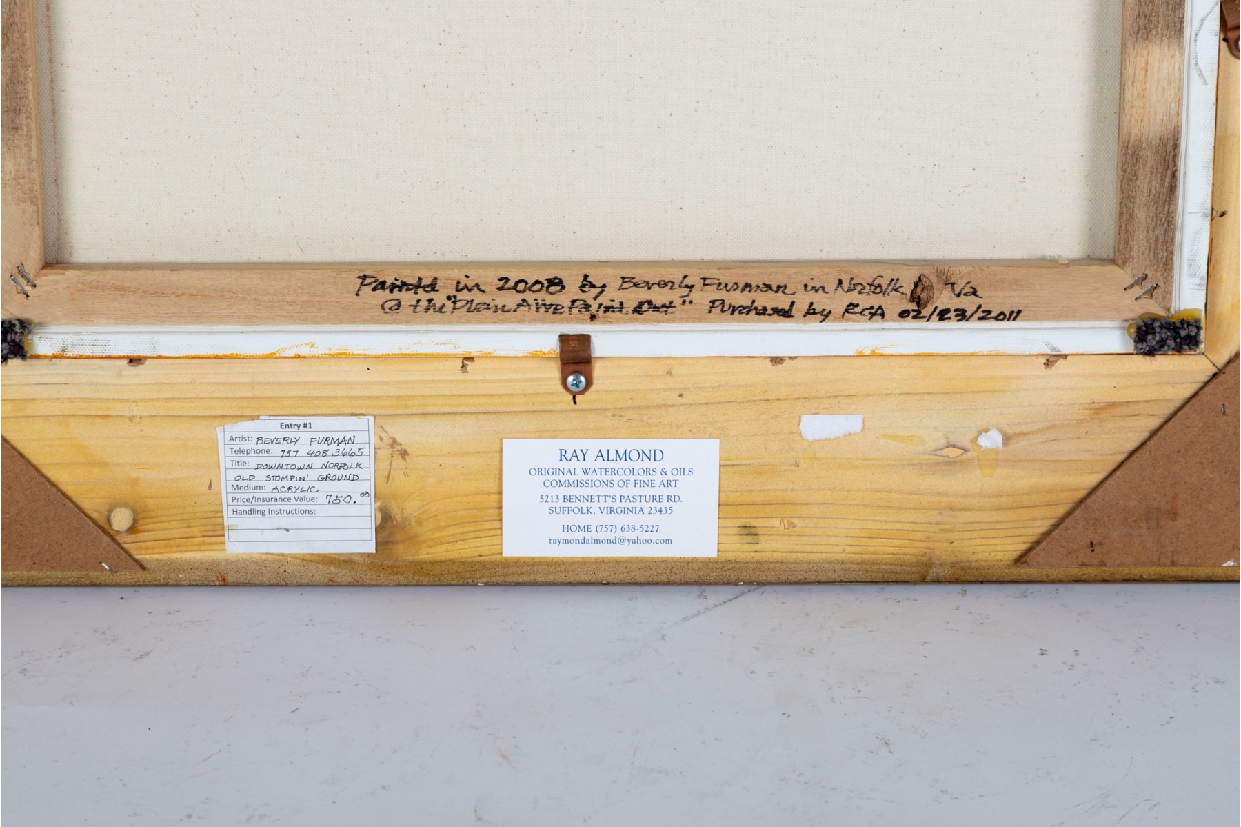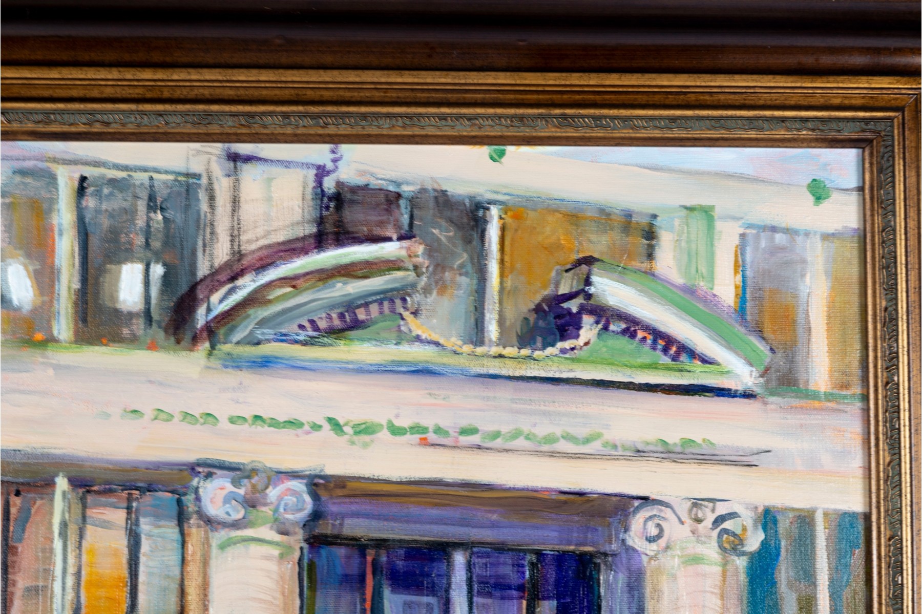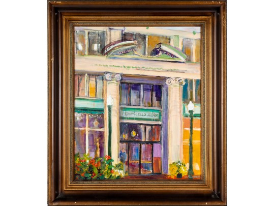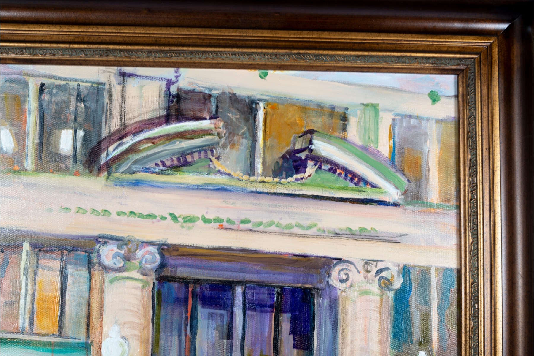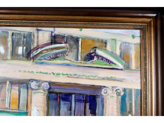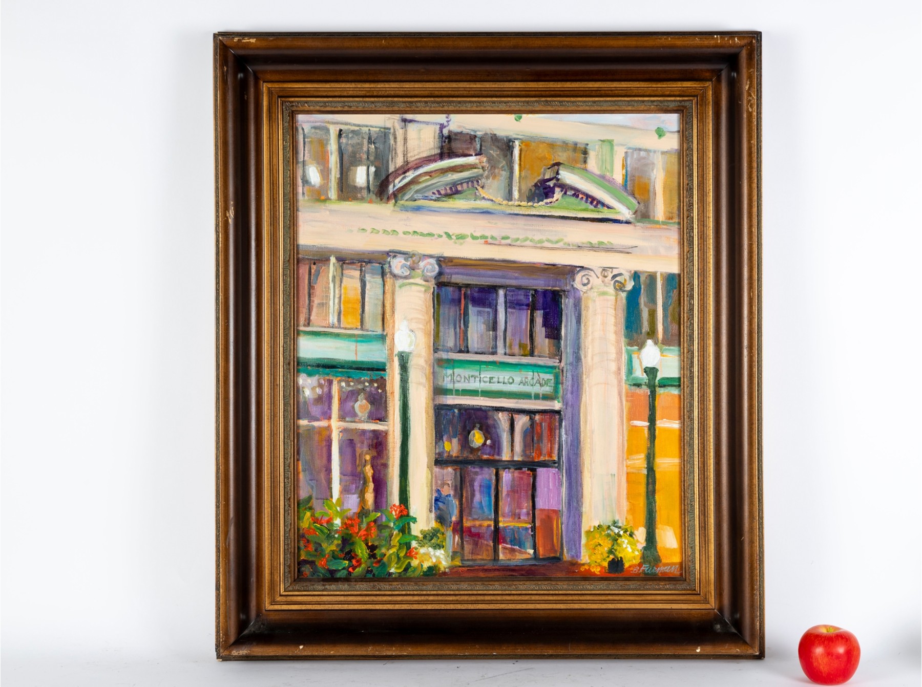 Beverly S. Furman (American, b. 1936) "Monticello Arcade" acrylic painting on canvas depicting the titled building with a stately facade of a green pediment over cream columns lined with glass windows revealing colorful interiors. Signed lower right. Titled on the stretcher verso with a label denoting another title of "Downtown Norfolk Old Stompin' Ground."