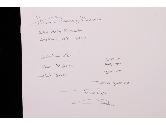 On the back of the paper a price list of two sculptures made for the Harness Racing Museum & Hall of Fame in Goshen, NY. The price list is signed Bev.