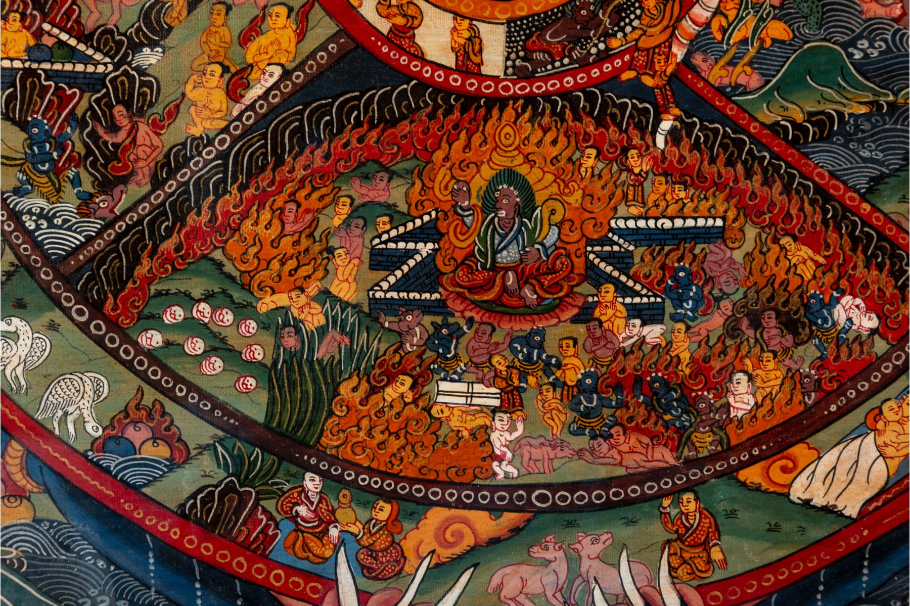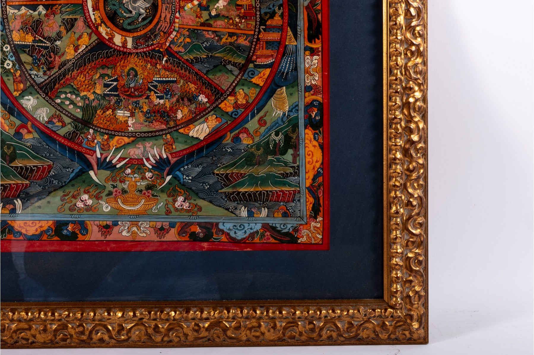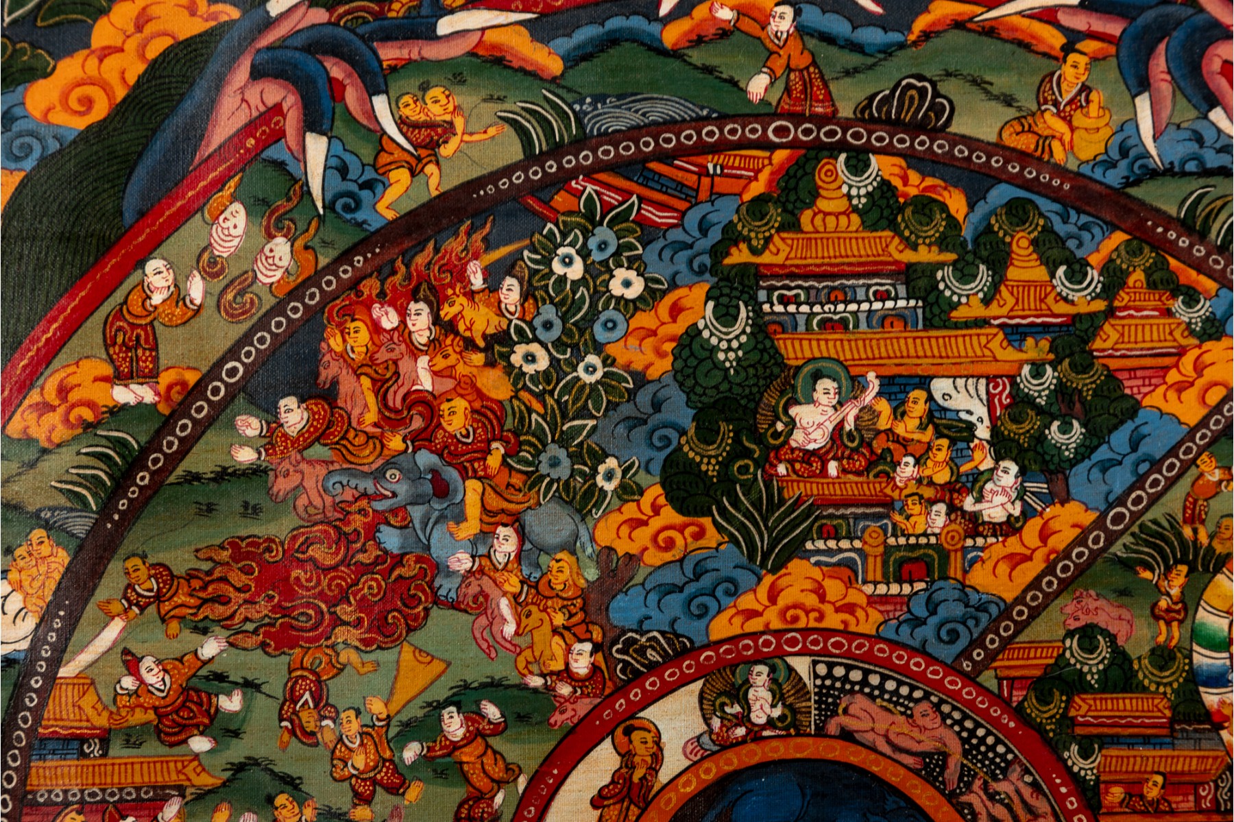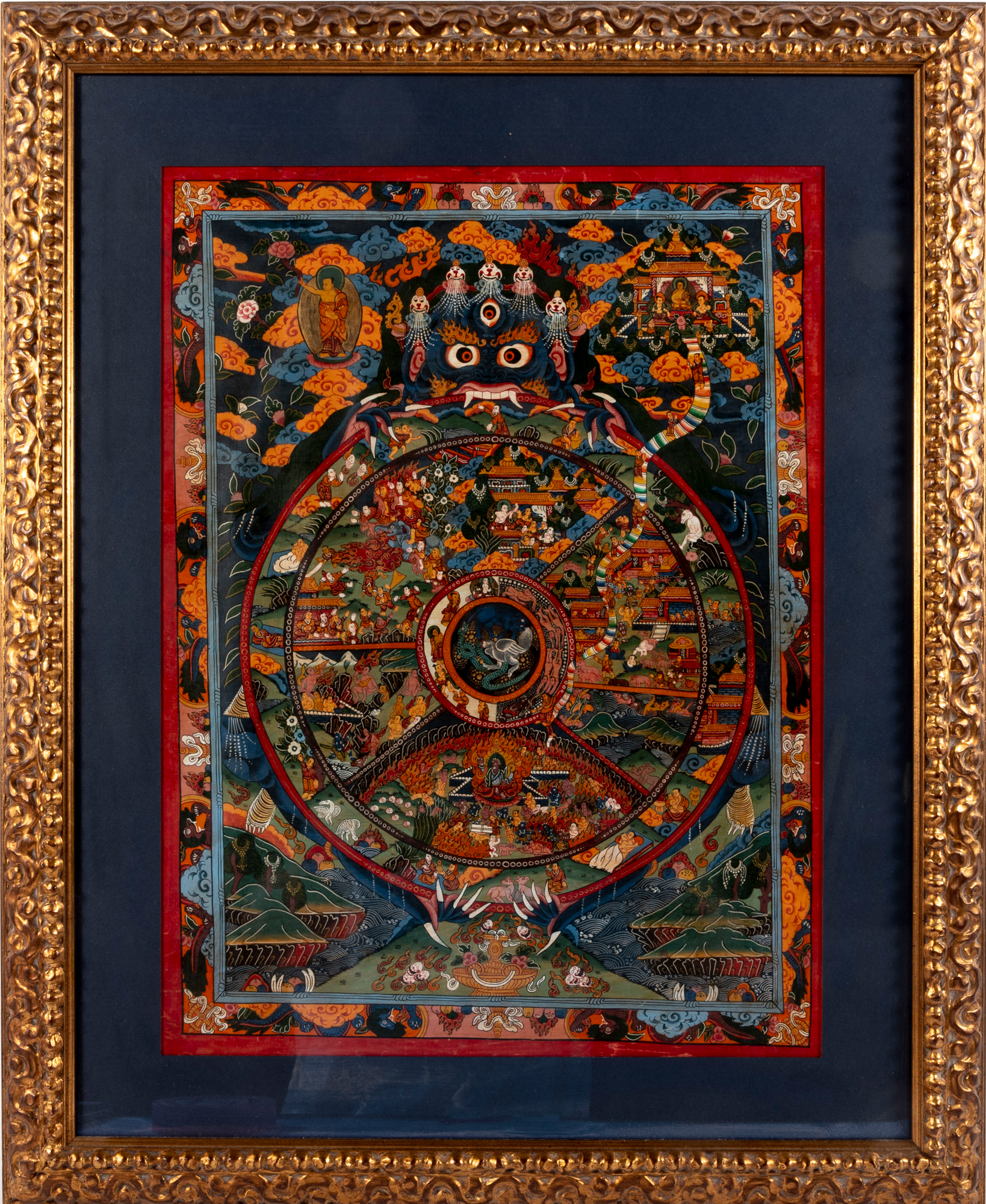 A Bhavacakra/Samsara, or "Wheel of Life" in Bhuddist culture refers to the circle of existence and the six realms of reincarnation which compose the anatomy of this intricate hand-painted fabric mandala; God Realm, Demi God Realm, Animal Realm, Hell Realm, Preta Realm, and the Human Realm. Yama, the wrathful god of hell in Buddhist religion, overlooks the cyclic realms below, invoking judgement over mortals.