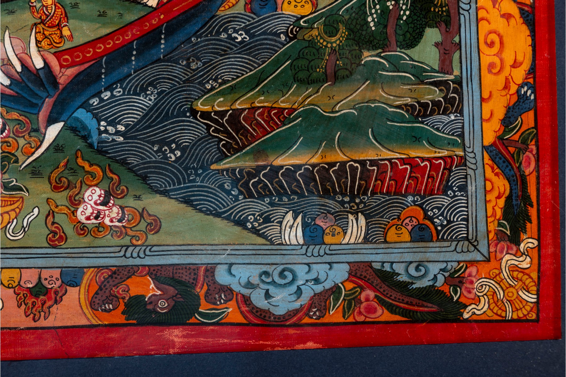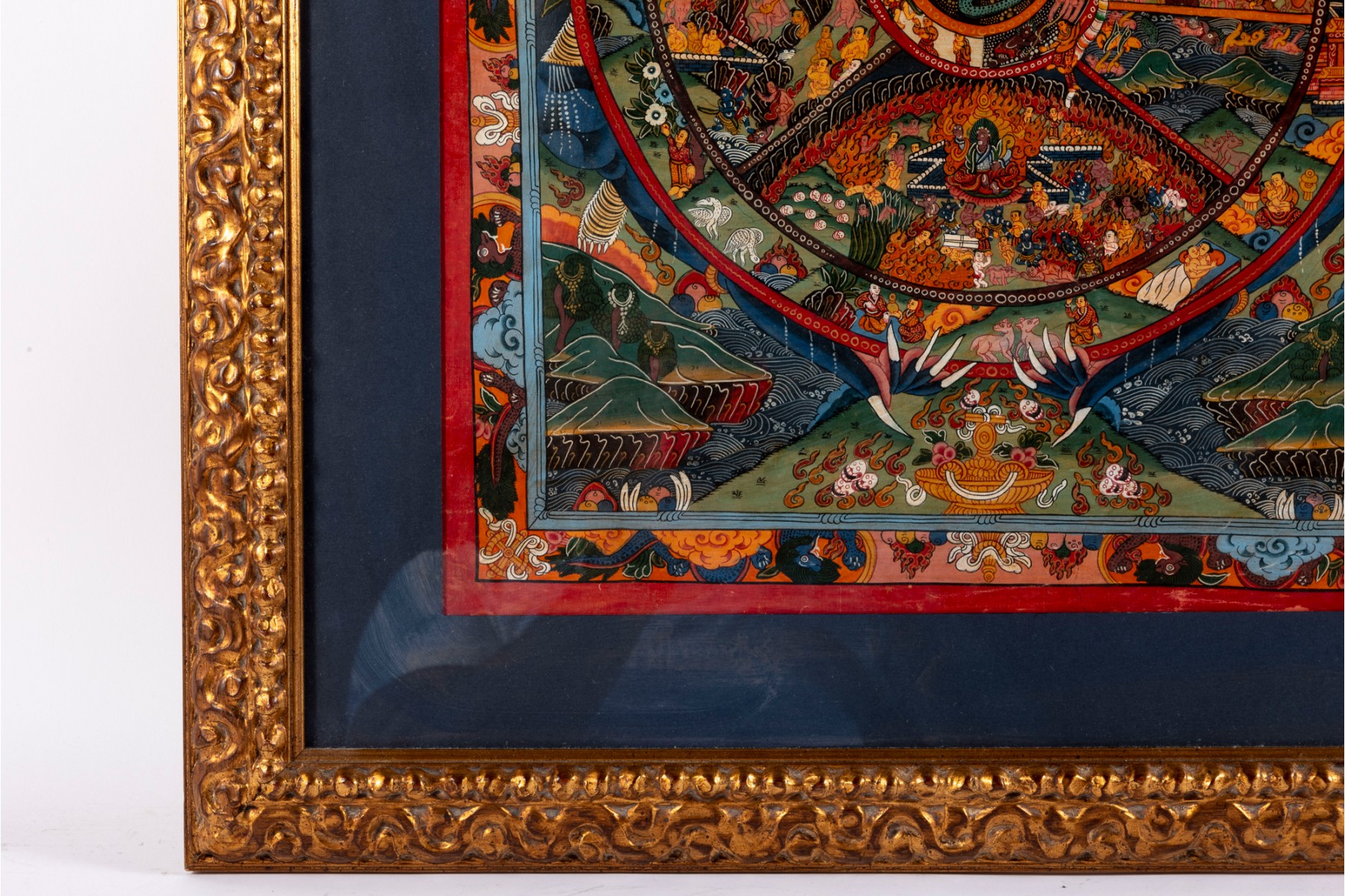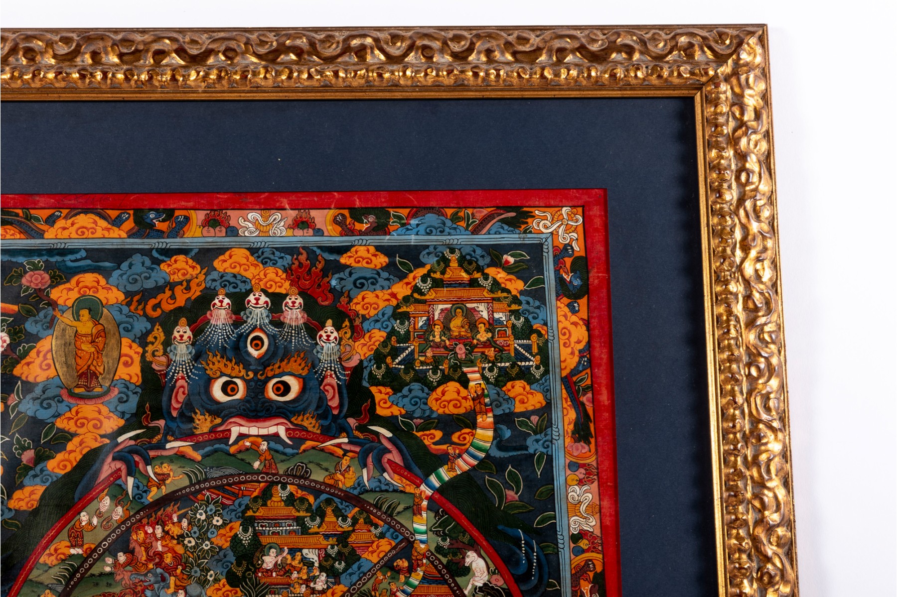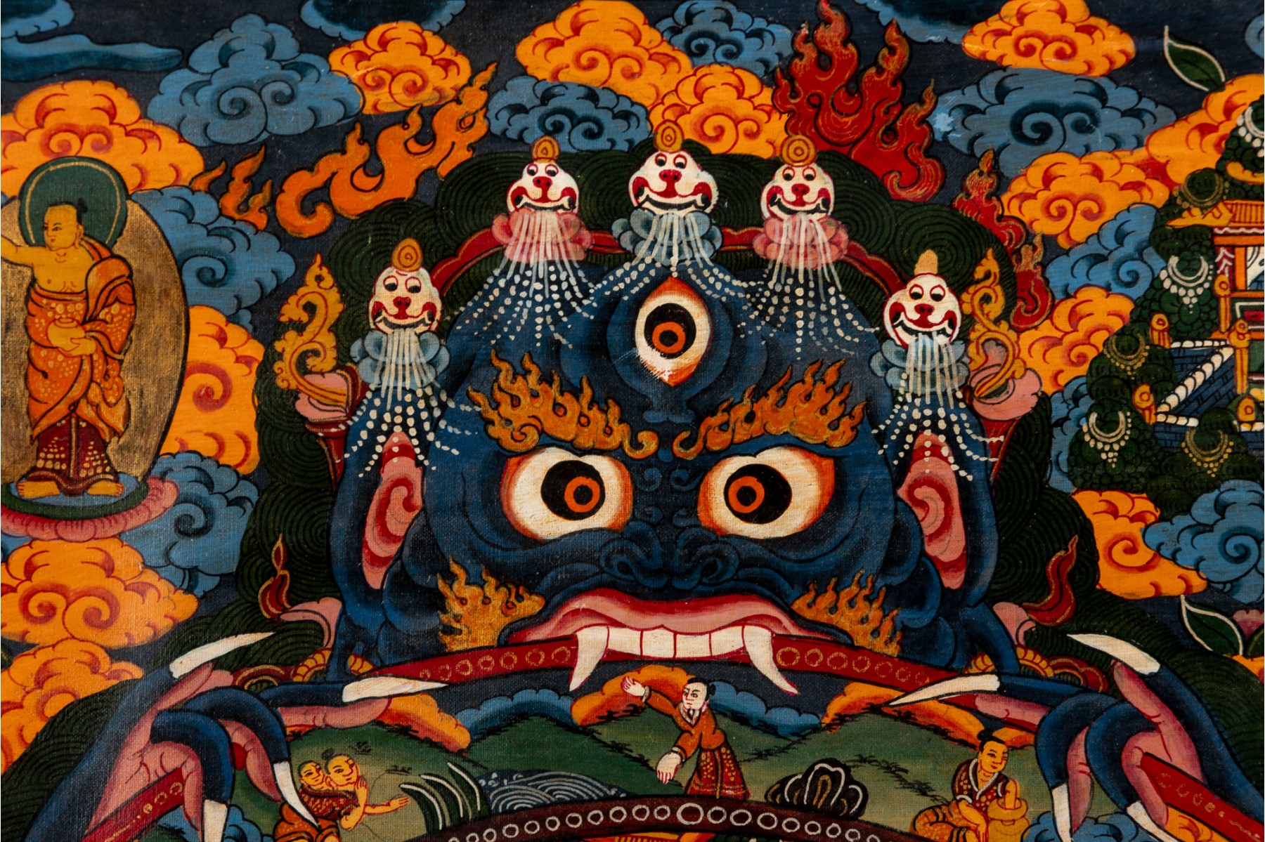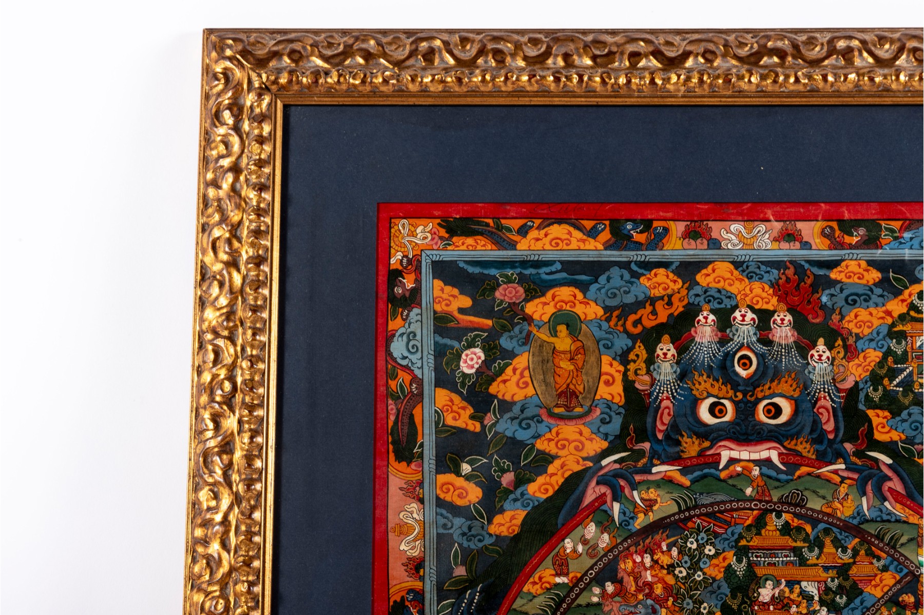 A Bhavacakra/Samsara, or "Wheel of Life" in Bhuddist culture refers to the circle of existence and the six realms of reincarnation which compose the anatomy of this intricate hand-painted fabric mandala; God Realm, Demi God Realm, Animal Realm, Hell Realm, Preta Realm, and the Human Realm. Yama, the wrathful god of hell in Buddhist religion, overlooks the cyclic realms below, invoking judgement over mortals.