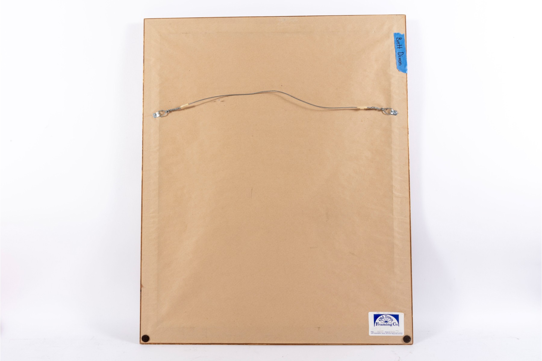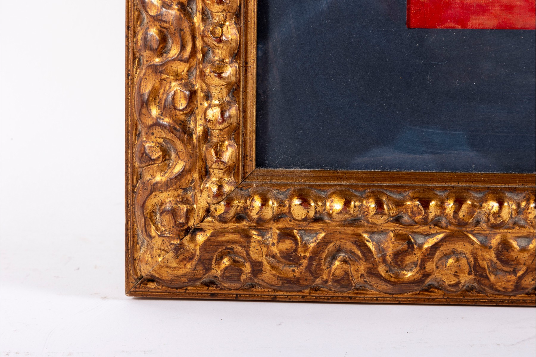 The painting is presented in an ornate gilt frame with f=carved details -- faced with glass and accented with a navy mat border.