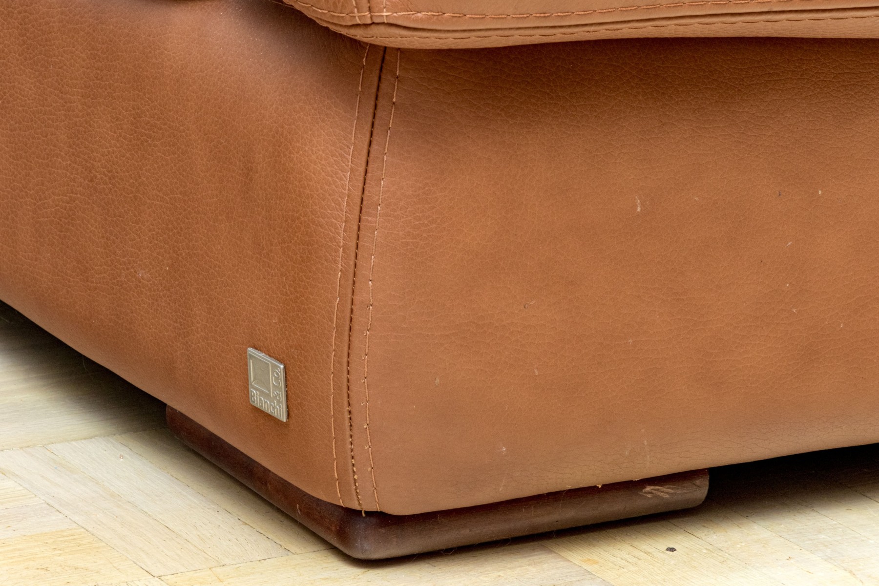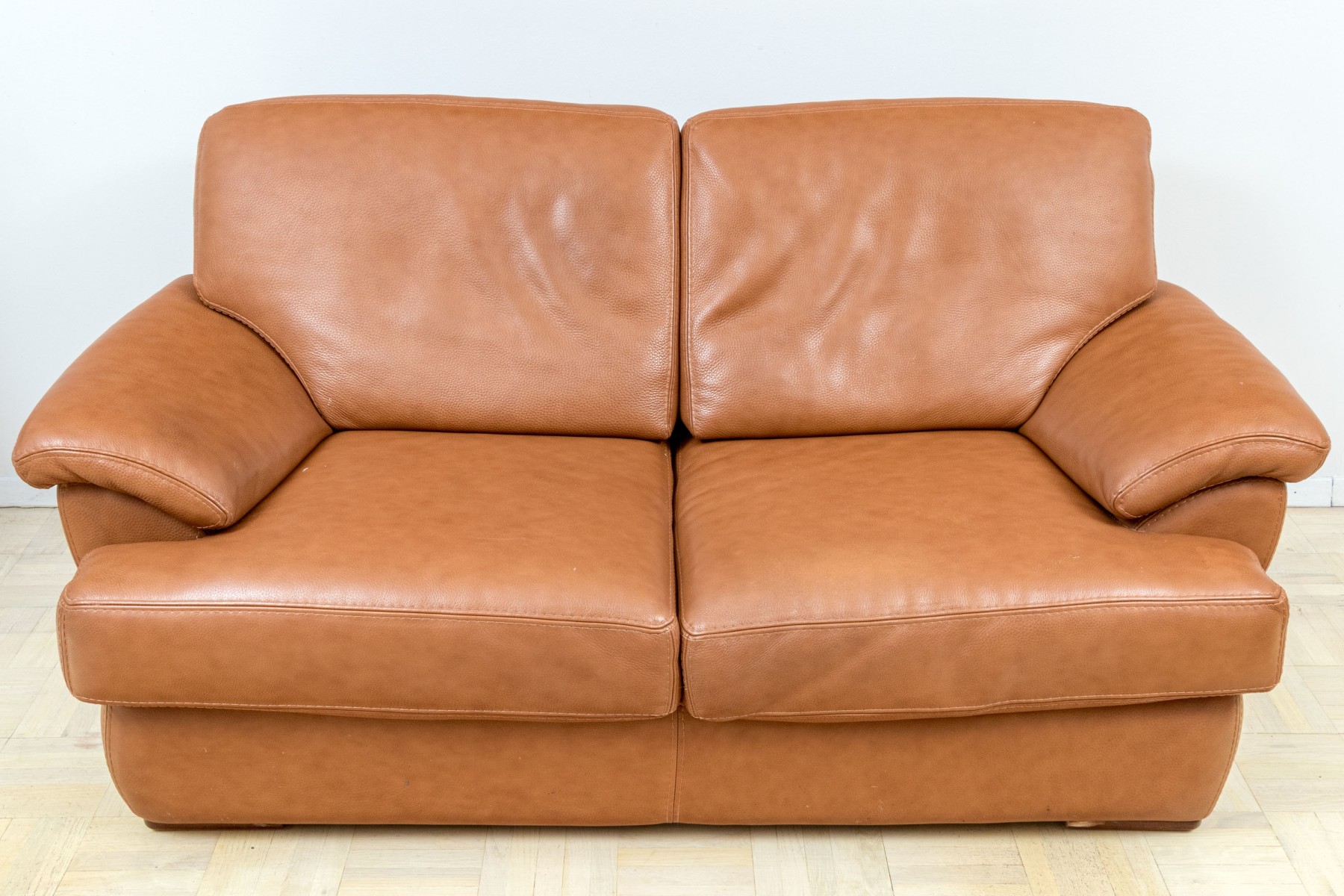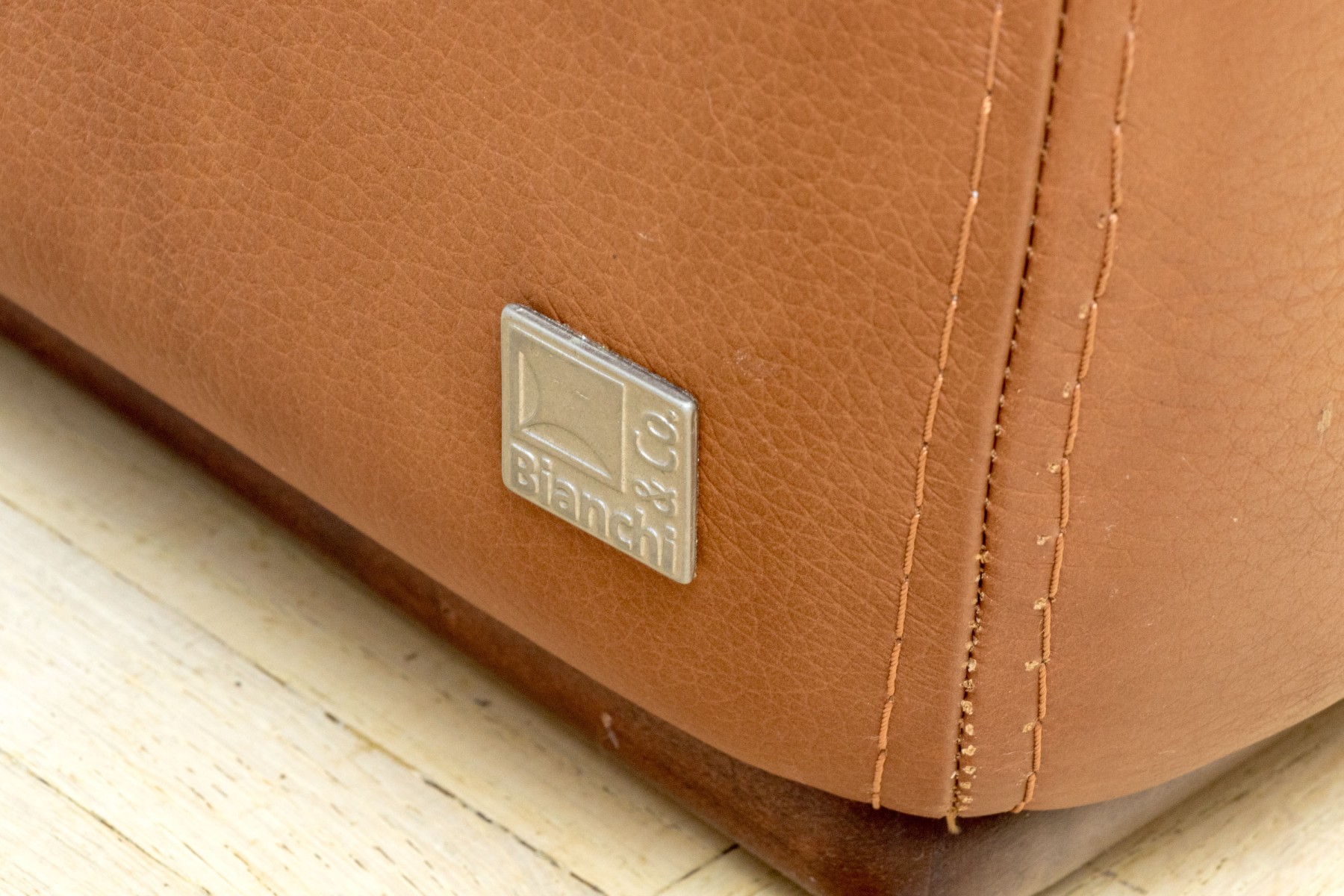 On short wood legs with quality Italian brown leather upholstery. With two loose upholstered seat cushions and two seat back cushions with zipper and clip to release from the frame.
