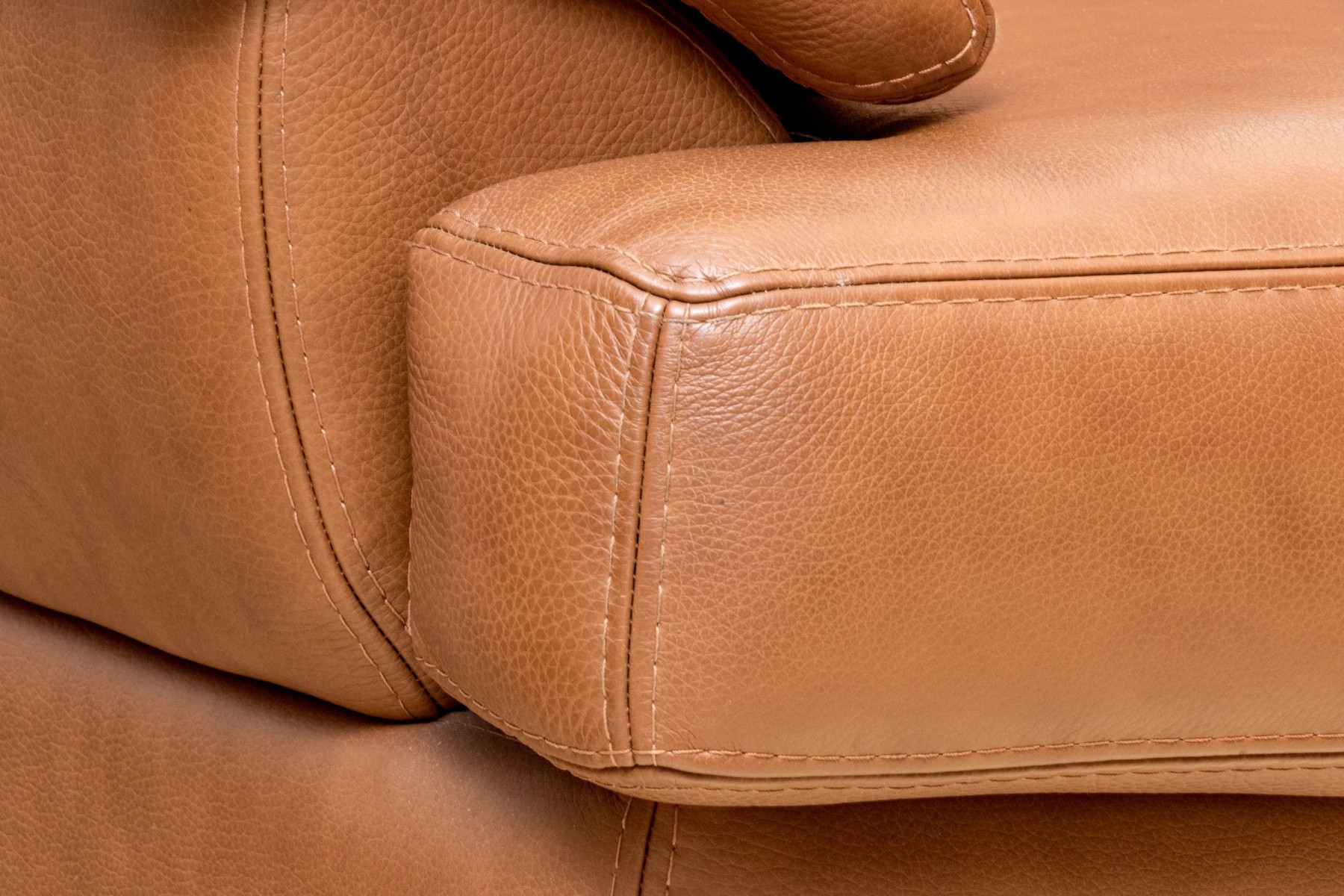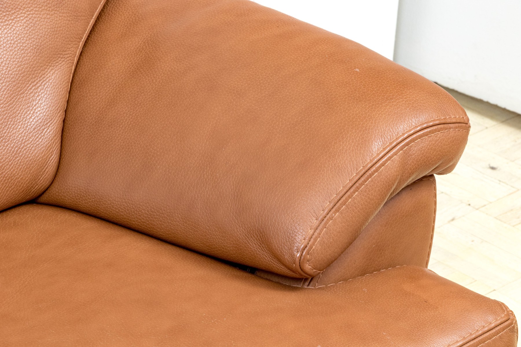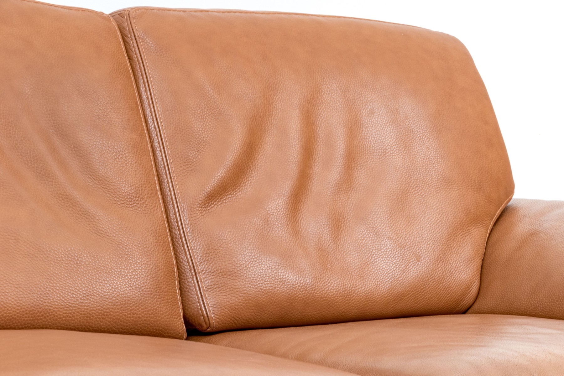 On short wood legs with quality Italian brown leather upholstery. With two loose upholstered seat cushions and two seat back cushions with zipper and clip to release from the frame.