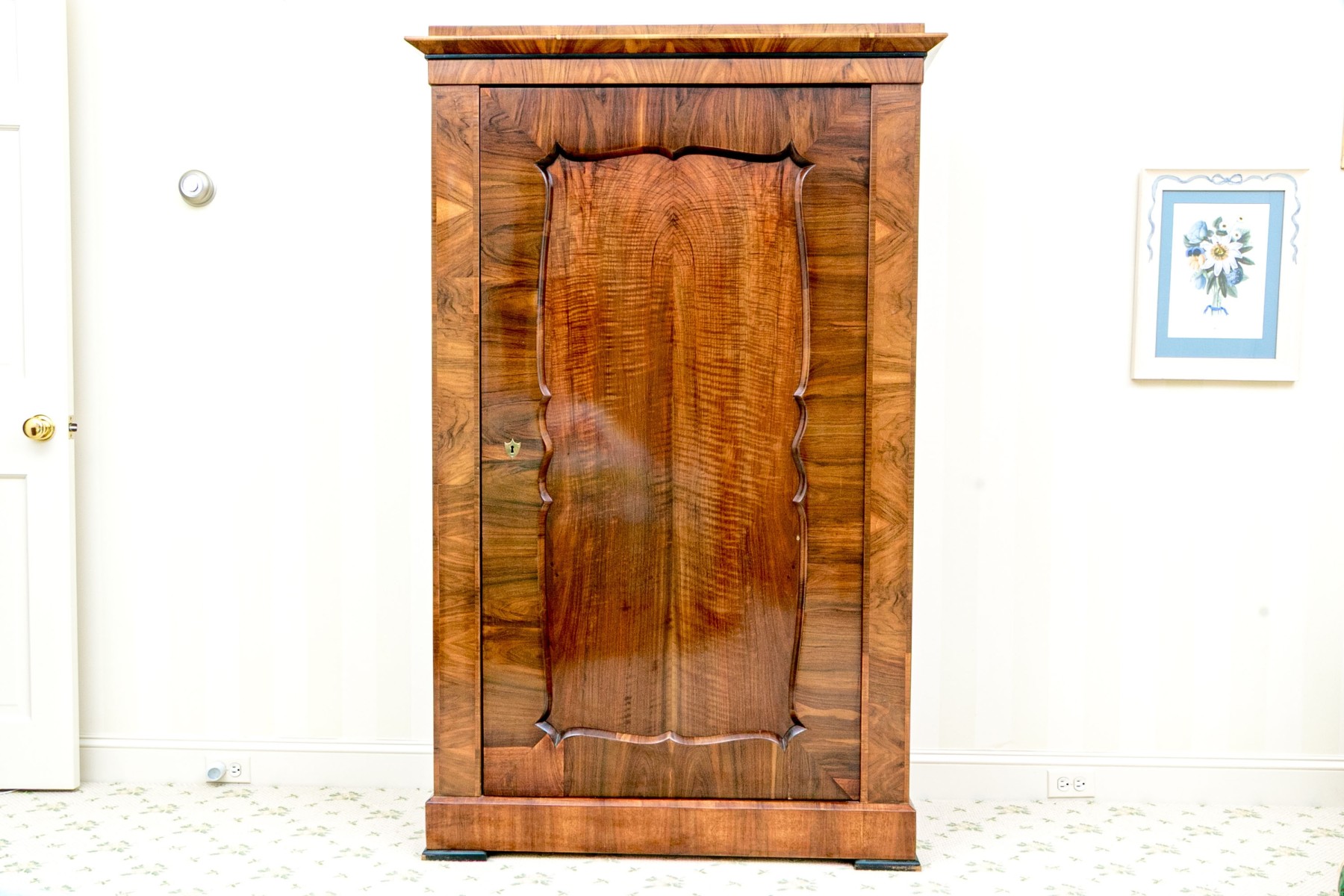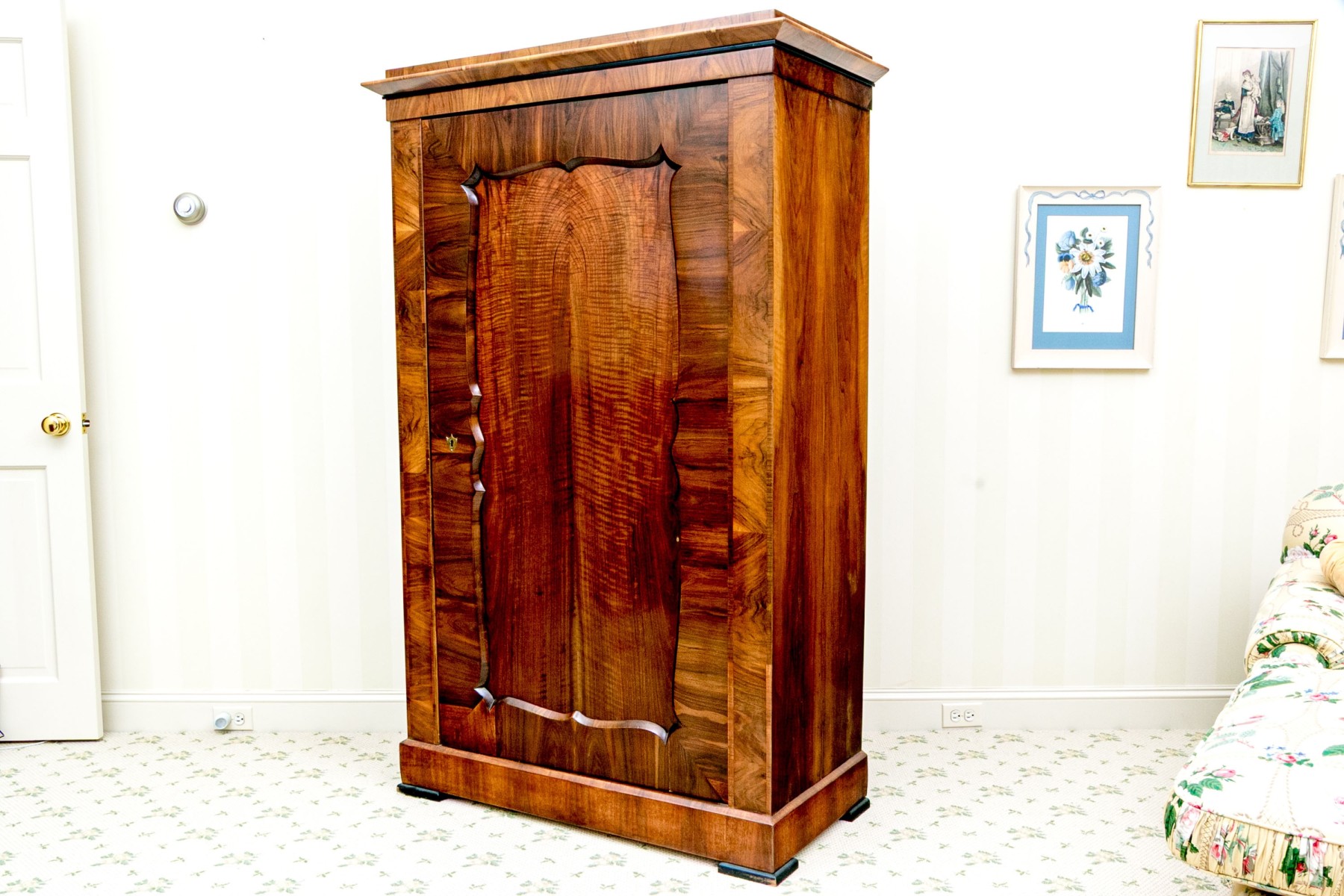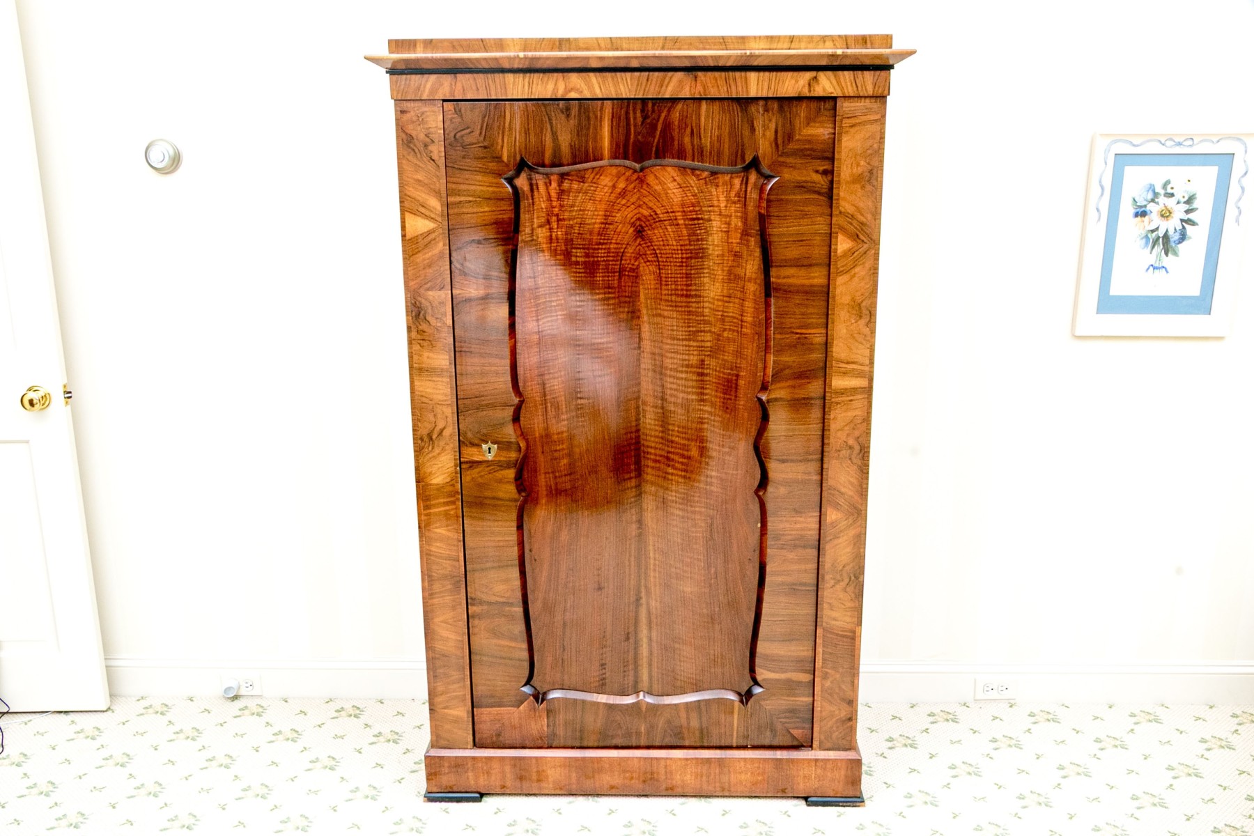An excellent Biedermeier armoire crafted with eye-catching walnut veneers French polished to a highly reflective finish in warm-toned medium brown, showcasing a minimalist rectangular frame with a straight, beveled crown and a large, single door sporting shapely recessed paneling with a brass shield form key escutcheon. The door opens to three wood shelves within against a backboard with beautiful knotty details. Raised on stout, ebonized bracket feet for a nice touch of contrast.