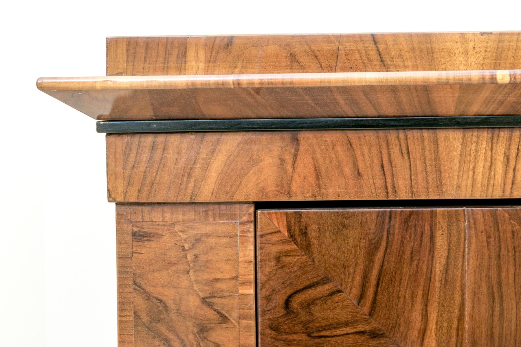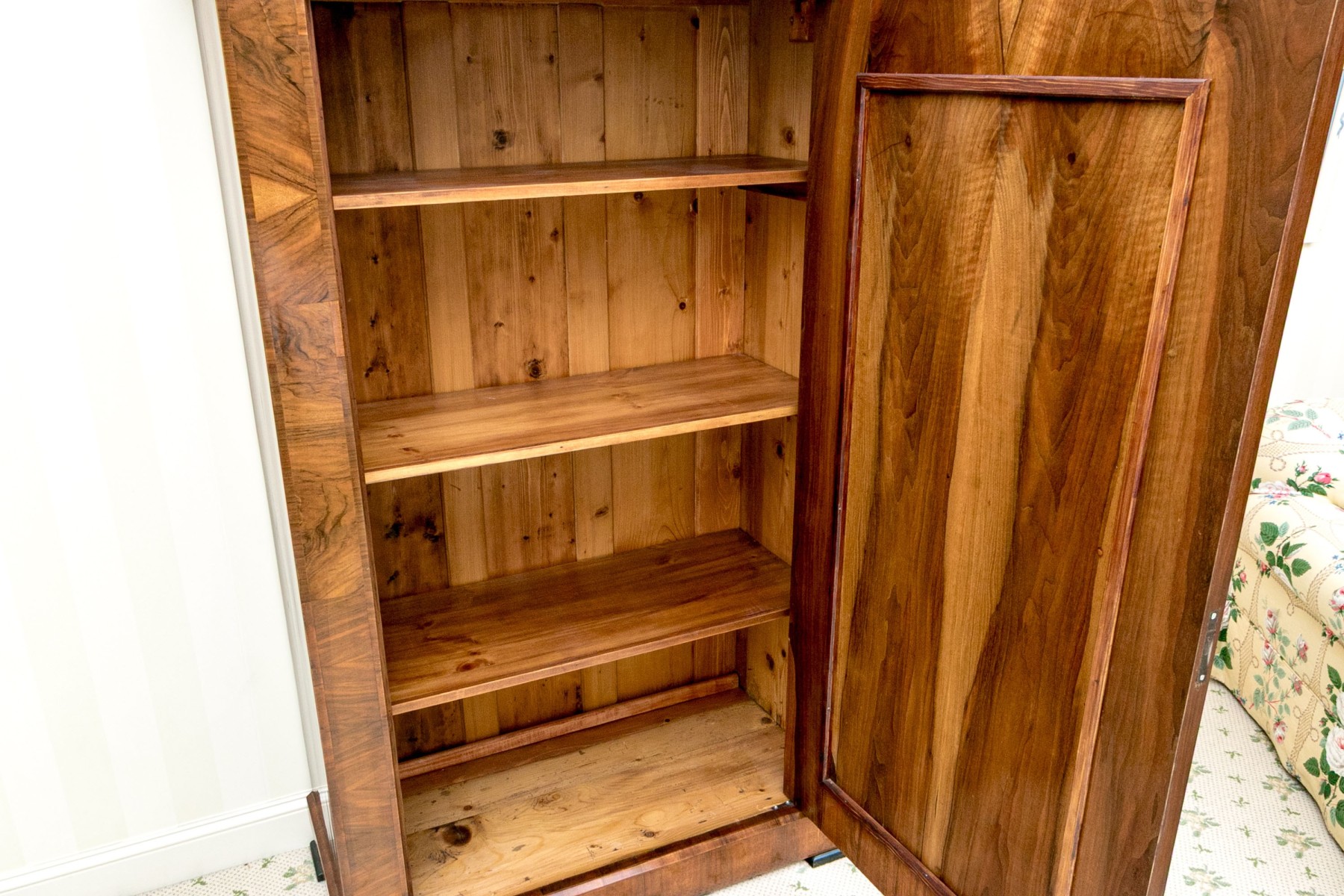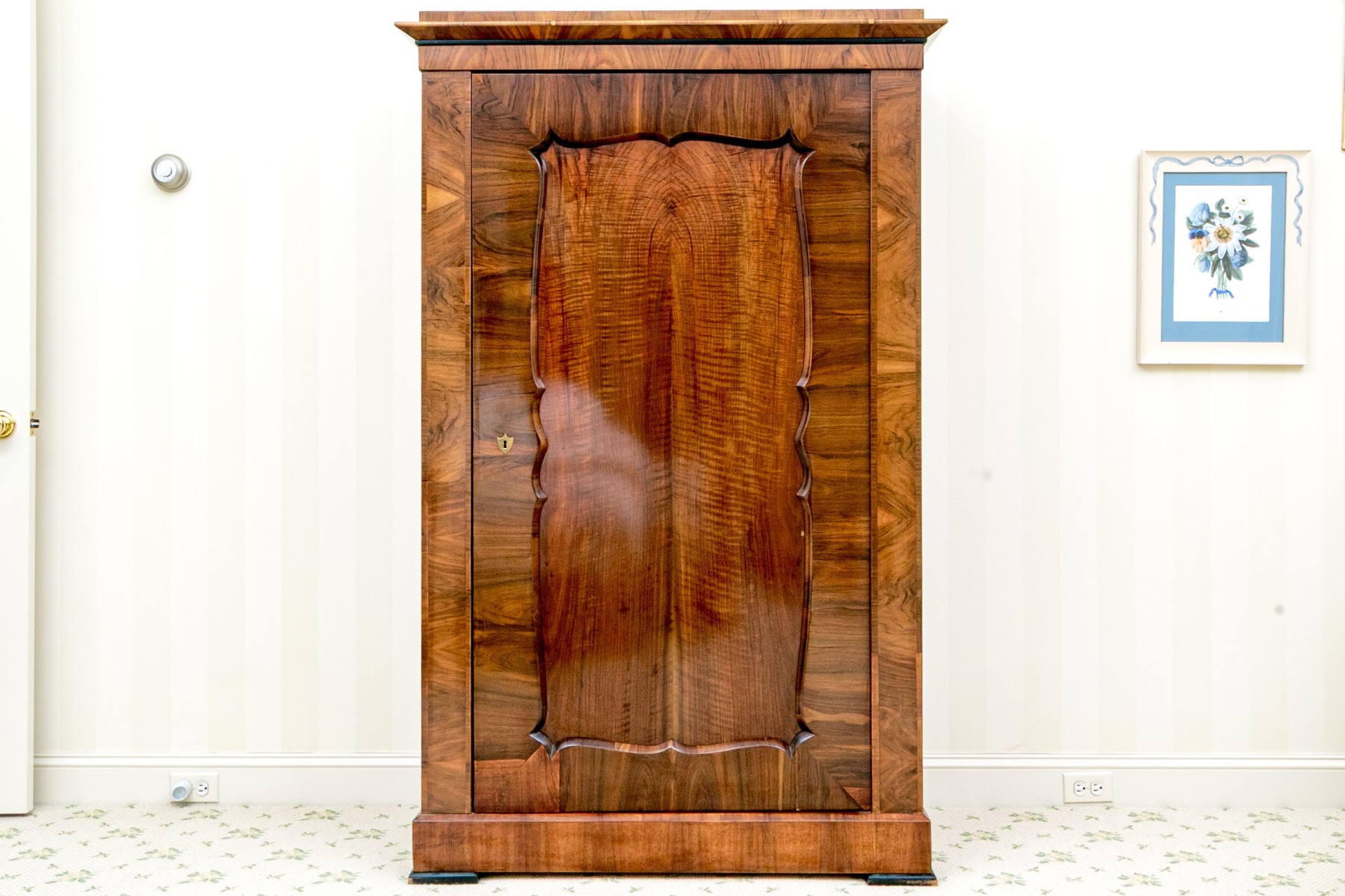 An excellent Biedermeier armoire crafted with eye-catching walnut veneers French polished to a highly reflective finish in warm-toned medium brown, showcasing a minimalist rectangular frame with a straight, beveled crown and a large, single door sporting shapely recessed paneling with a brass shield form key escutcheon. The door opens to three wood shelves within against a backboard with beautiful knotty details. Raised on stout, ebonized bracket feet for a nice touch of contrast.