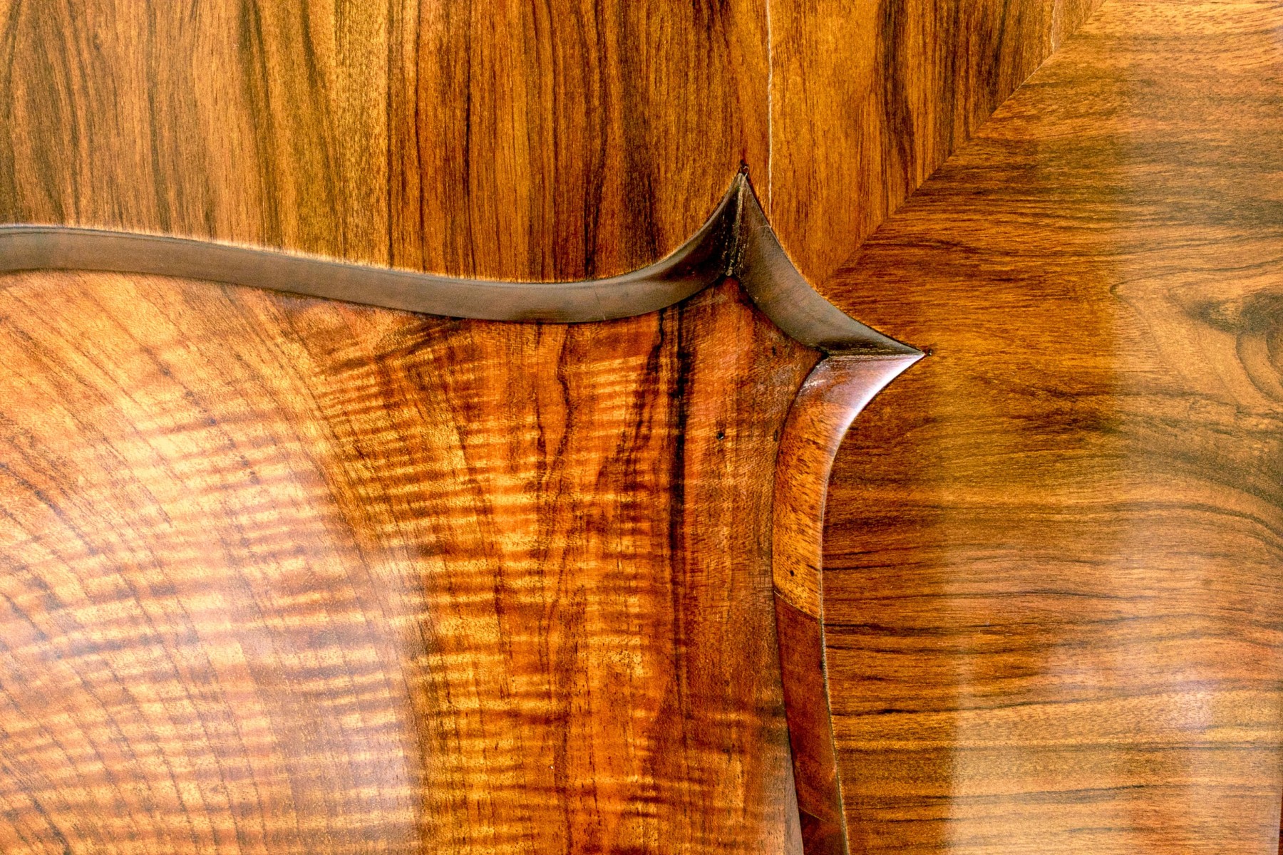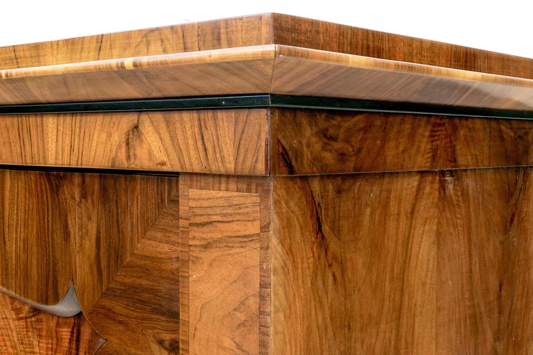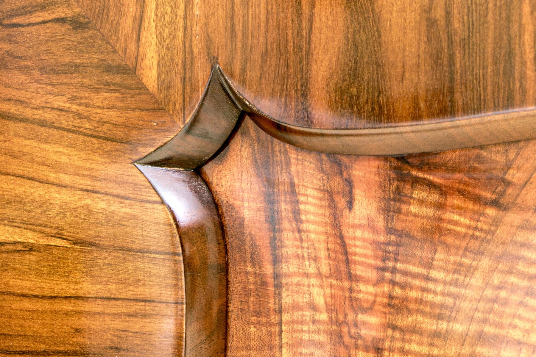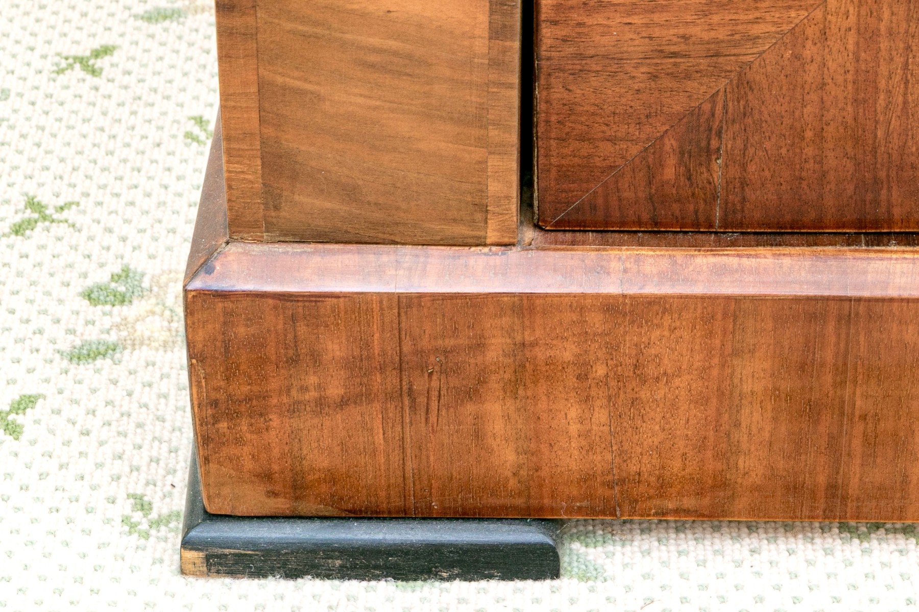 Nicely polished with no veneer losses. The veneer has areas of lighter coloring that may look like losses but are not. Minor finish wear to the feet. Overall a very handsome piece.