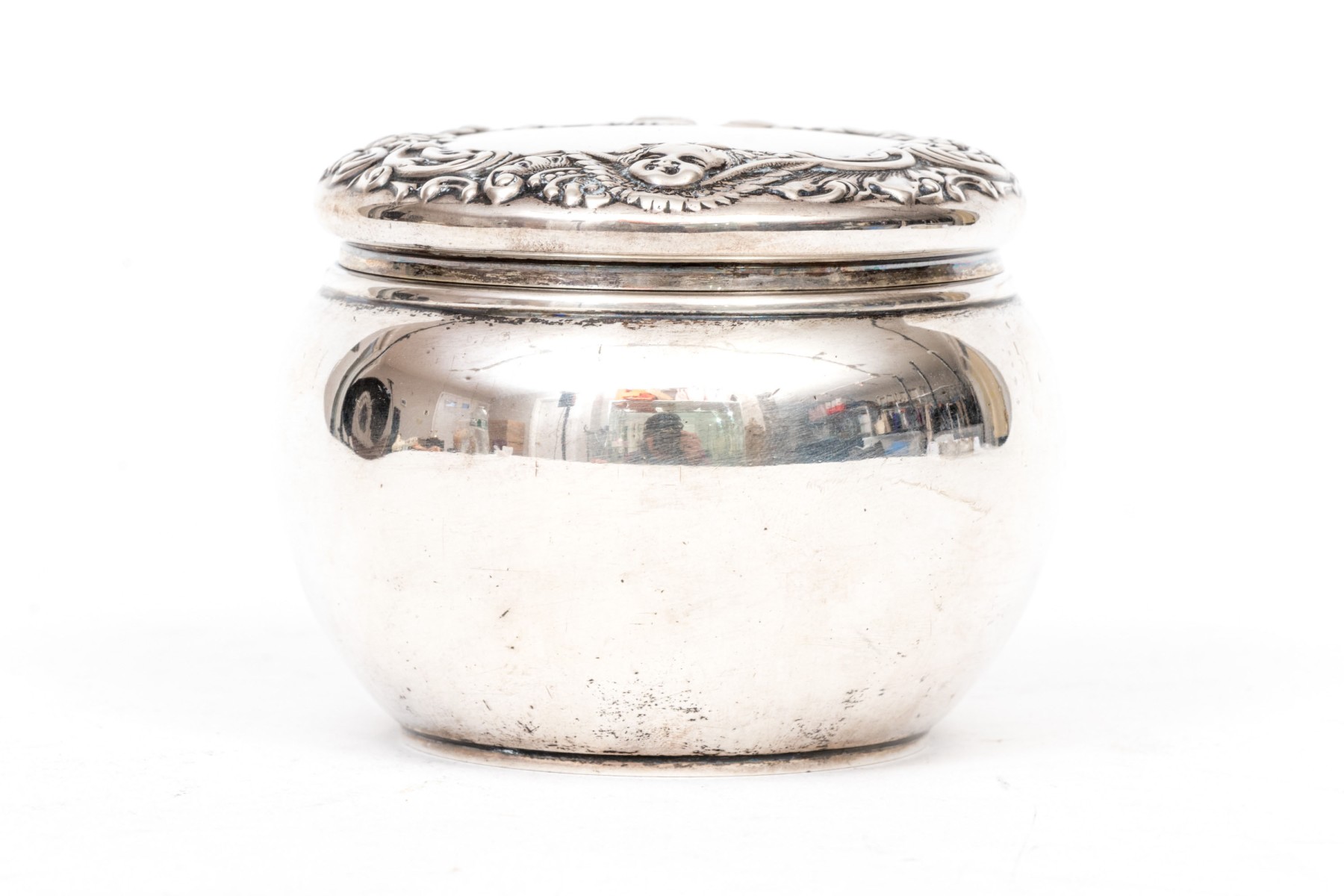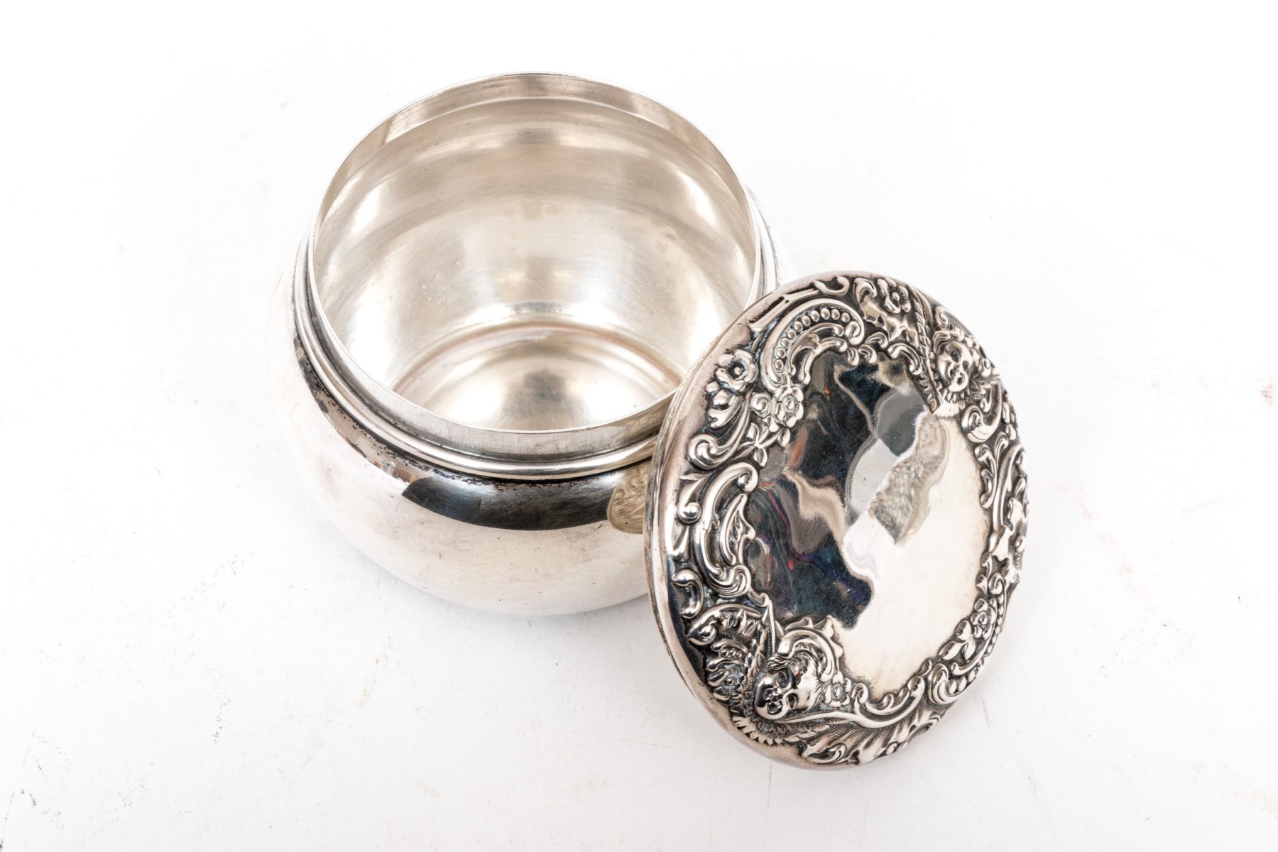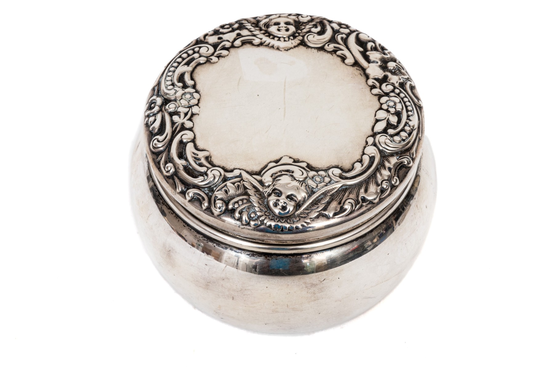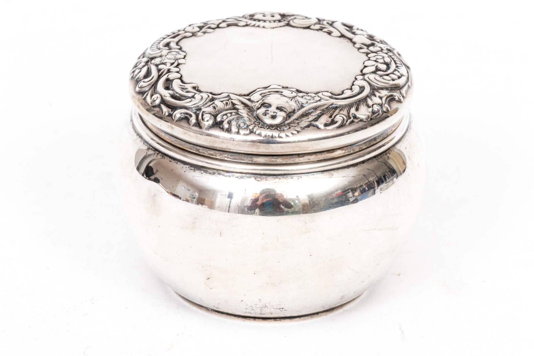 Bigelow & Kennard beautiful antique sterling silver powder jar, cherub motifs