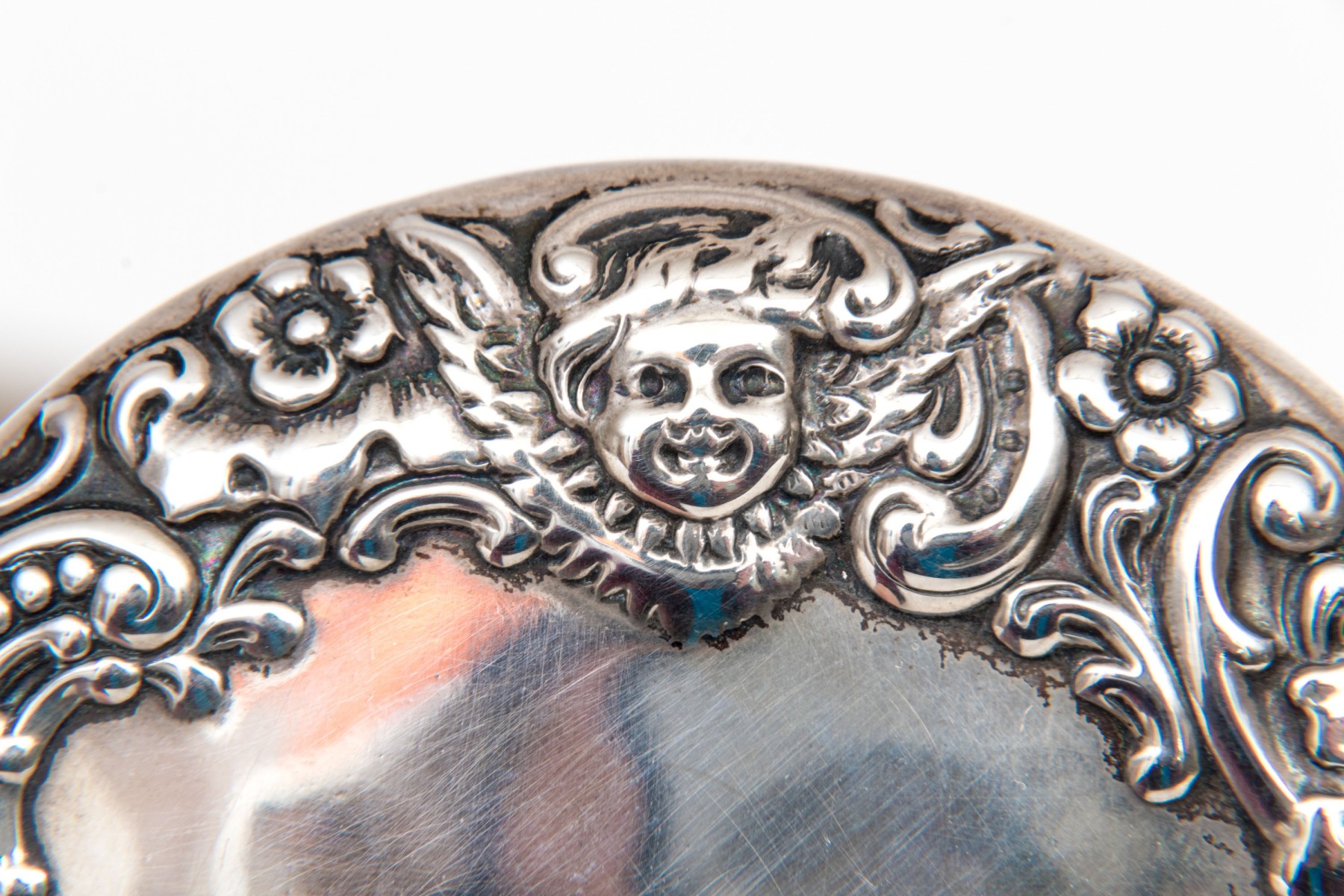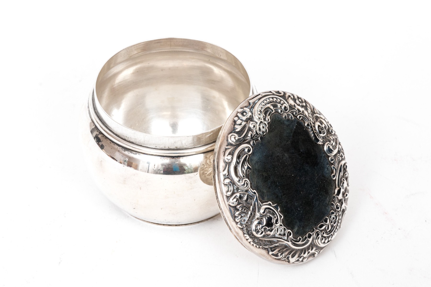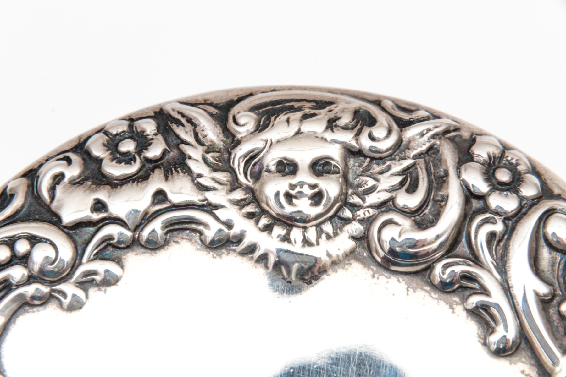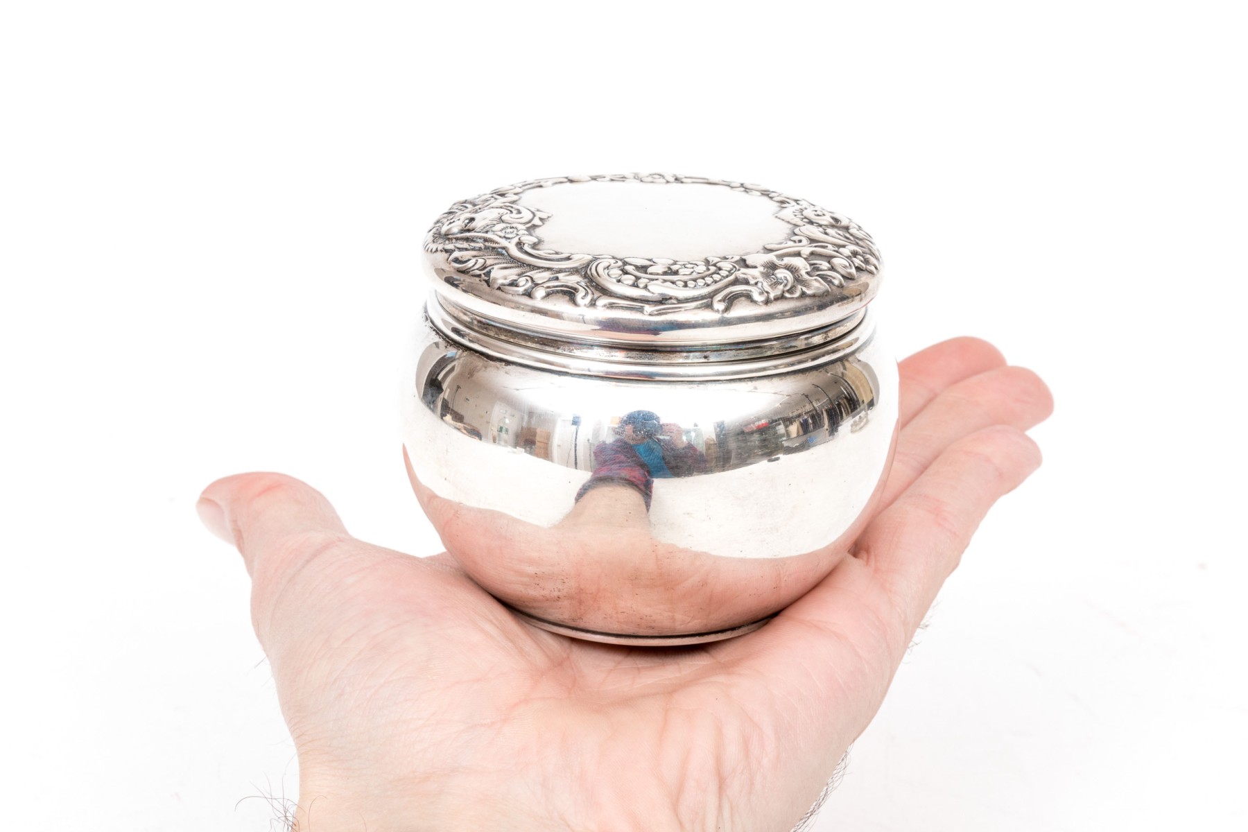 Bigelow & Kennard beautiful antique sterling silver powder jar, cherub motifs
