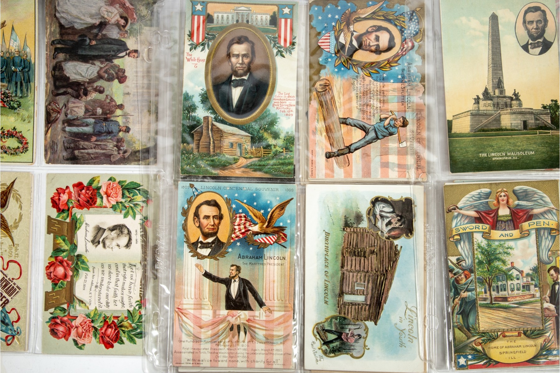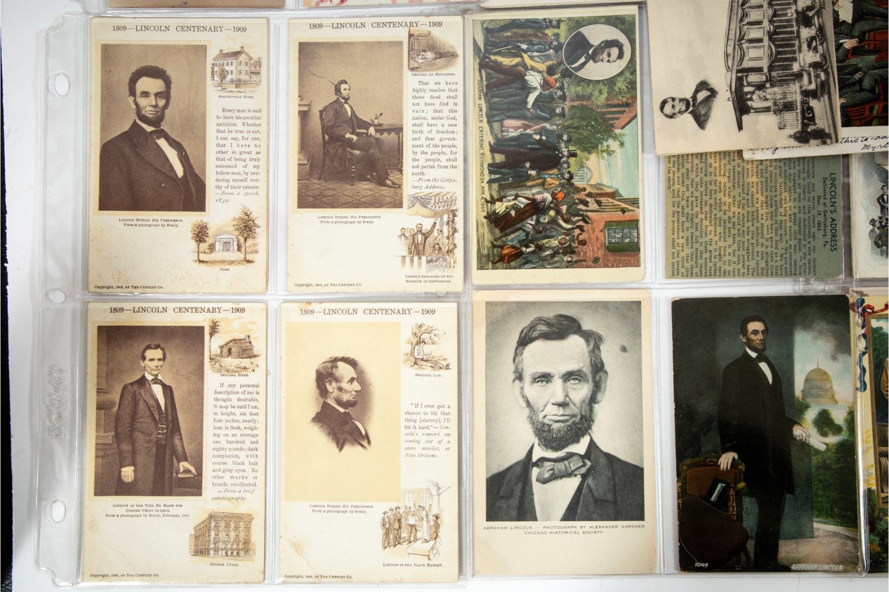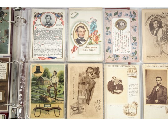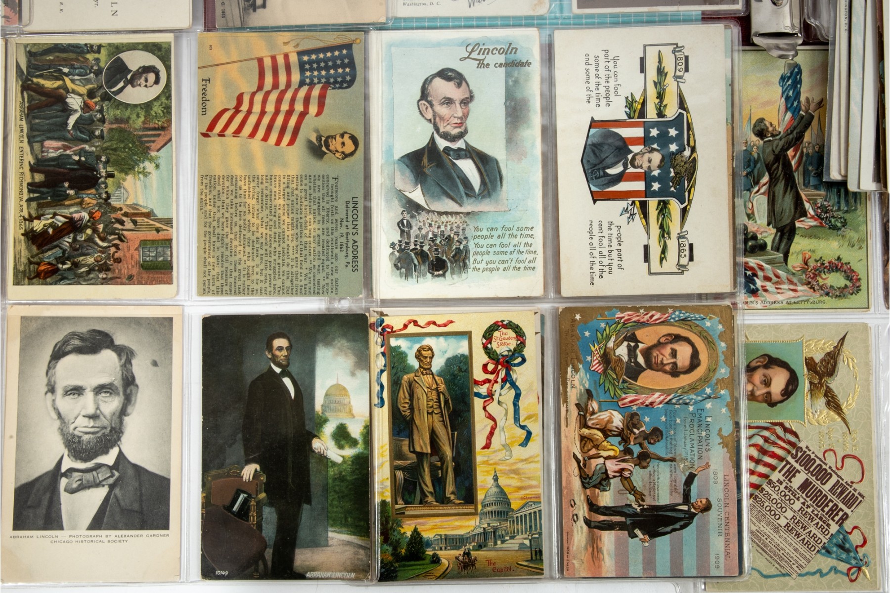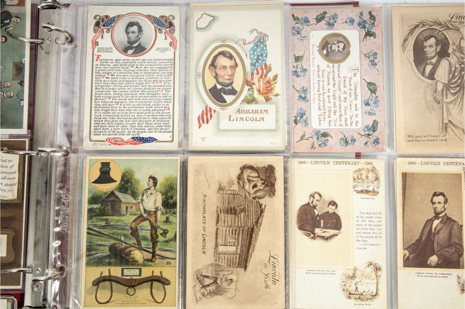 This binder contains a historic collection of Abraham Lincoln themed postcards, all of which feature unique illustrations, engravings, and colored variants. Contents as shown, see photos for details.