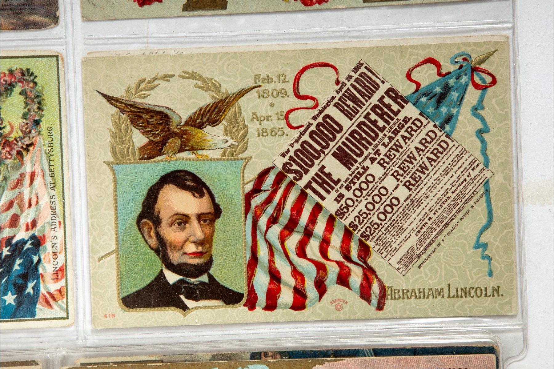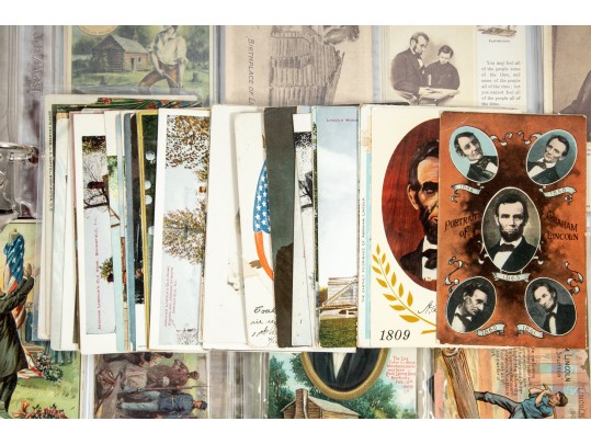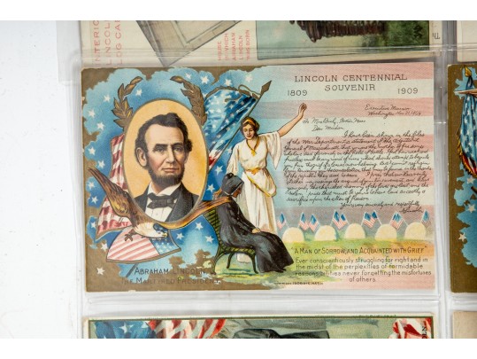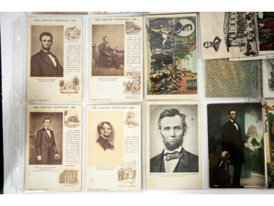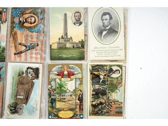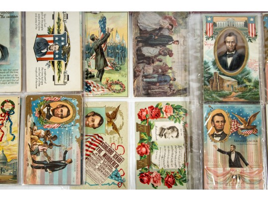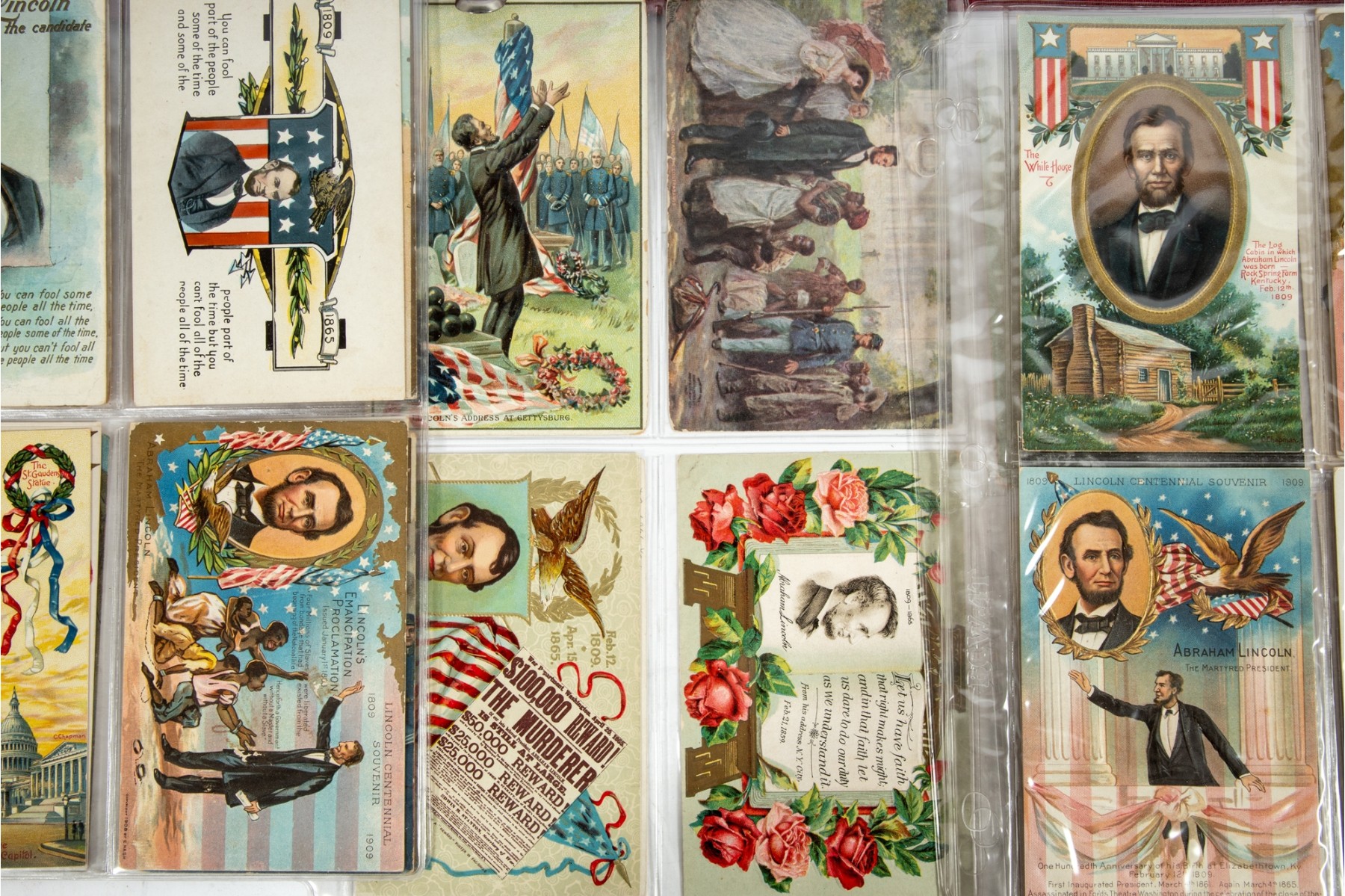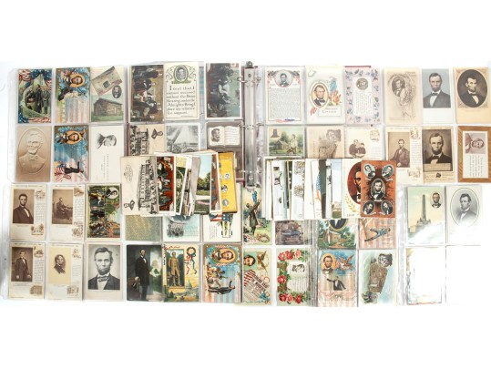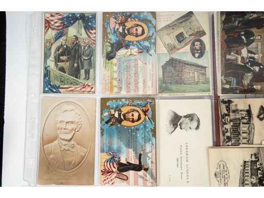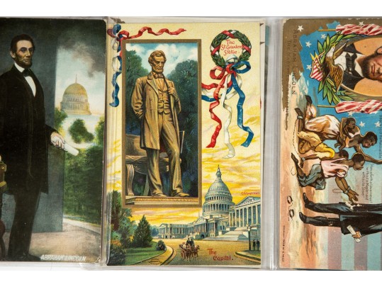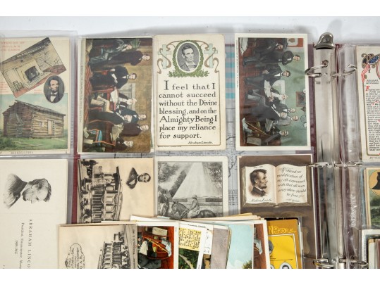 This binder contains a historic collection of Abraham Lincoln themed postcards, all of which feature unique illustrations, engravings, and colored variants. Contents as shown, see photos for details.