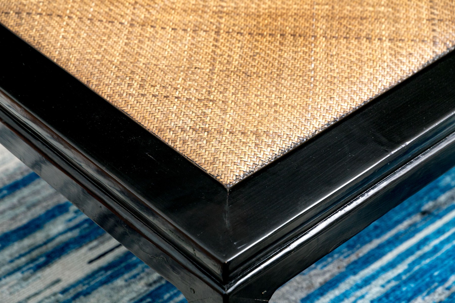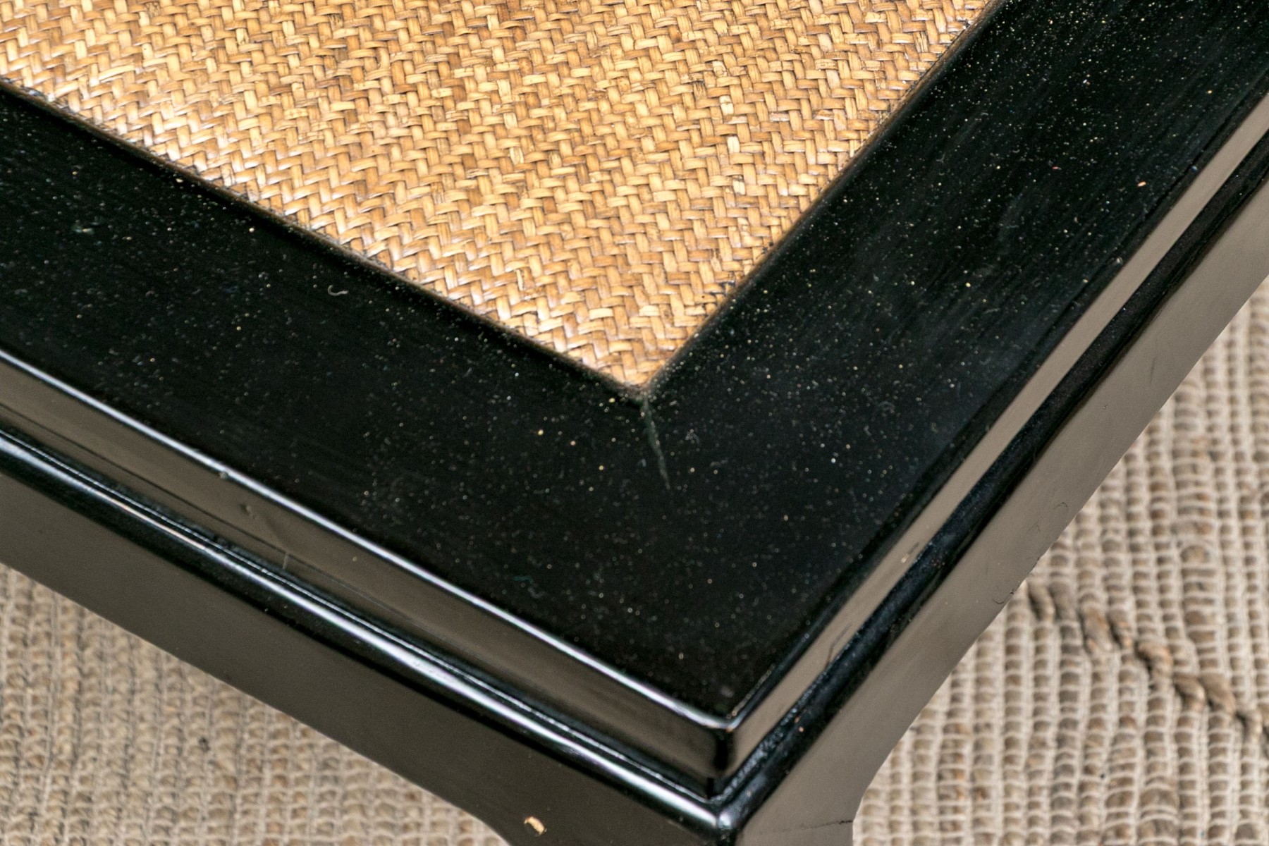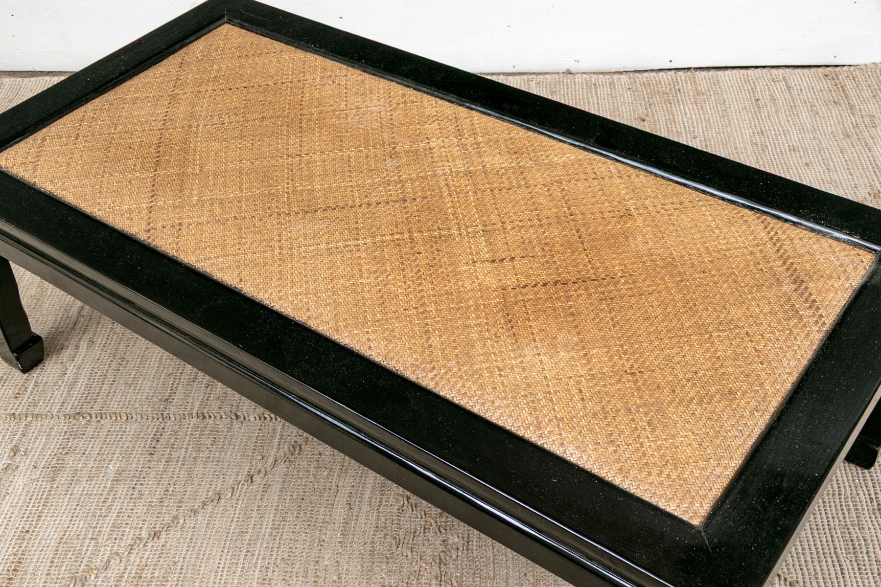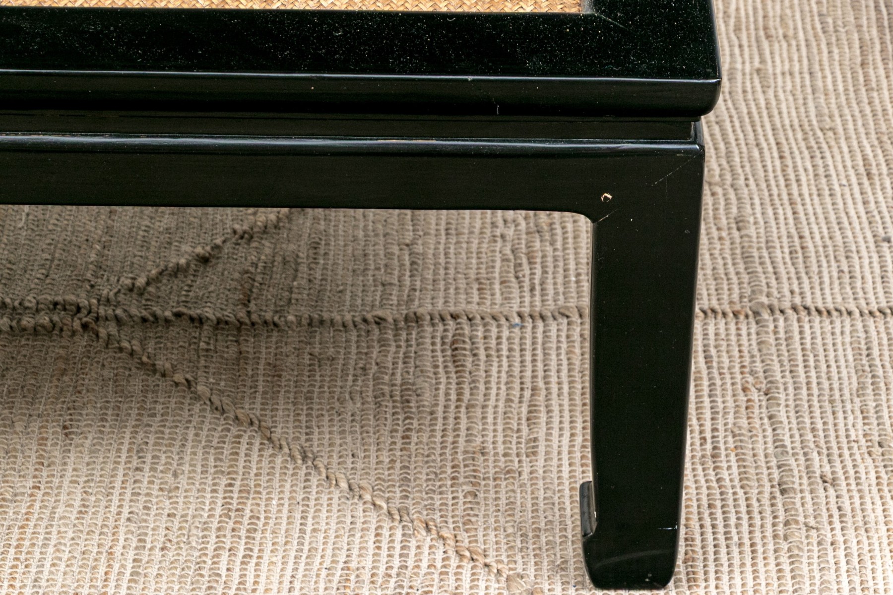 An elegant rectangular Chinese low table in black lacquer with a caned top and classic Chinese incurved legs.