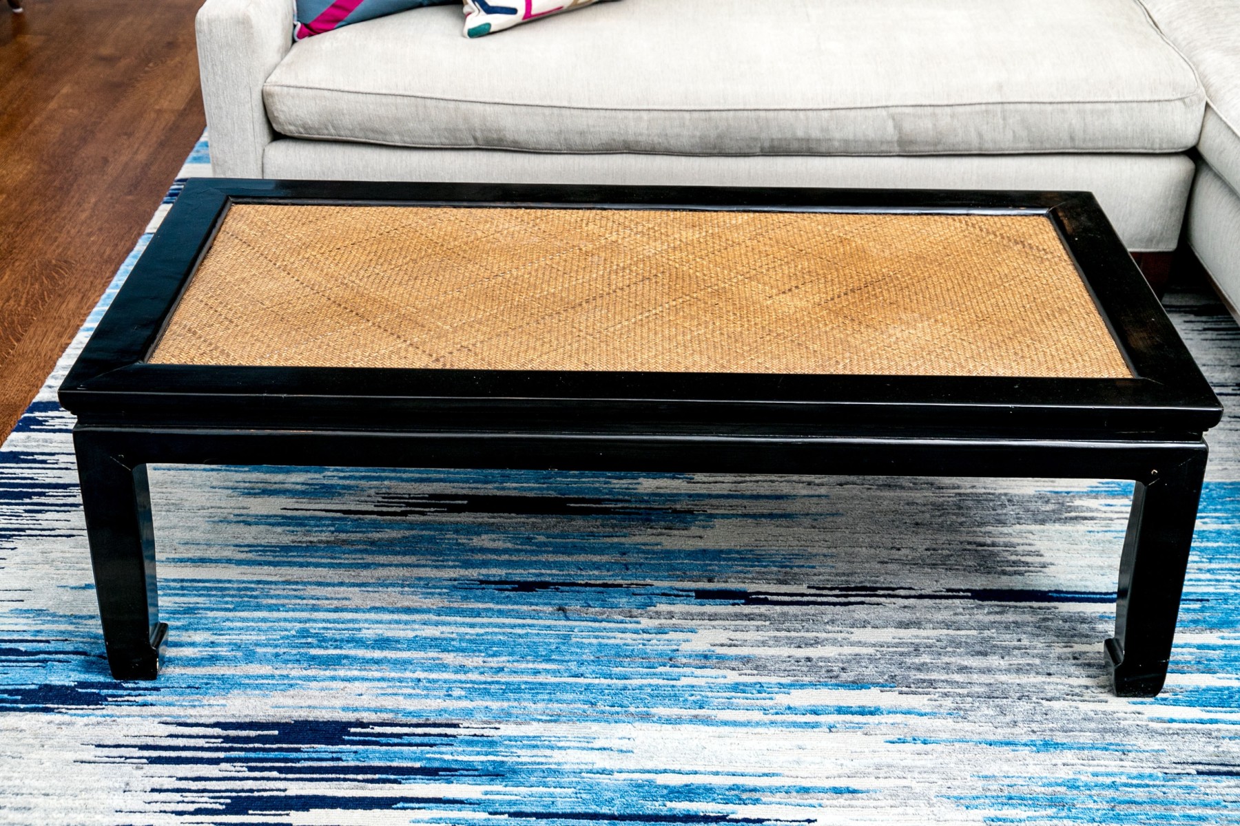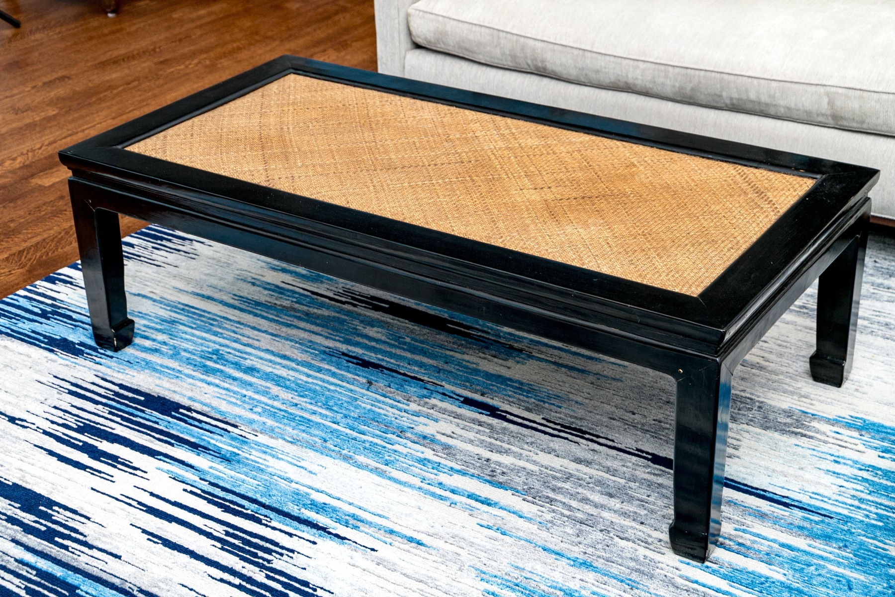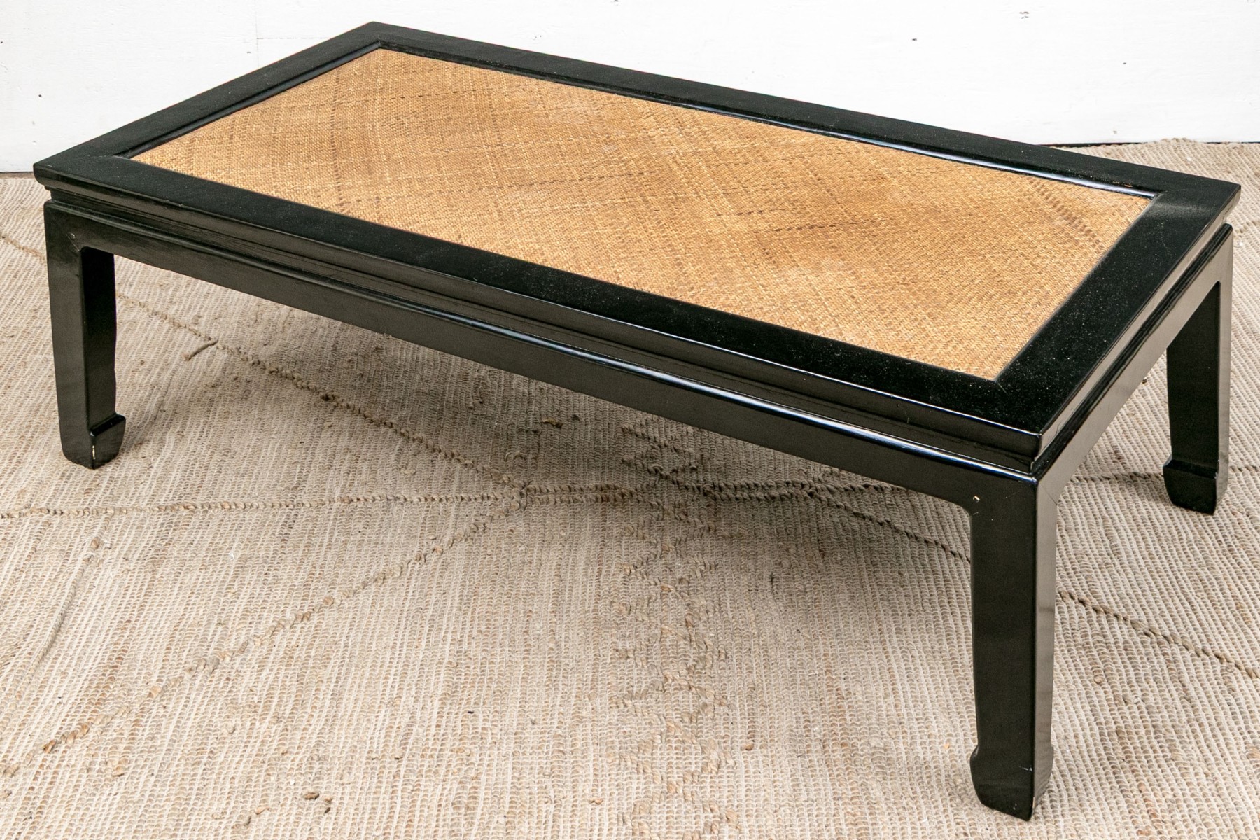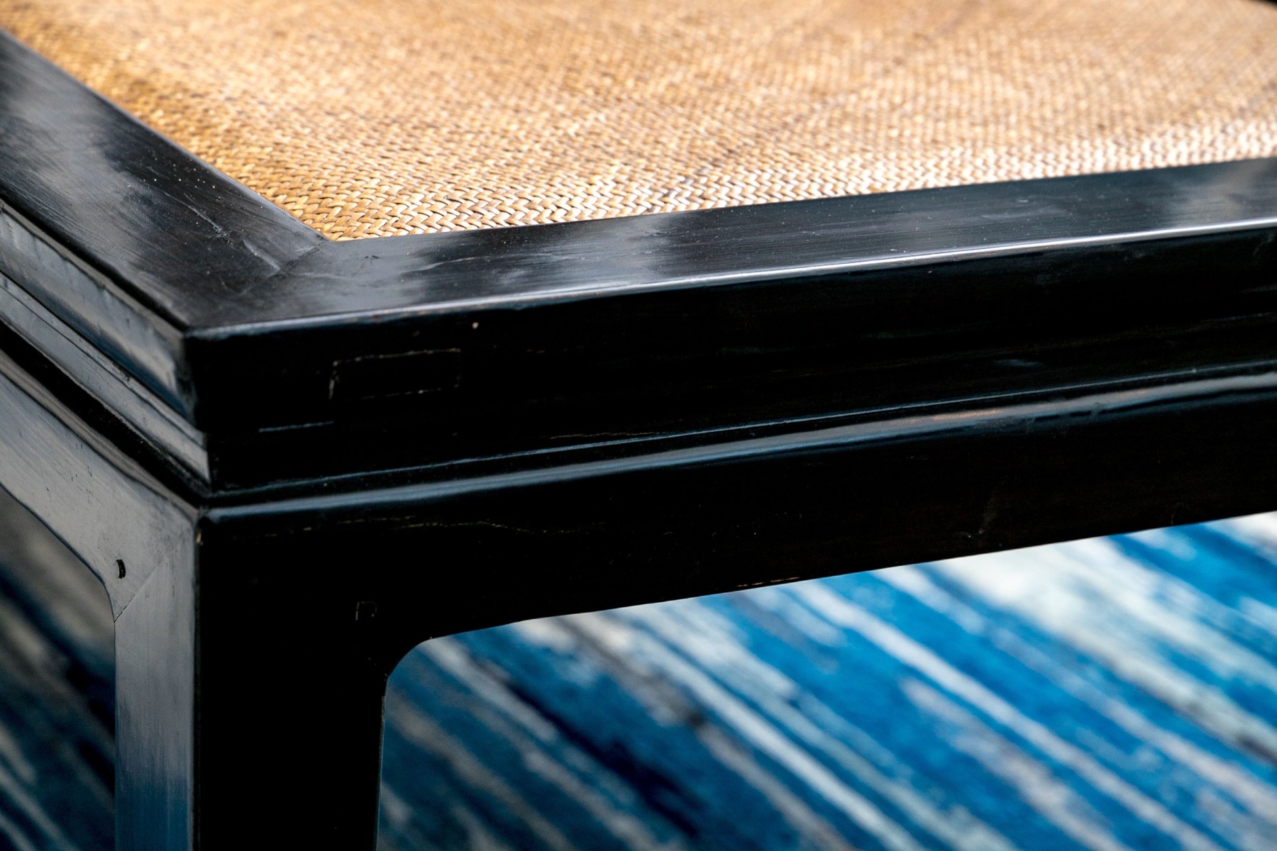 An elegant rectangular Chinese low table in black lacquer with a caned top and classic Chinese incurved legs.