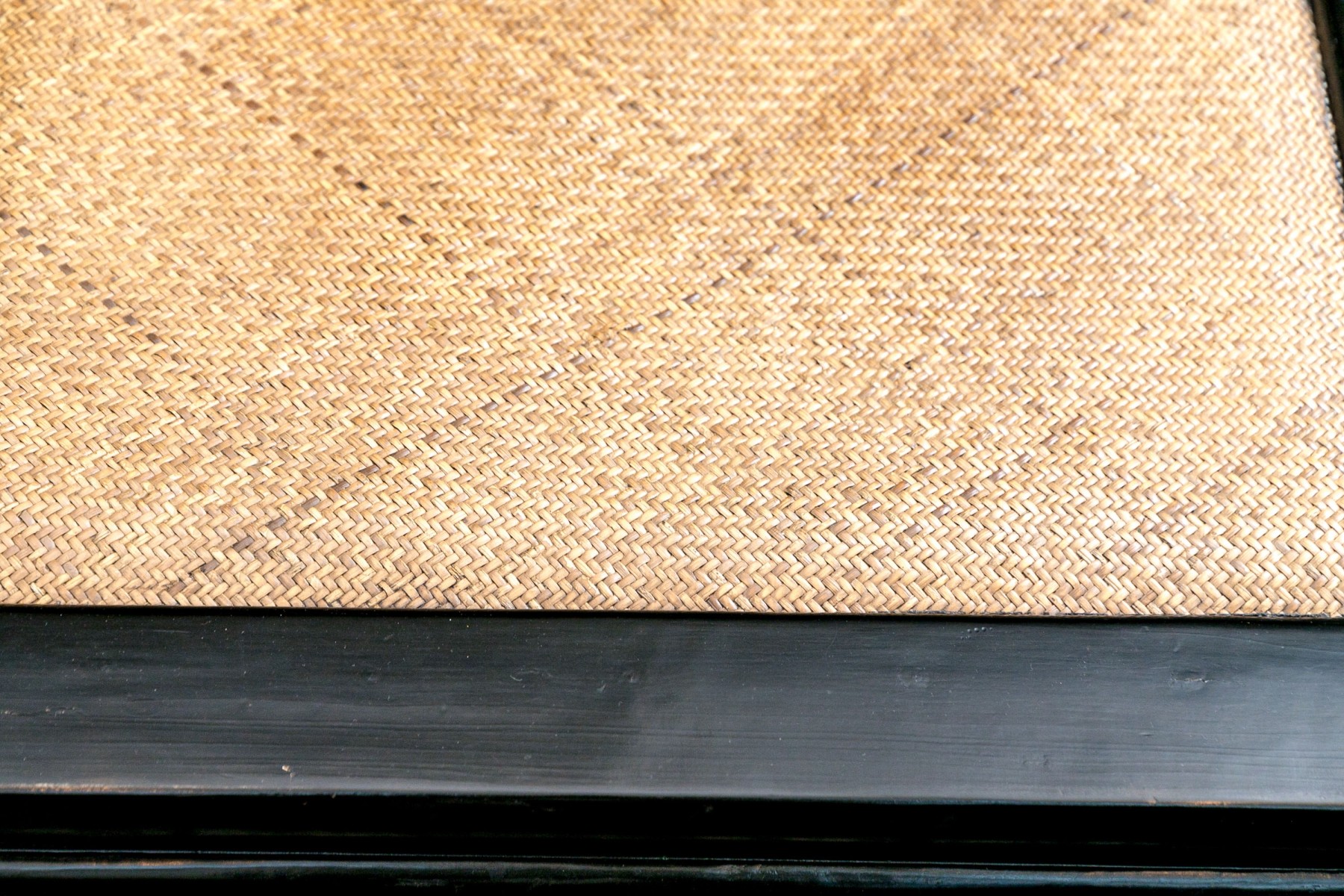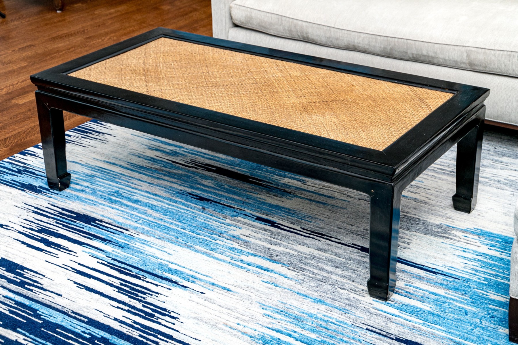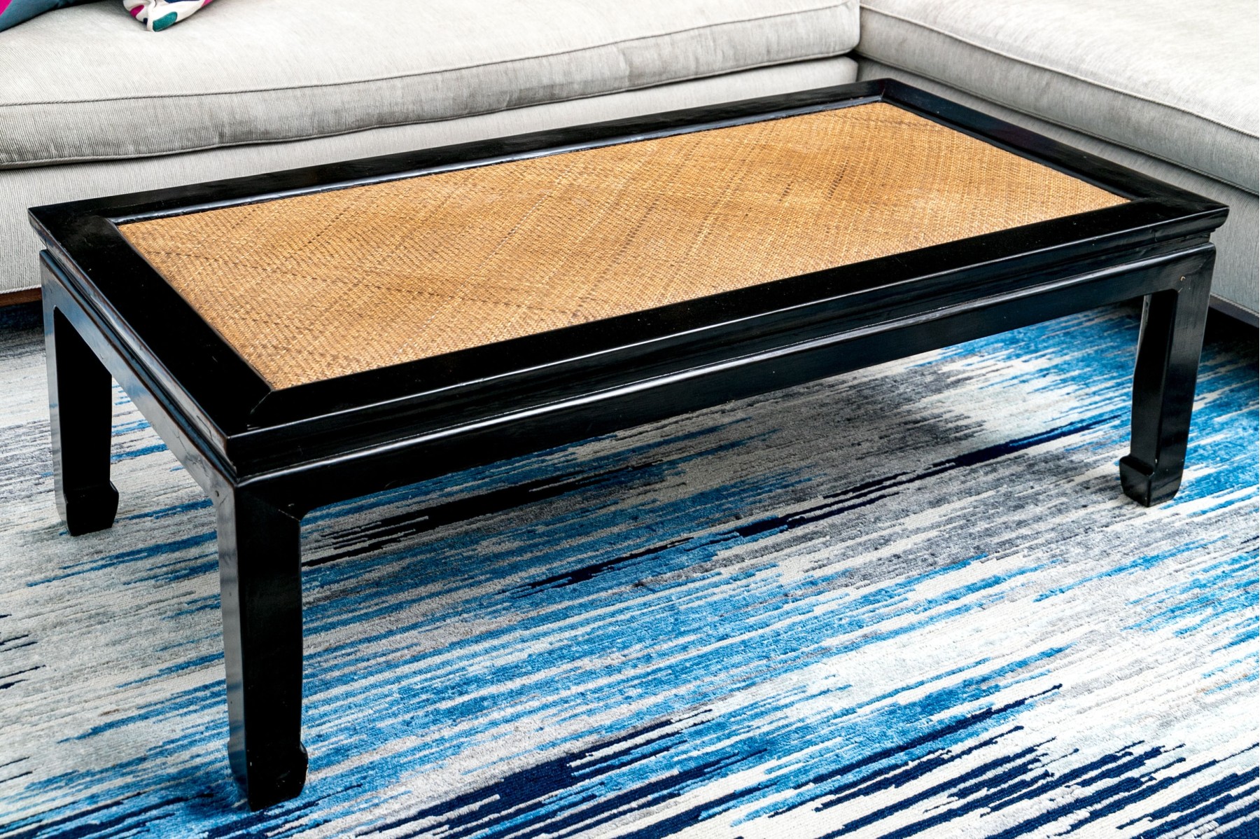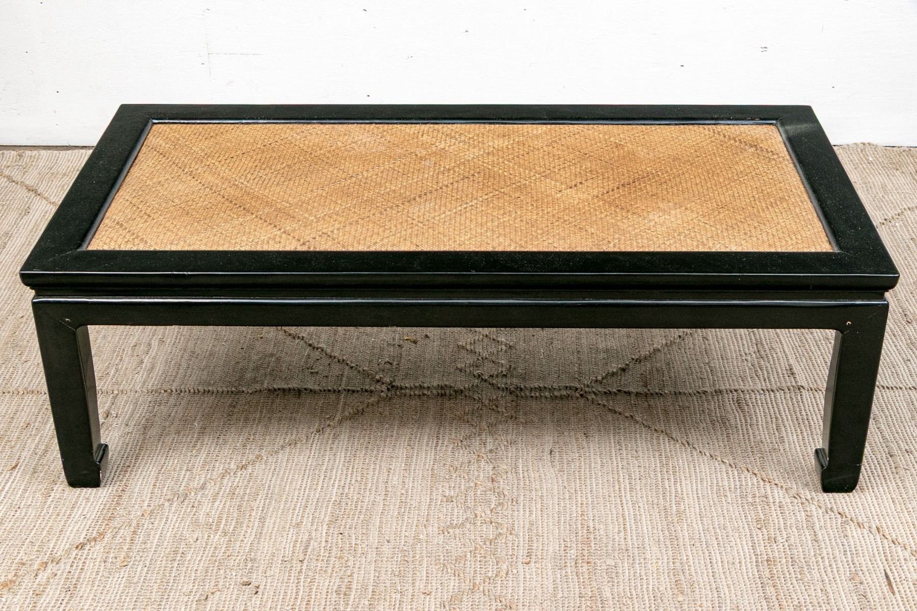 An elegant rectangular Chinese low table in black lacquer with a caned top and classic Chinese incurved legs.