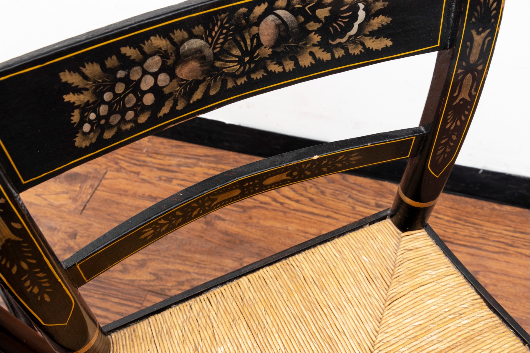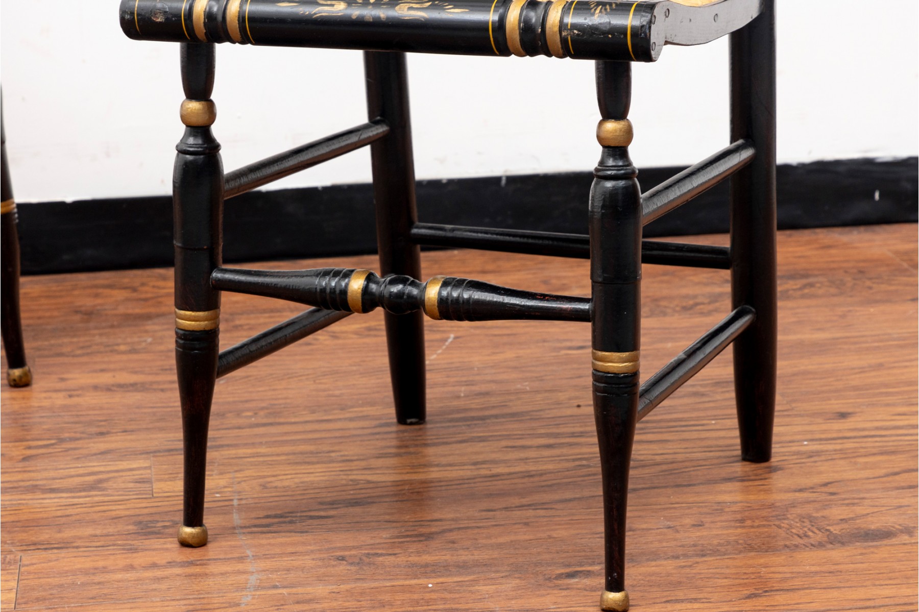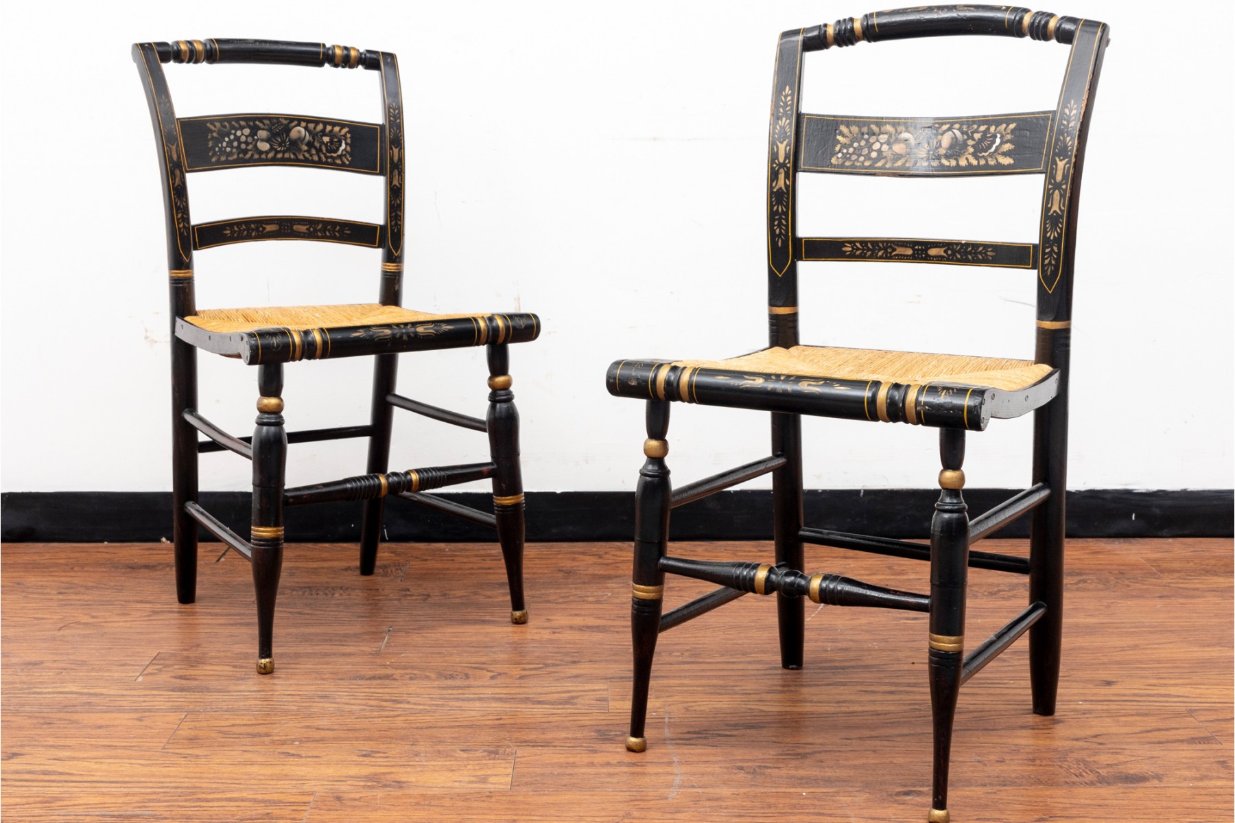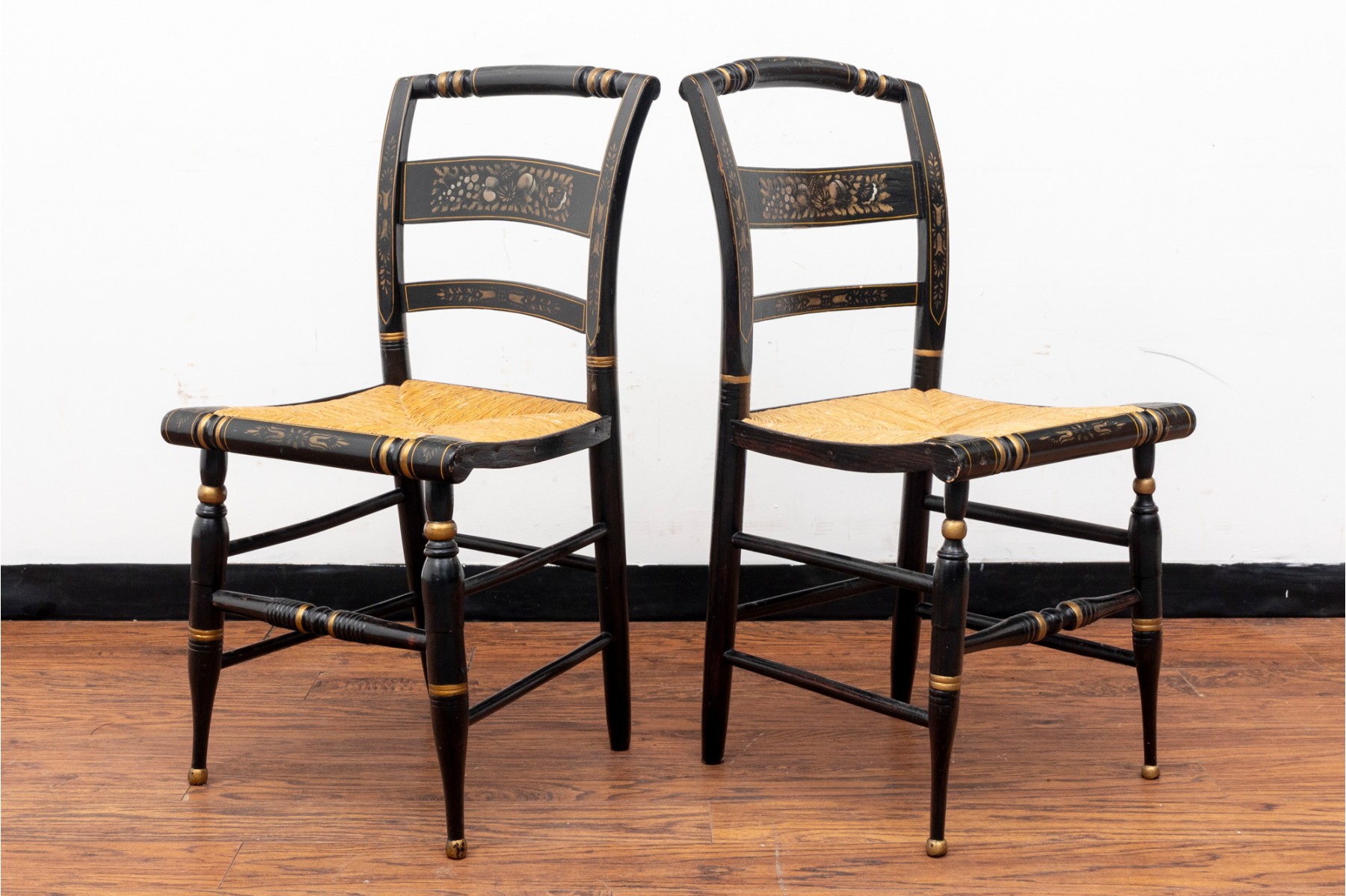 A wonderful duo of chairs, possibly Hitchcock, displaying glossy black lacquered frames and gilt accents. Features gently arched top rails with turned accents near the ears, and ladder-style splats with stenciled fruit motifs. Woven reed seats compliment the warm light brown tones of the gilding, leading to nicely turned legs with a ribbed box stretcher.