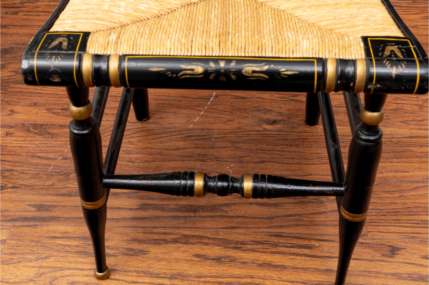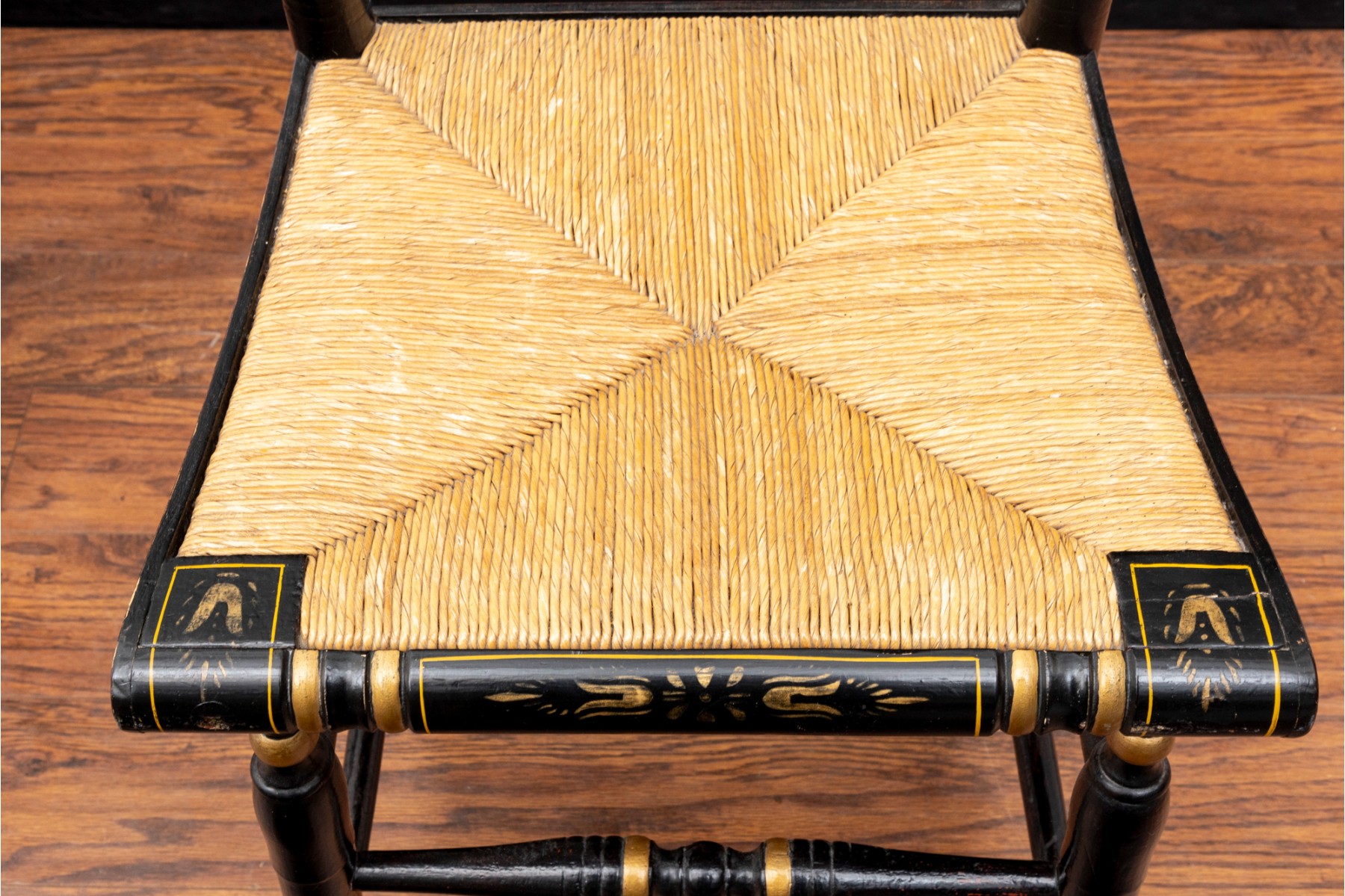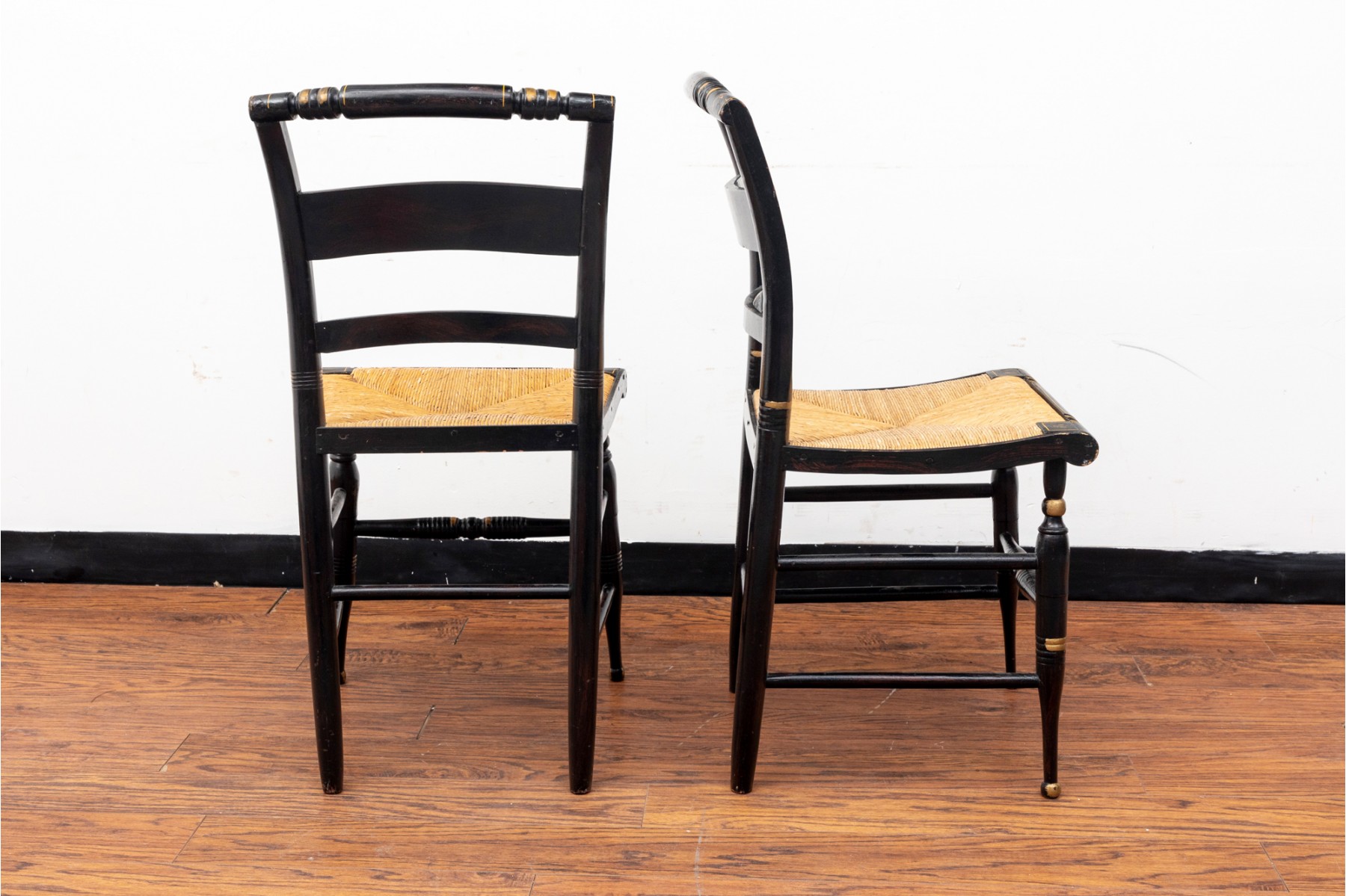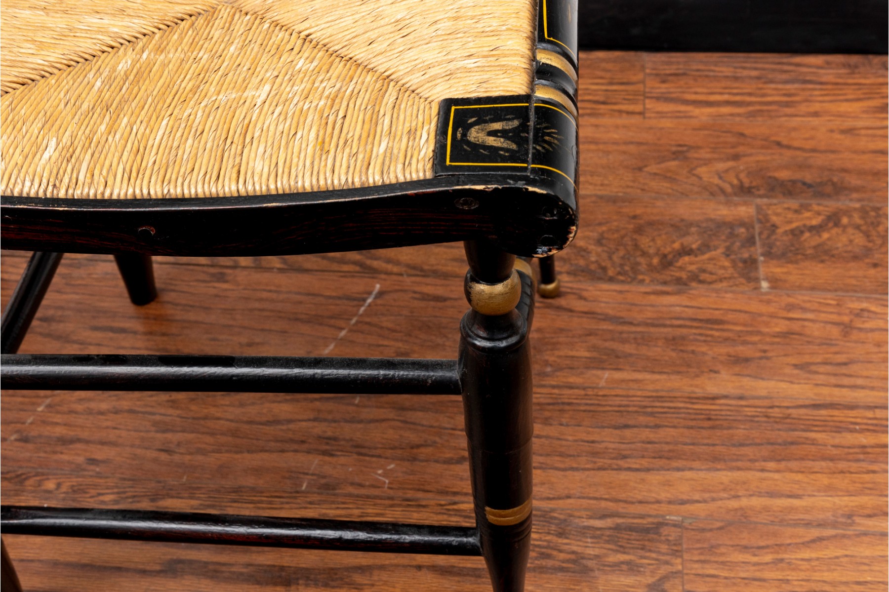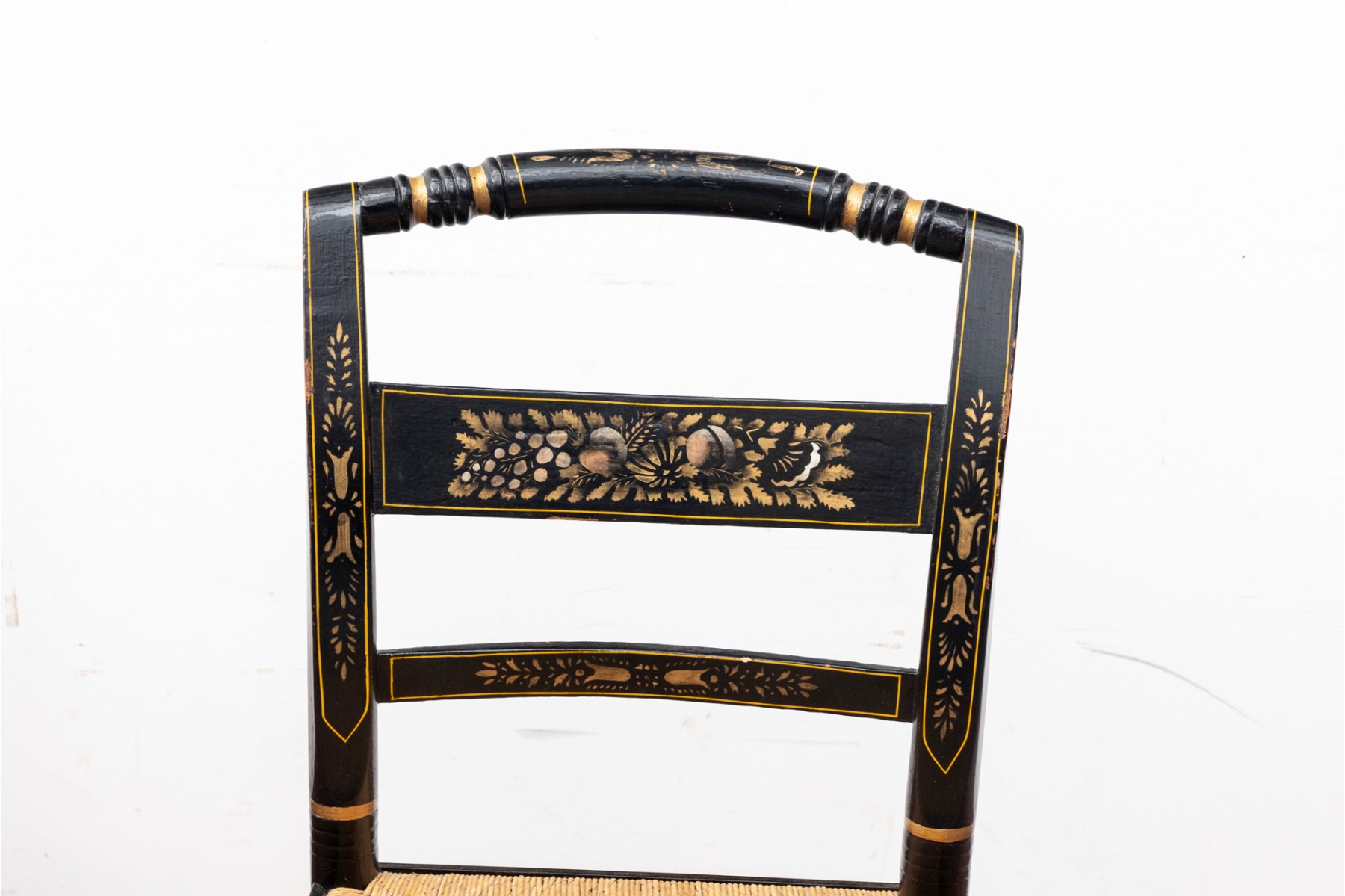 A wonderful duo of chairs, possibly Hitchcock, displaying glossy black lacquered frames and gilt accents. Features gently arched top rails with turned accents near the ears, and ladder-style splats with stenciled fruit motifs. Woven reed seats compliment the warm light brown tones of the gilding, leading to nicely turned legs with a ribbed box stretcher.