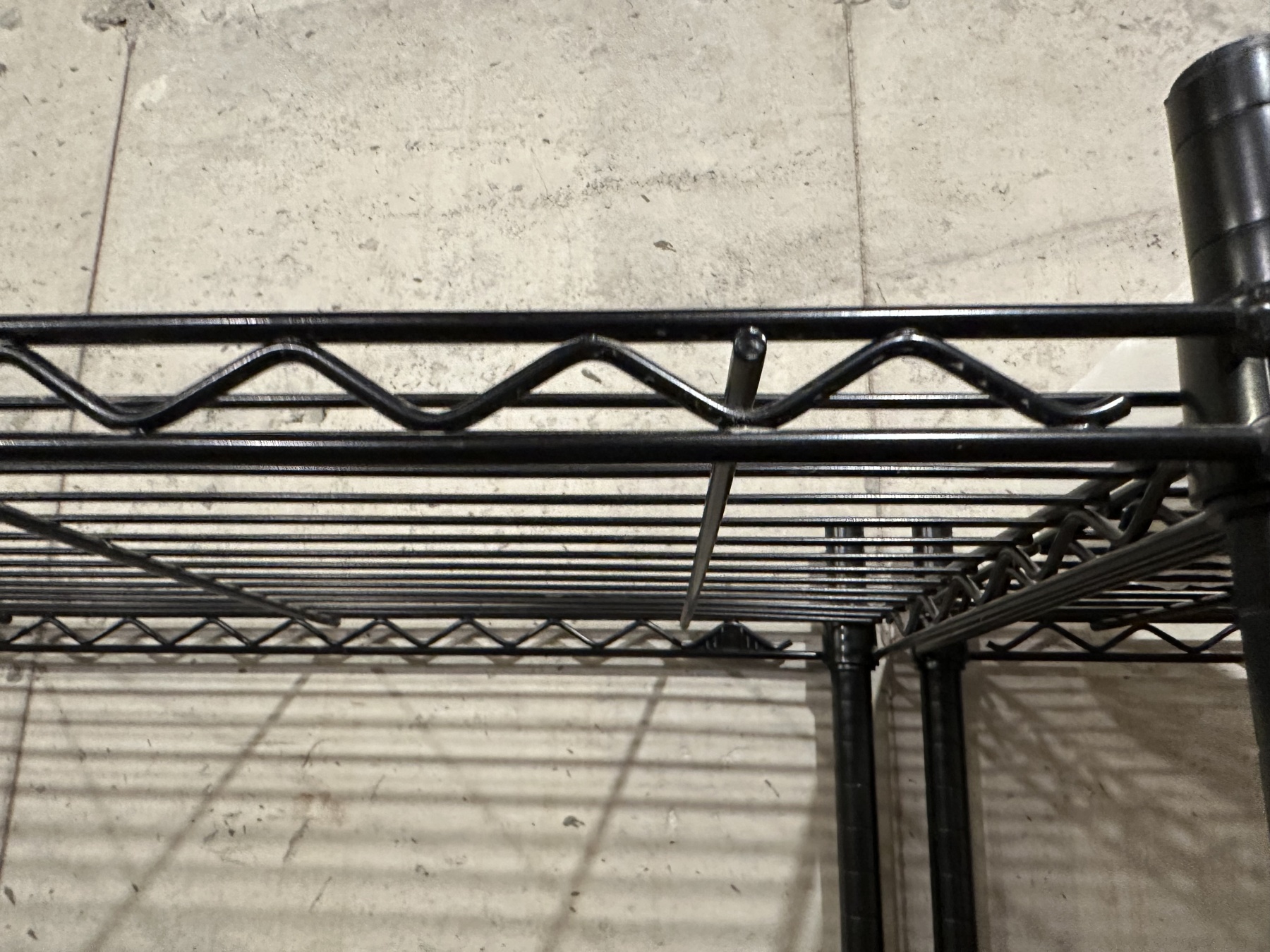 A handy utilitarian shelving unity in black finished metal that can be disassembled for easy mobility and storage. The unit features four adjustable tiers on tall, black posts.