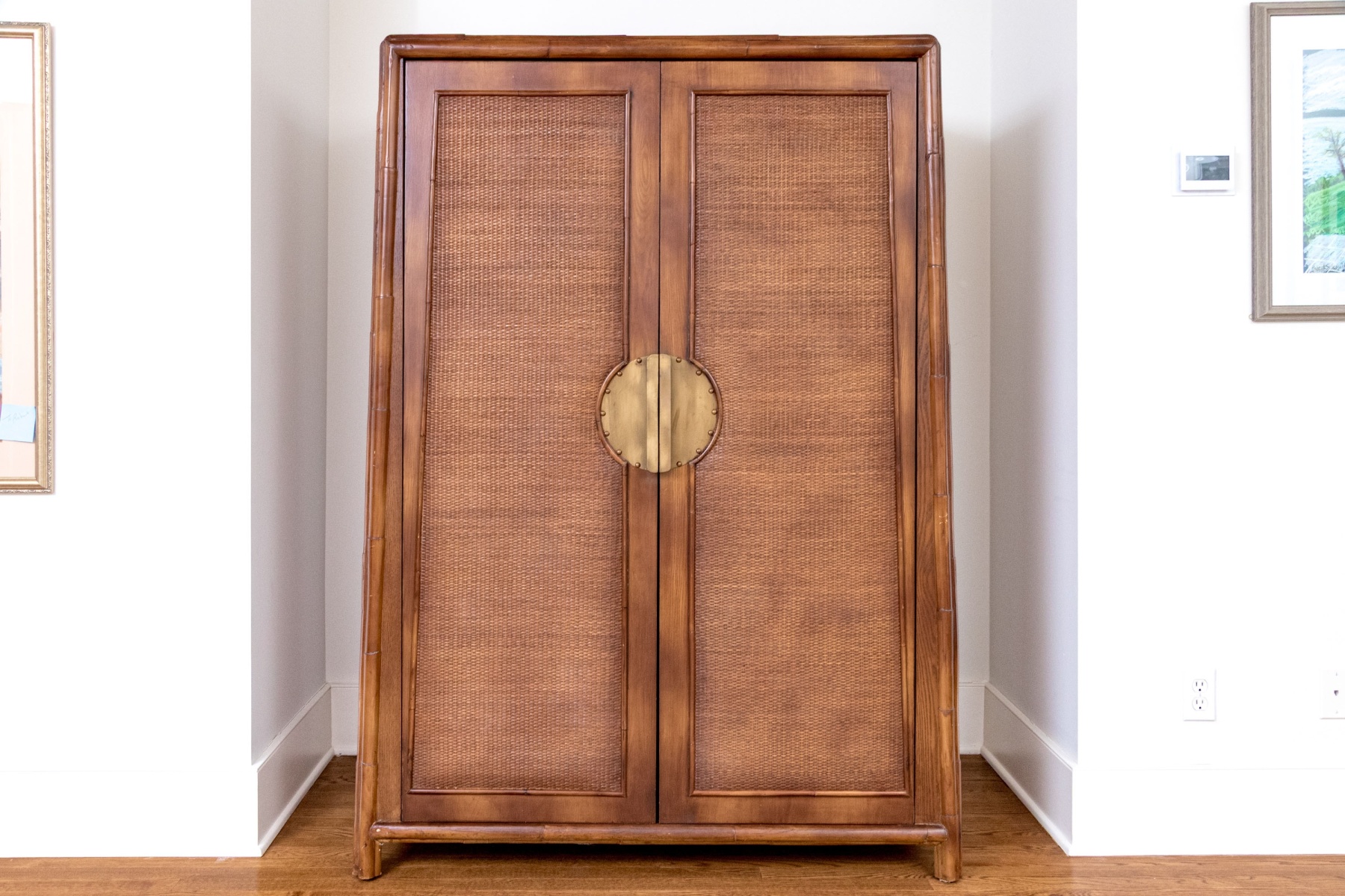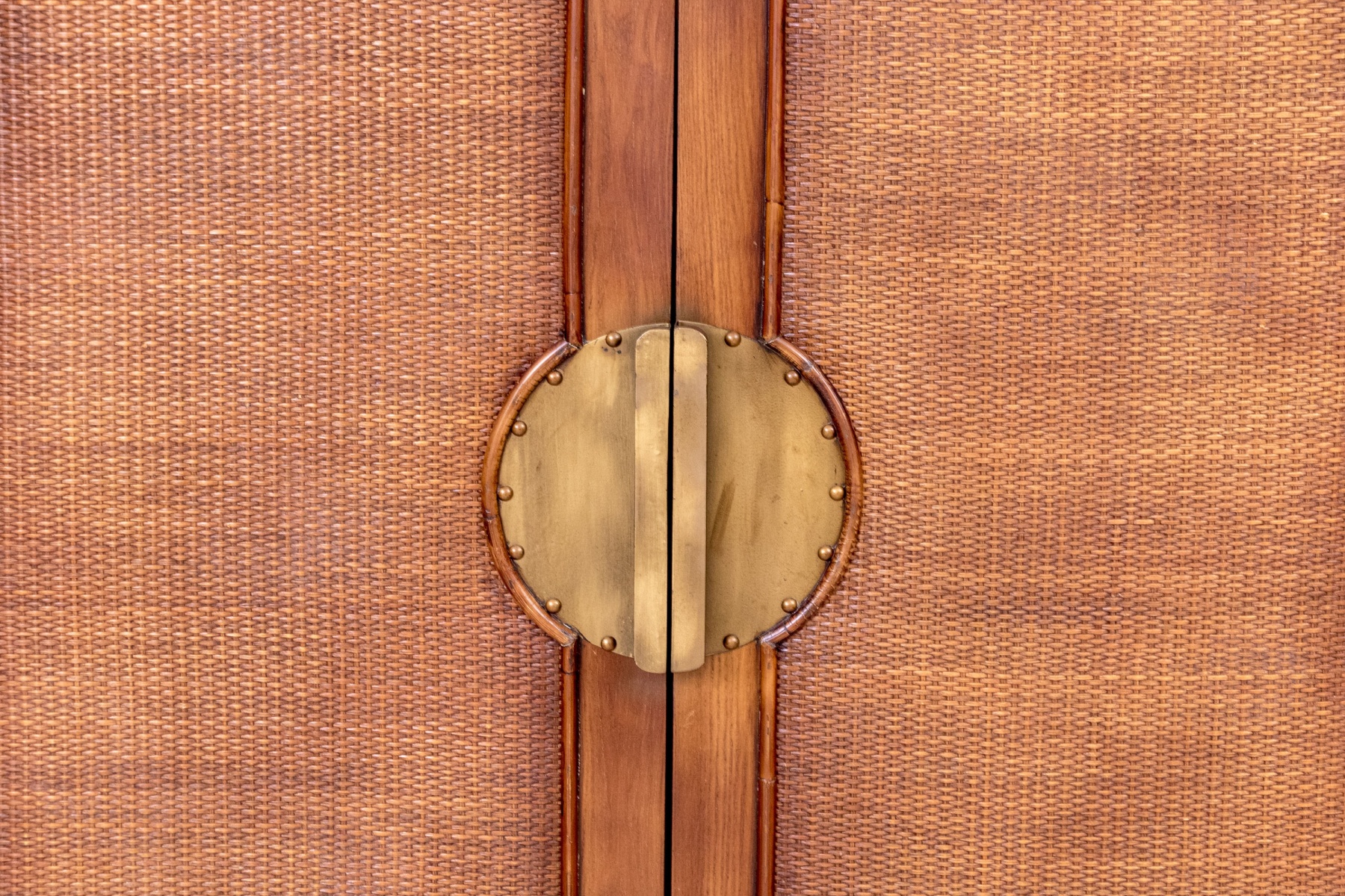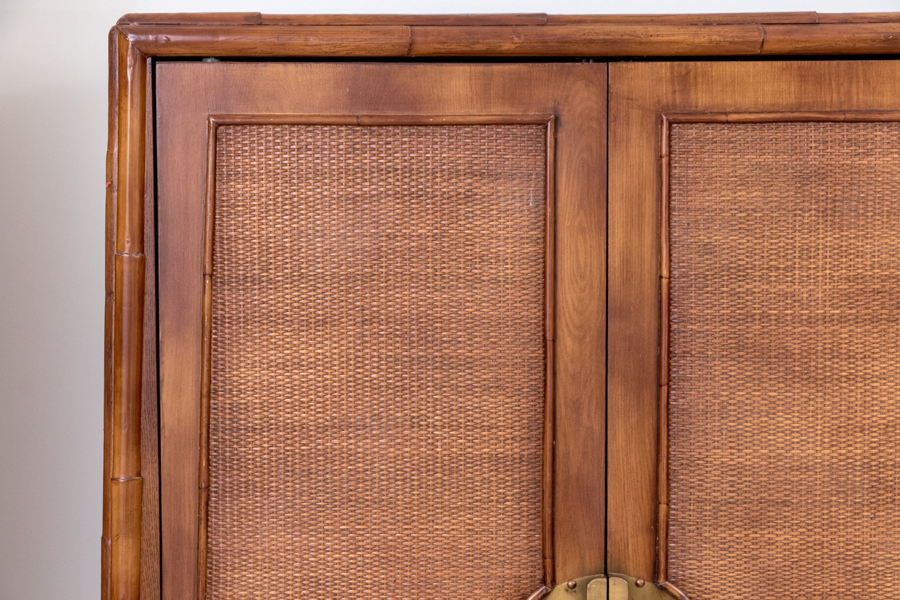 A delightful Bloomingdale's Chinese style entertainment console raised on four short legs with tapered frame and large circular brass mount with handles to center of rattan woven door panels. Doors open to interior three drawer chest with spade above and cutouts in backing for electrical wiring.