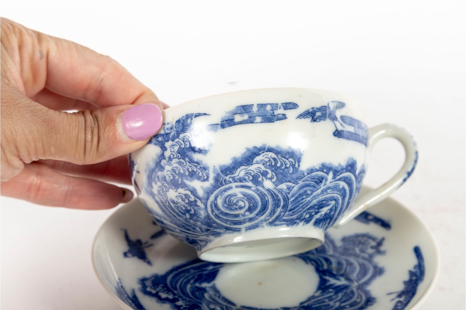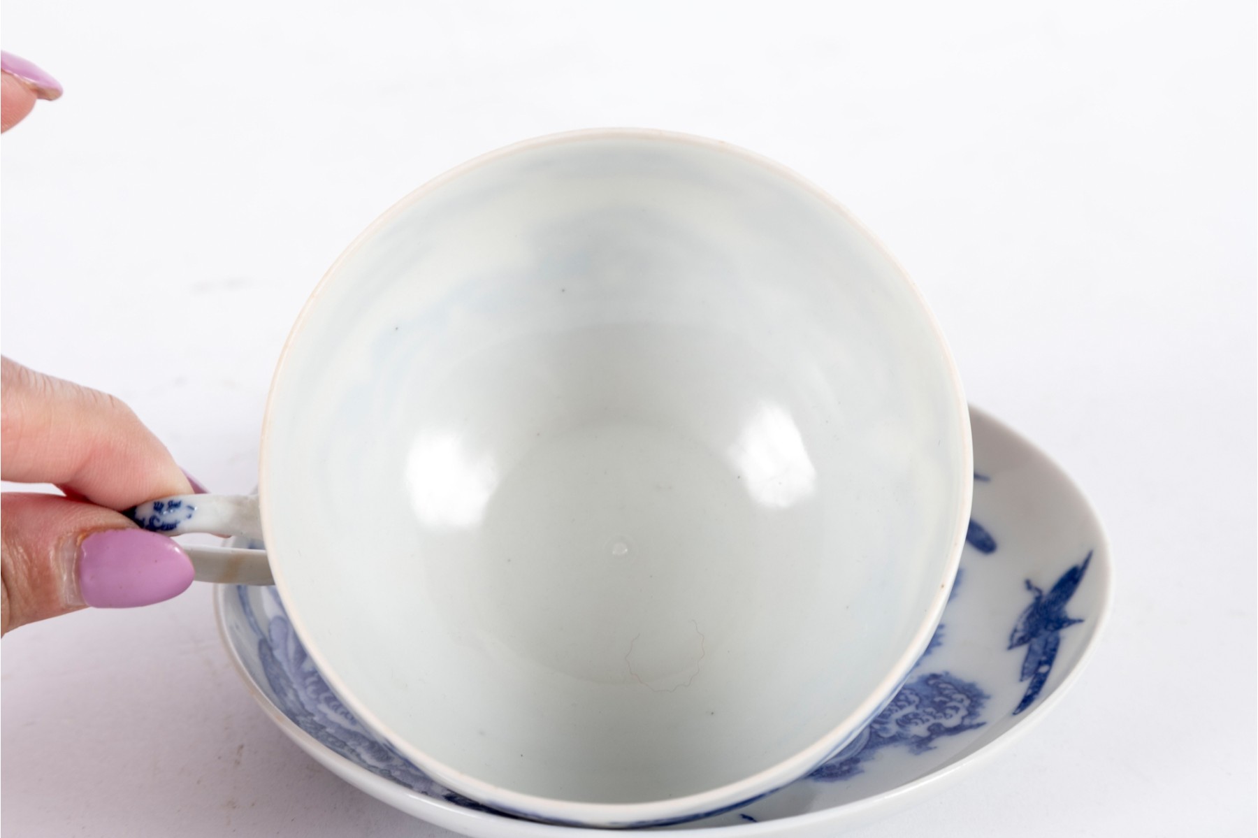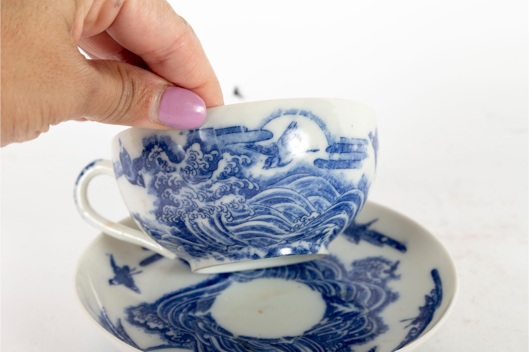 A gorgeous thin porcelain teacup and saucer detailed with monochromatic blue scenes of sparrows and cranes or herons over rolling waves.