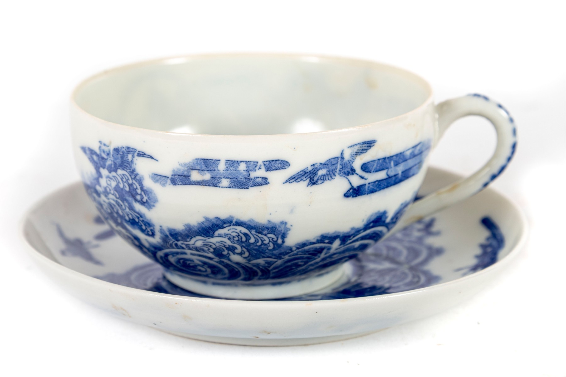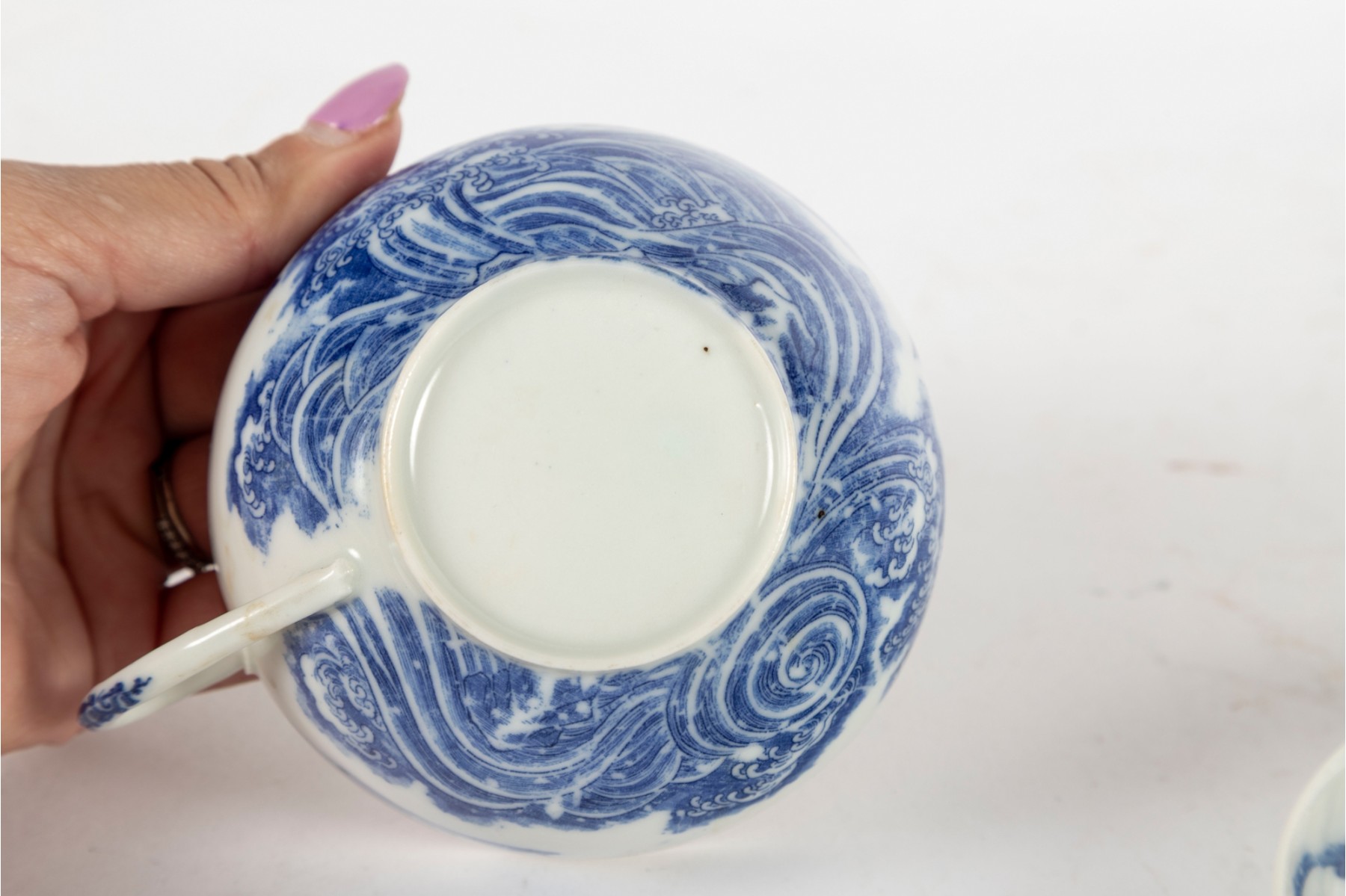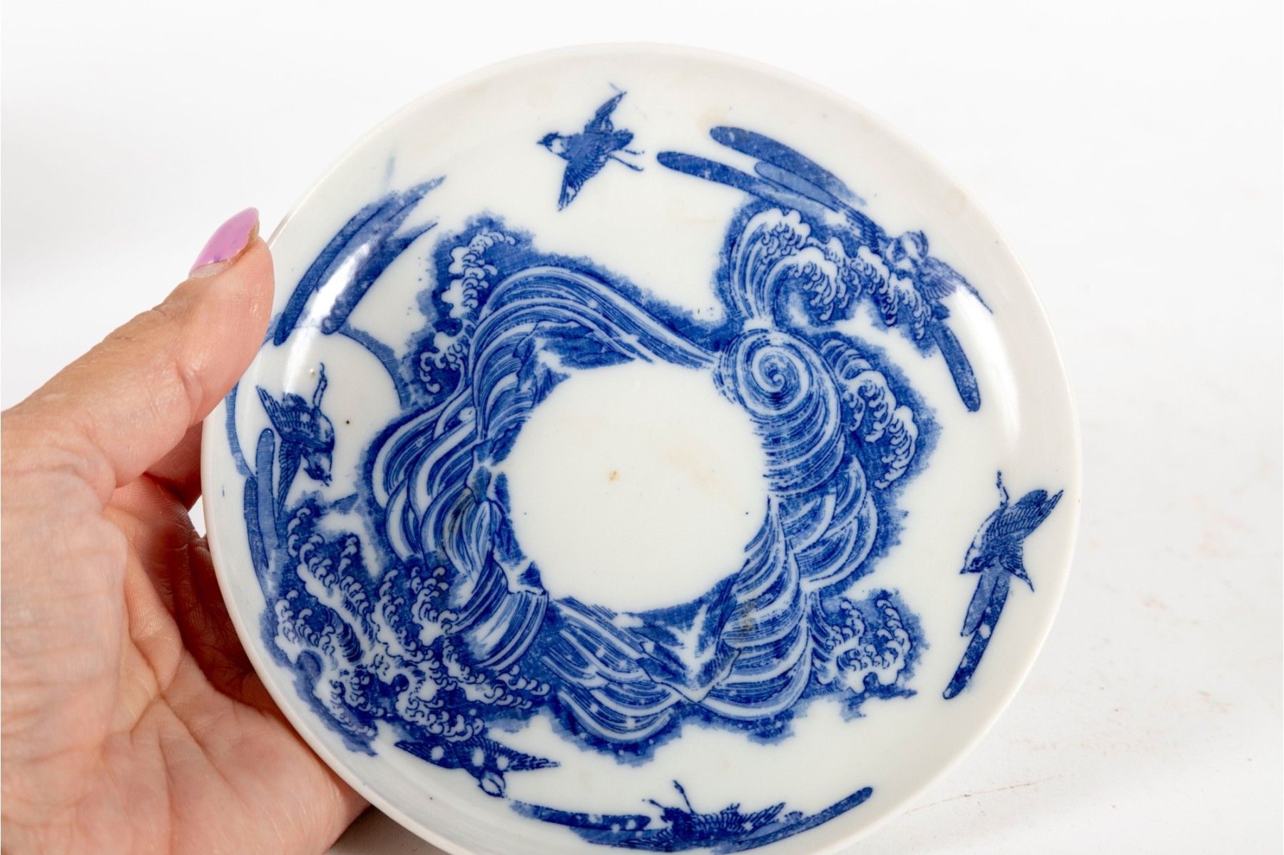 A gorgeous thin porcelain teacup and saucer detailed with monochromatic blue scenes of sparrows and cranes or herons over rolling waves.