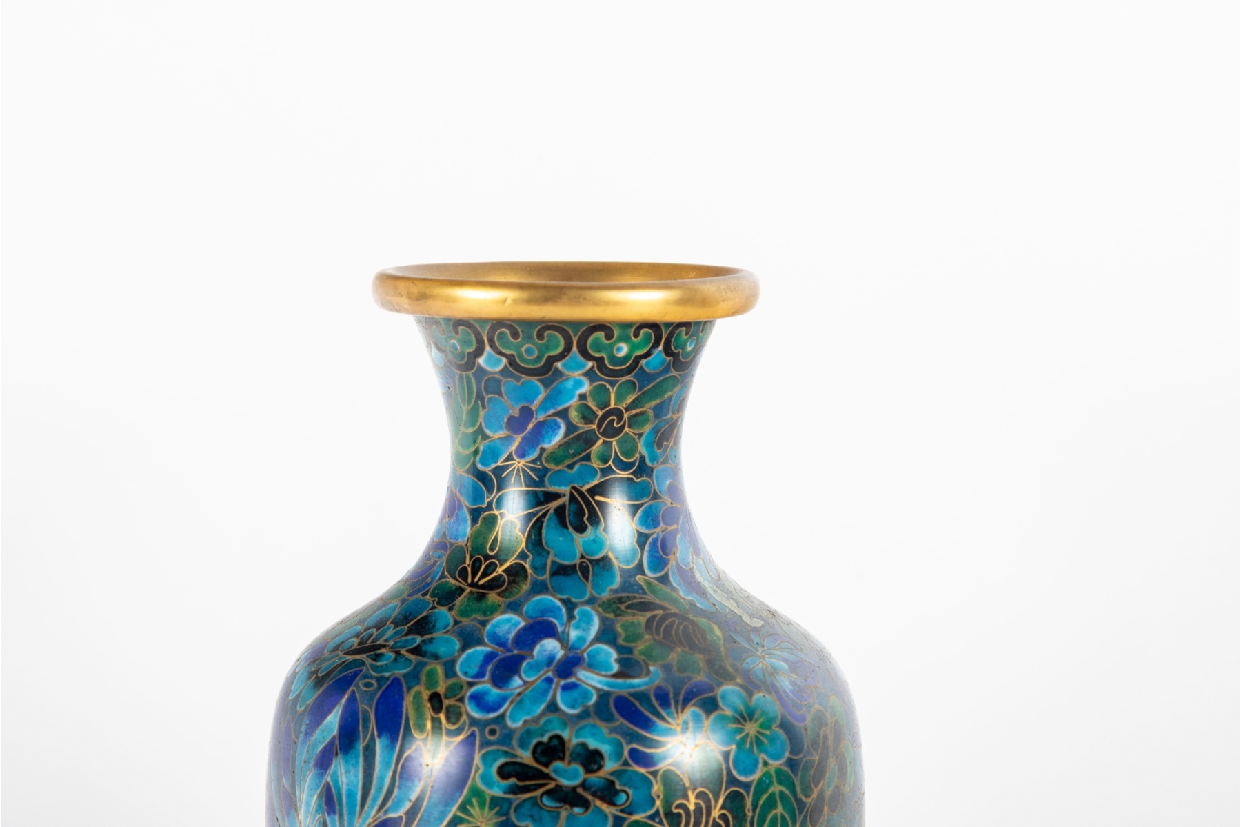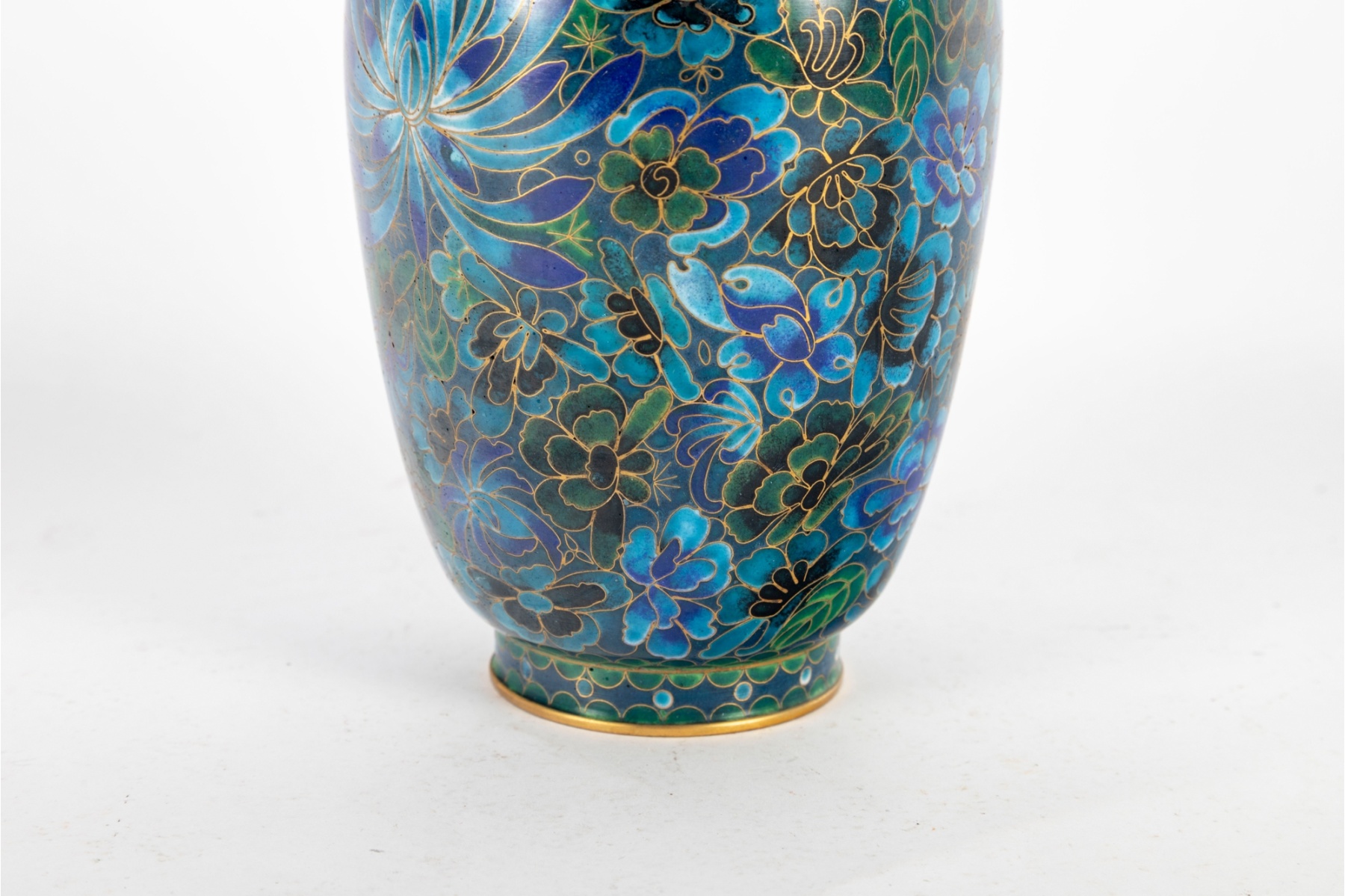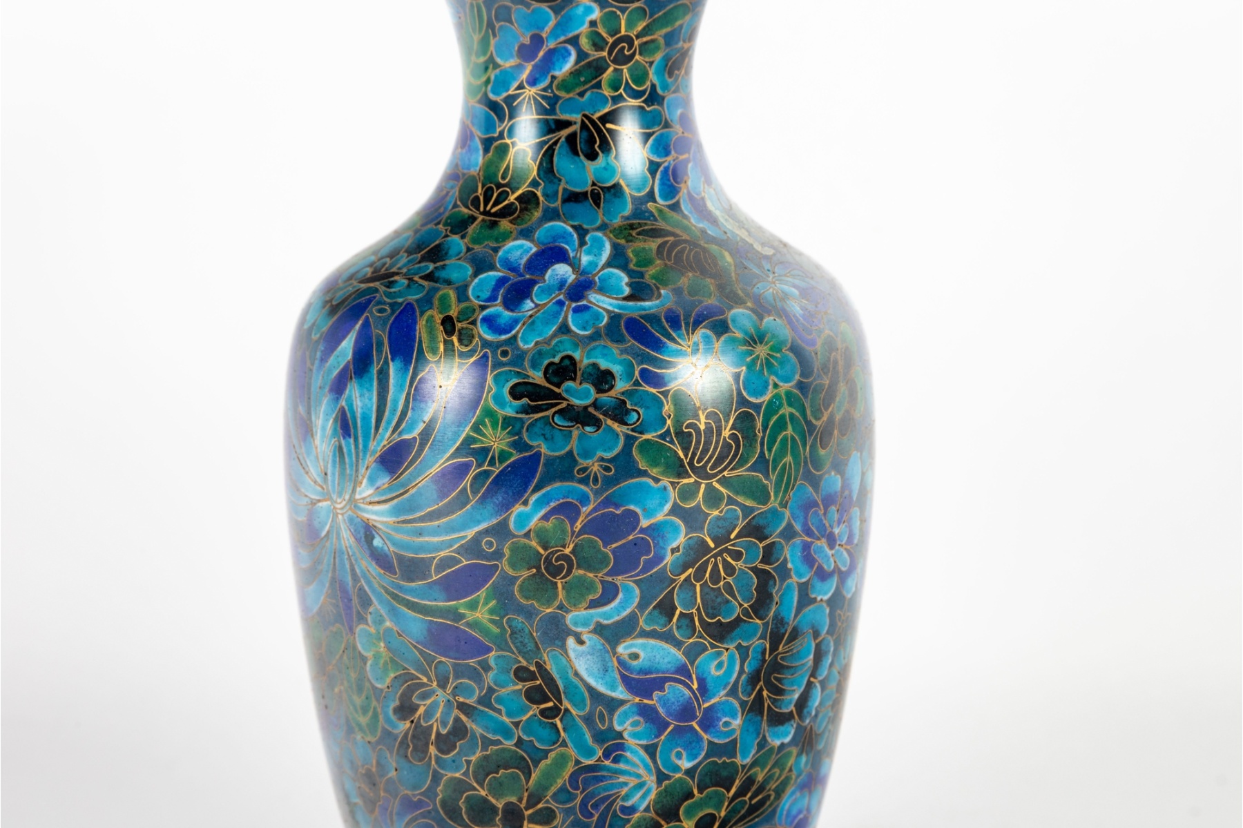 Vintage Chinese cloisonné enamel vase of baluster form, decorated in vibrant shades of blue, turquoise, and green with lush floral motifs throughout.