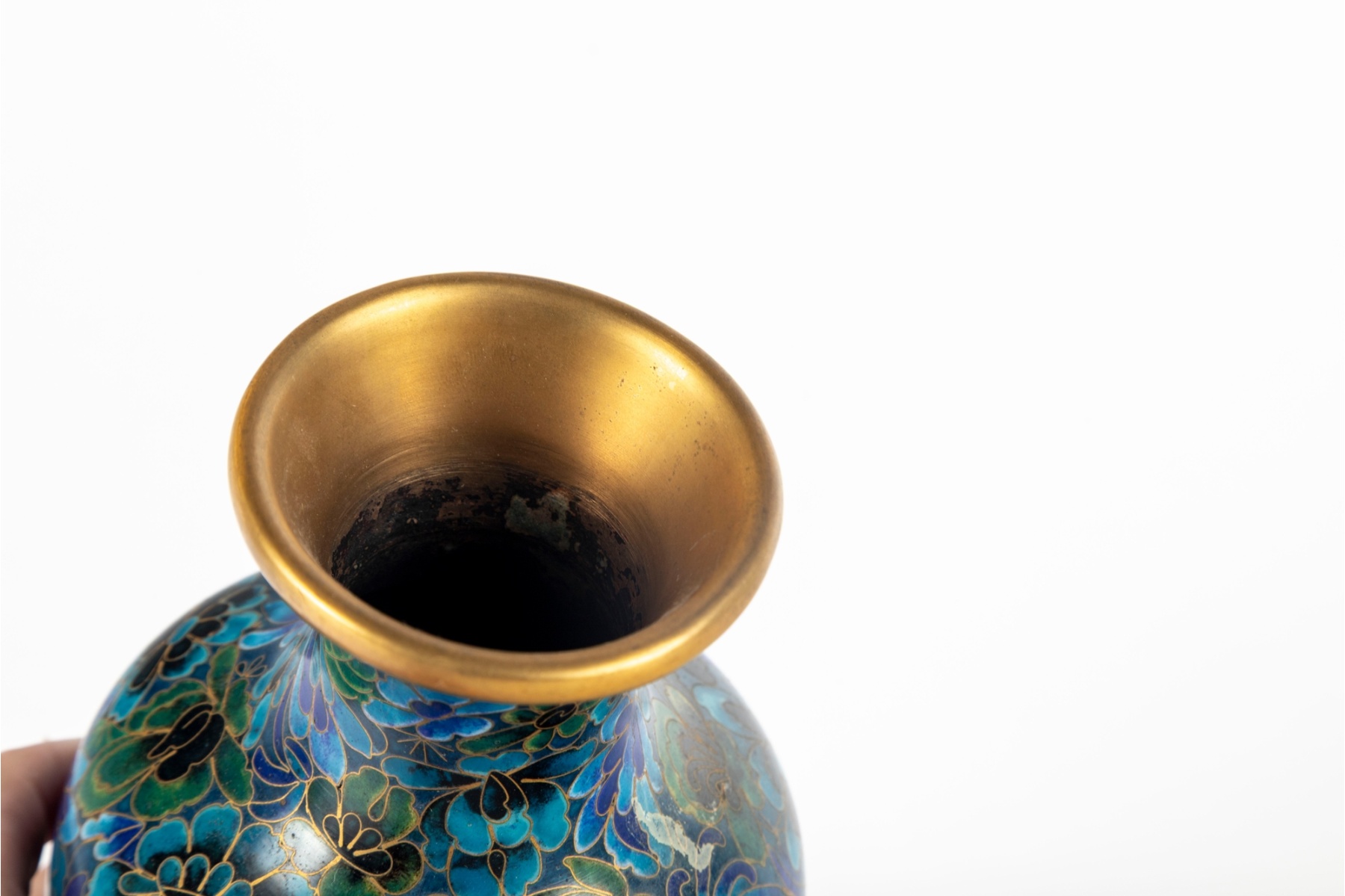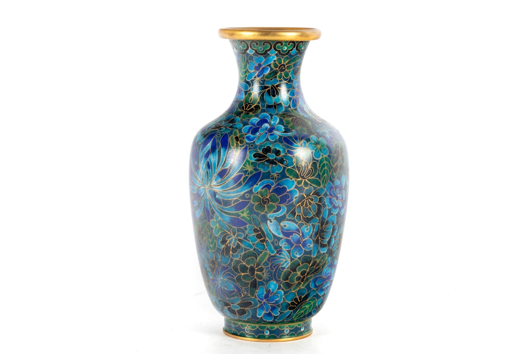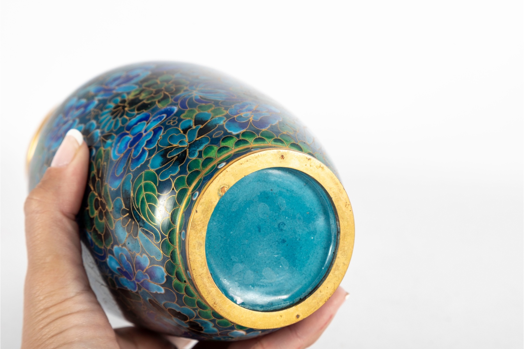 Vintage Chinese cloisonné enamel vase of baluster form, decorated in vibrant shades of blue, turquoise, and green with lush floral motifs throughout.