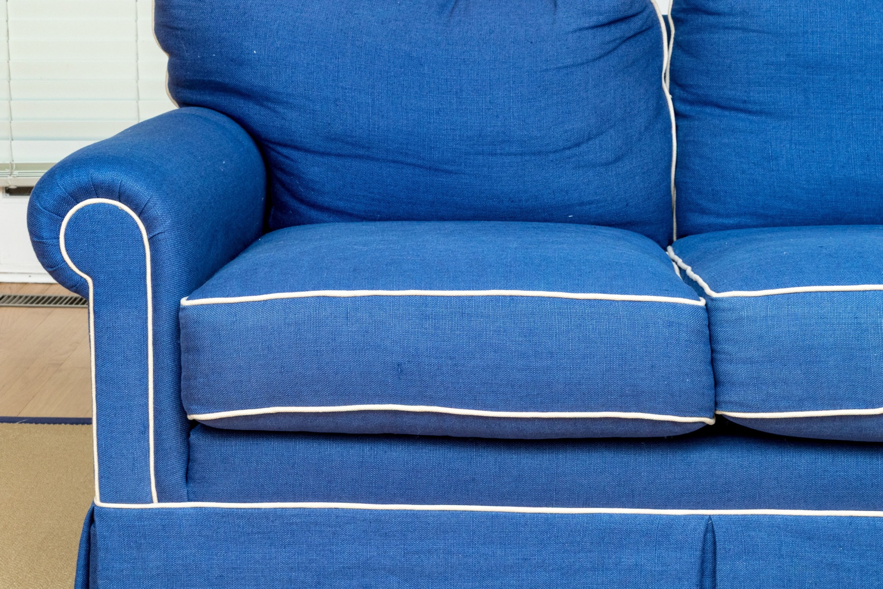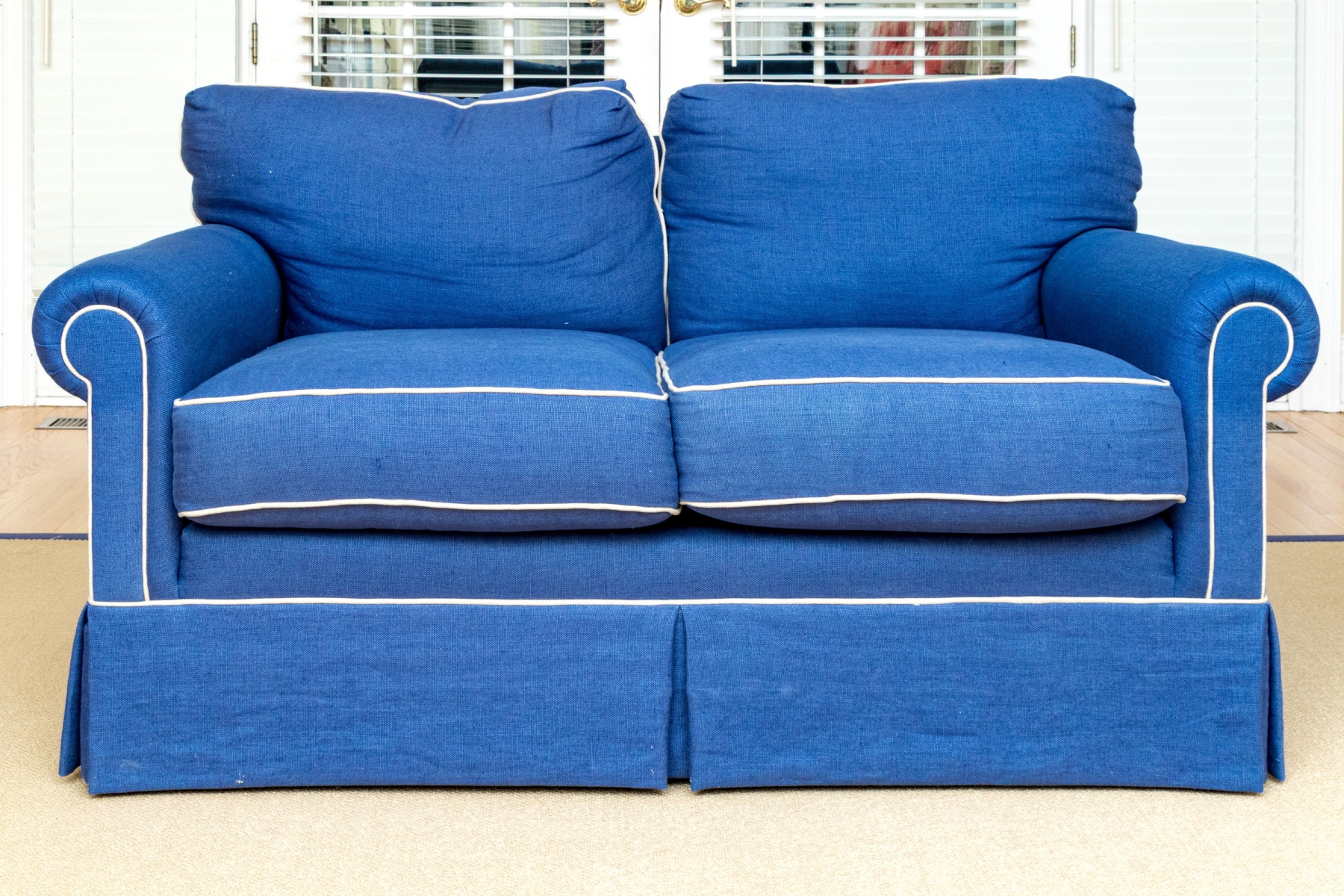 A fabulous transitional style loveseat sofa upholstered in royal blue fabric for a great touch of color and finished with contrasting white piped trims. The sofa features a straight back and rolled arms supporting two loose back and seat cushions, concluding with a skirted apron concealing the legs beneath.
