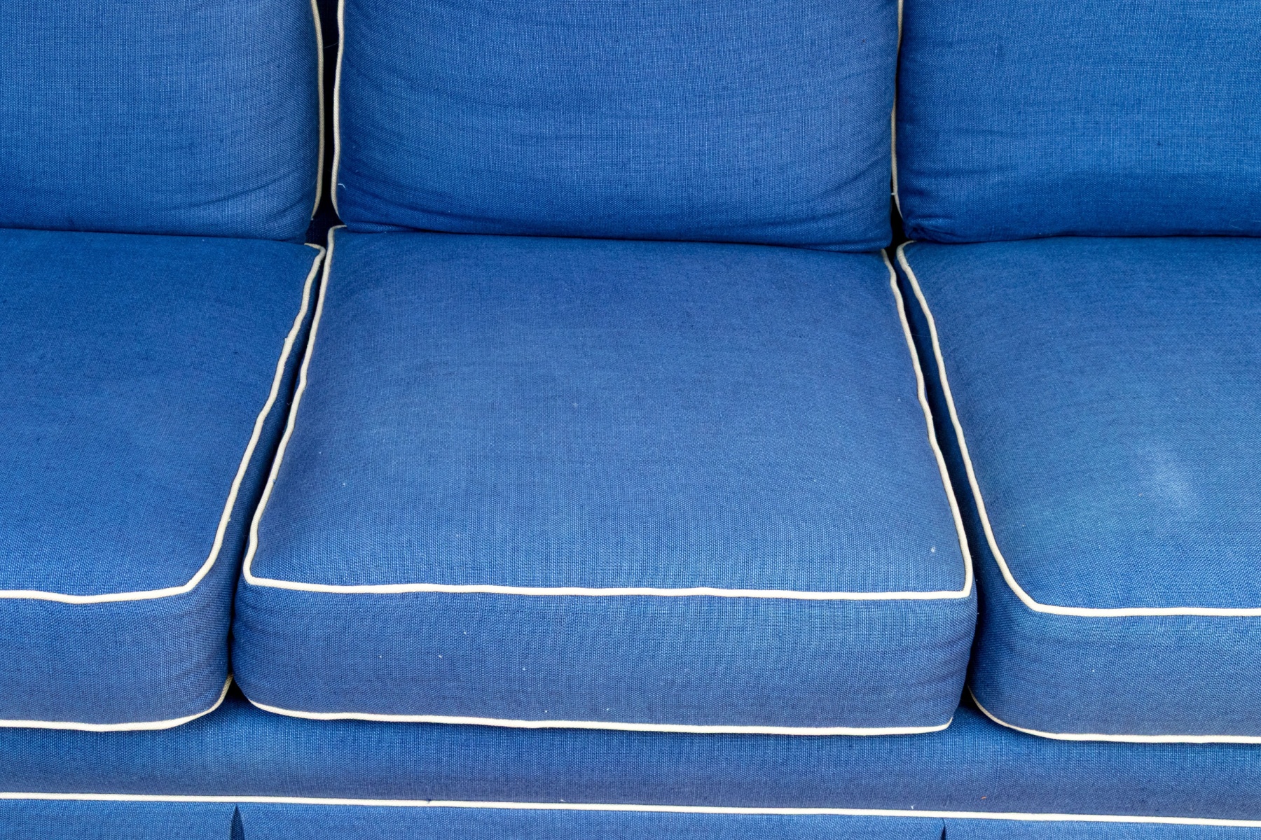 A fabulous transitional style sofa upholstered in royal blue fabric for a great touch of color and finished with contrasting white piped trims. The sofa features a straight back and rolled arms supporting three loose back and seat cushions, concluding with a skirted apron concealing the legs beneath.