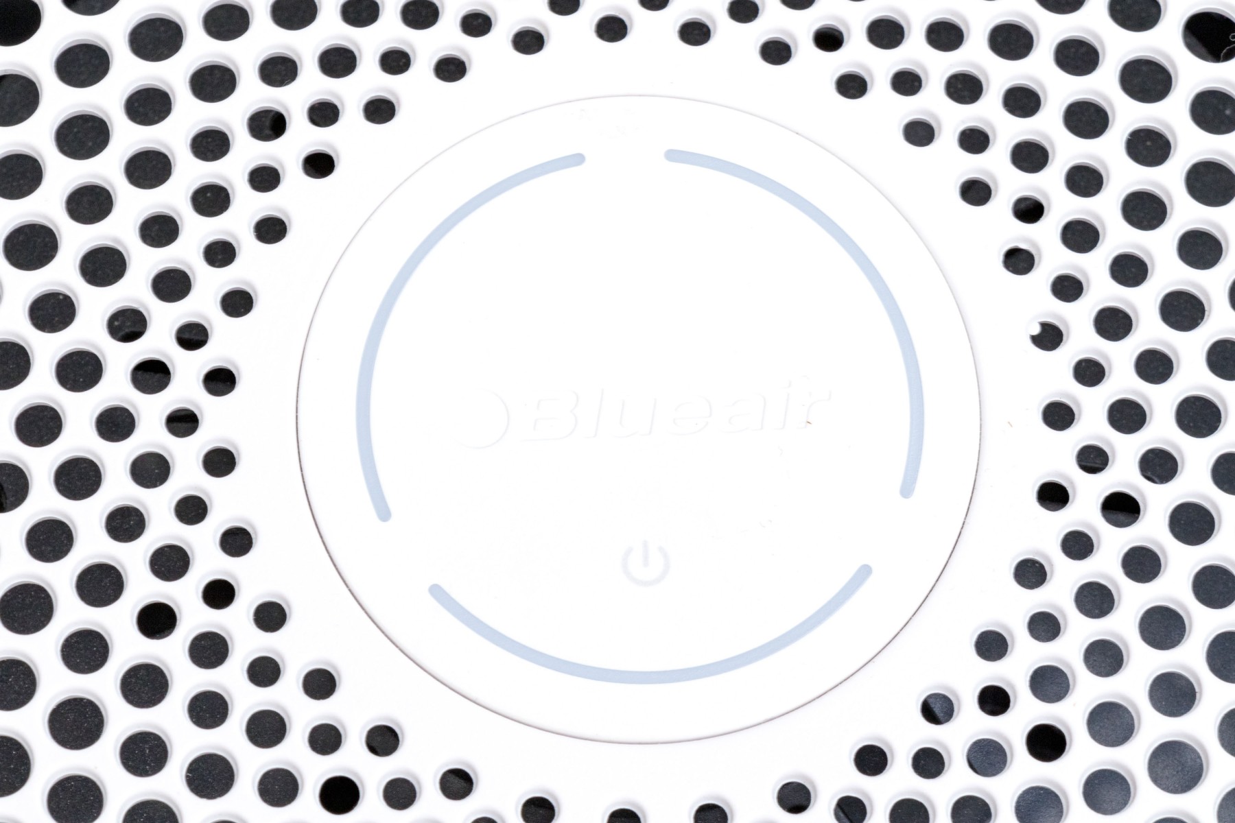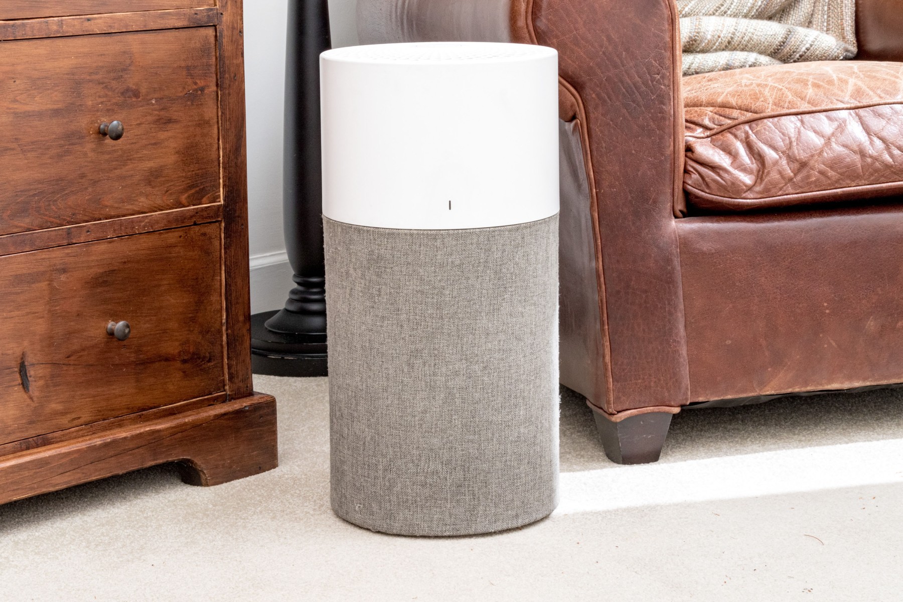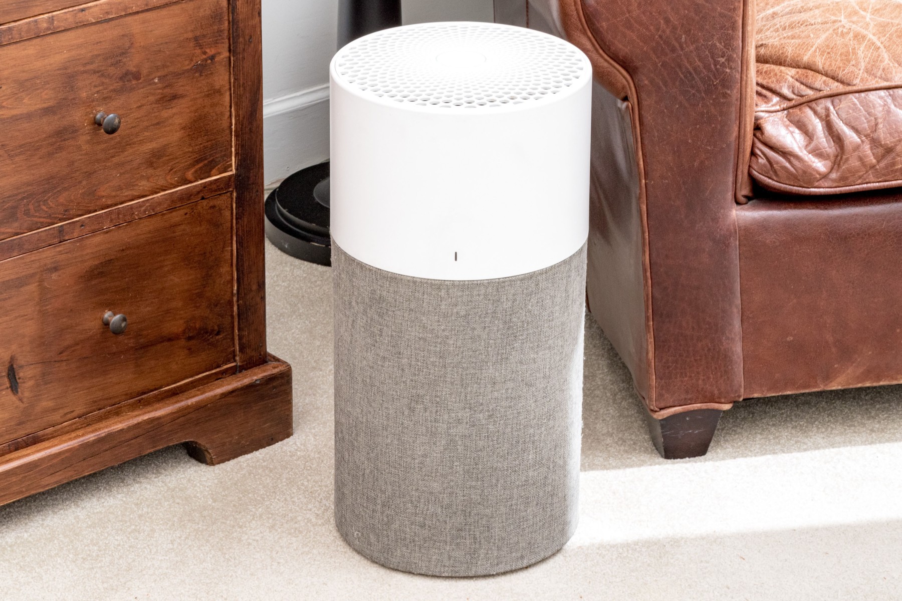 A Blueair air purifier with a sleek and neutral cylindrical design, incorporating a white upper body with a decoratively pierced top and a gray lower body in a textural, coarse-weave fabric.