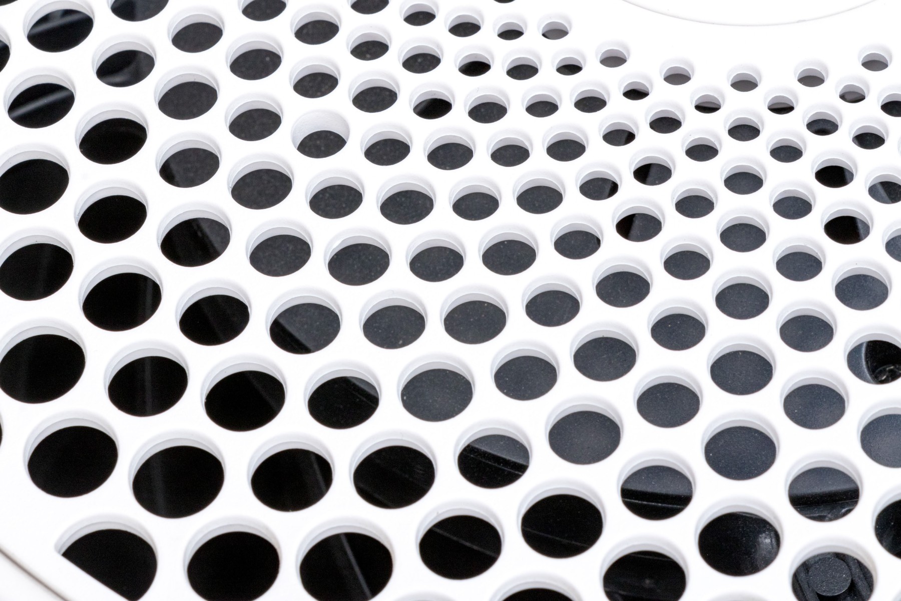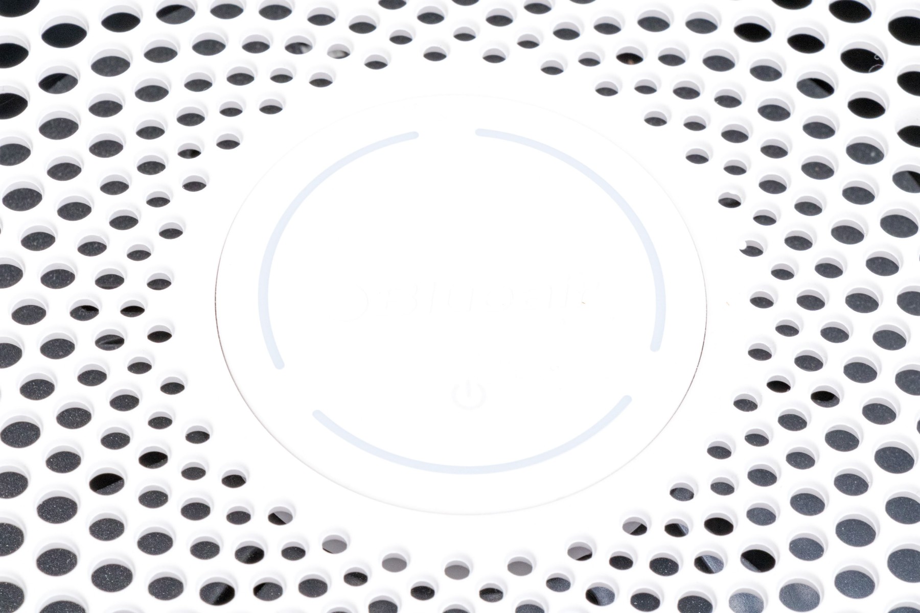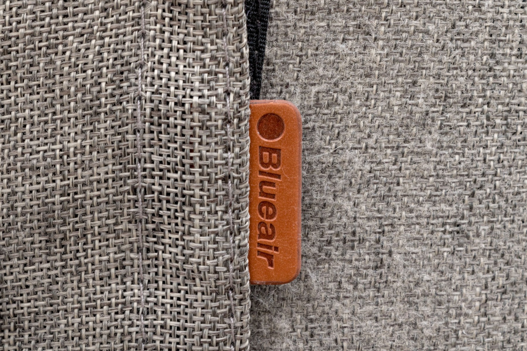 A Blueair air purifier with a sleek and neutral cylindrical design, incorporating a white upper body with a decoratively pierced top and a gray lower body in a textural, coarse-weave fabric.