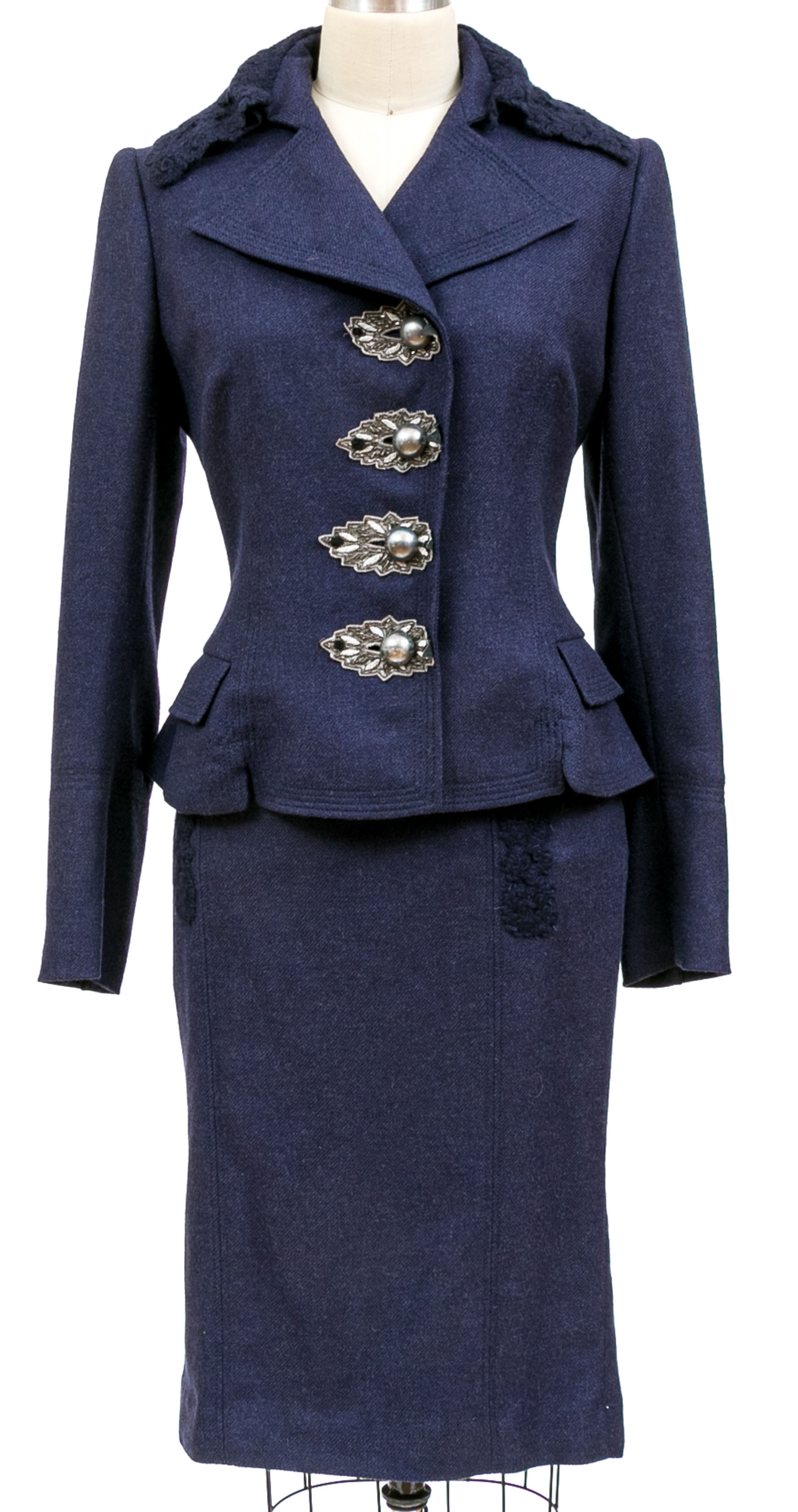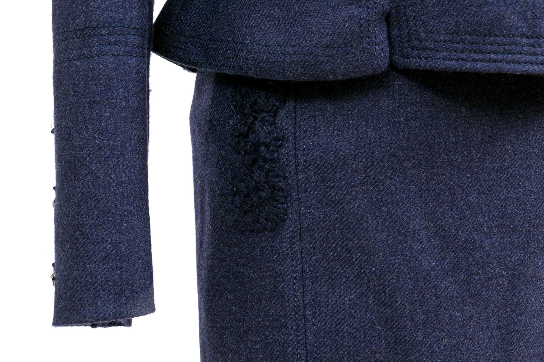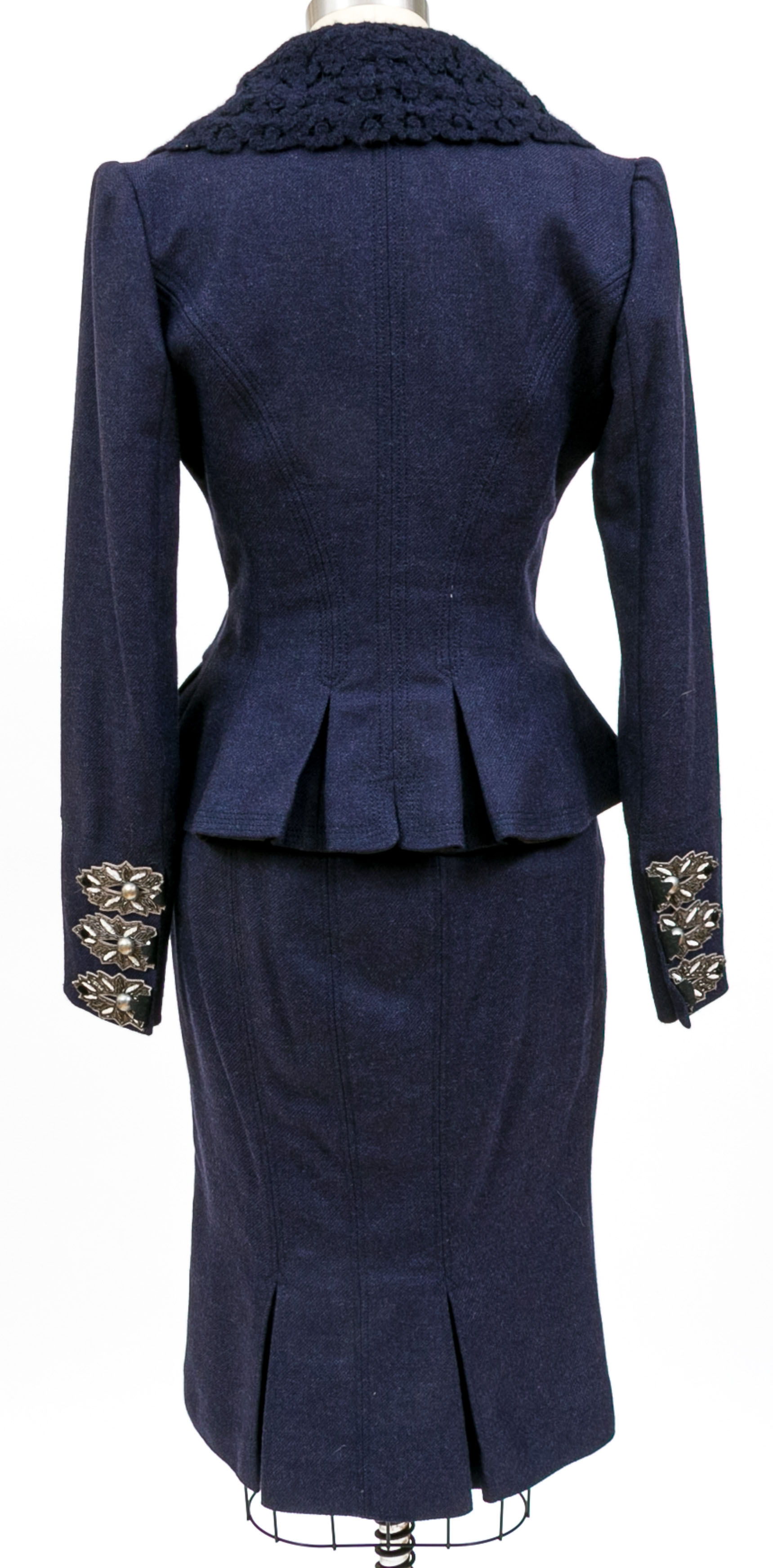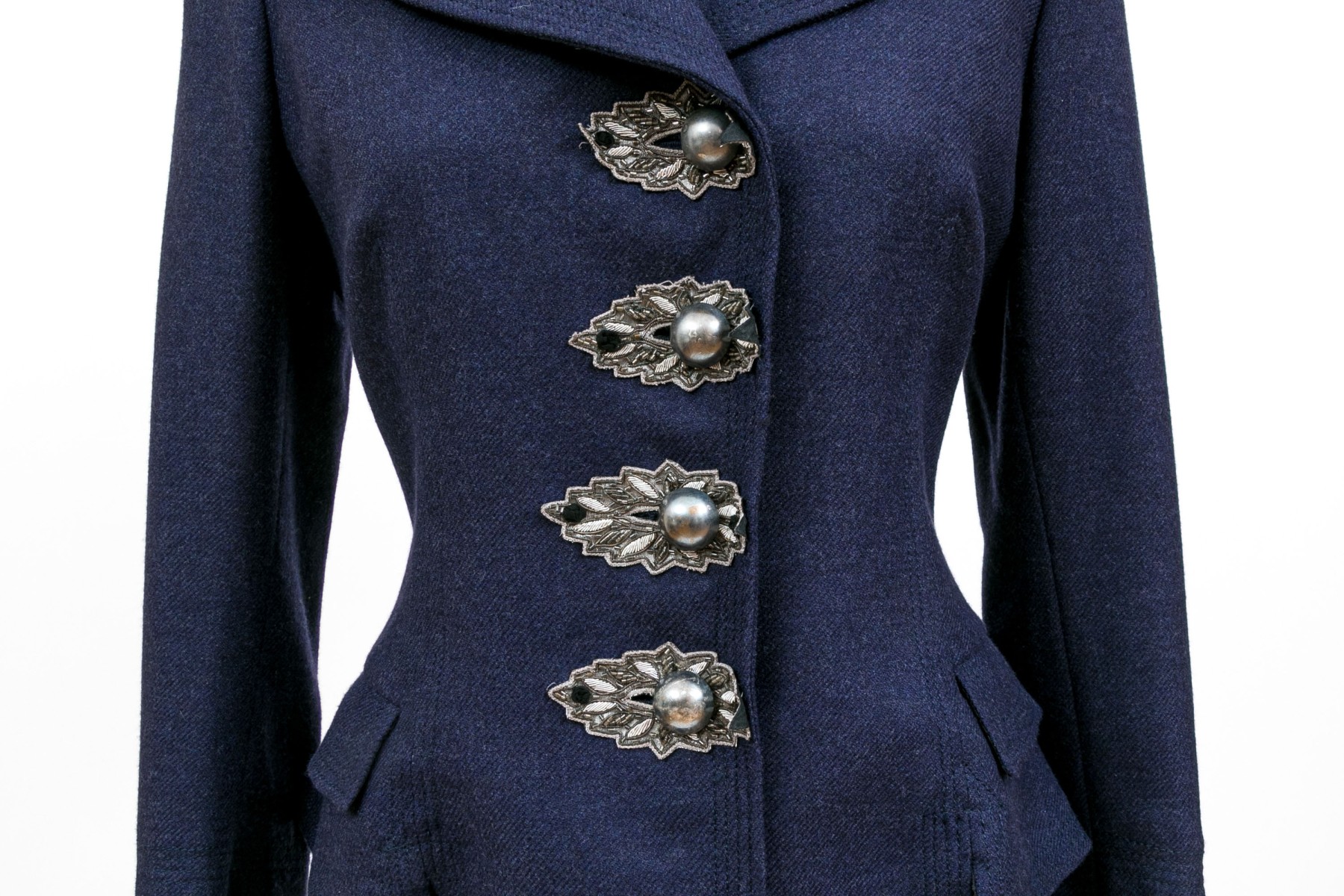 Blumarine eye-catching blue wool and cashmere skirt suit, size 44 Italy (USA 8), bedazzled grey buttons