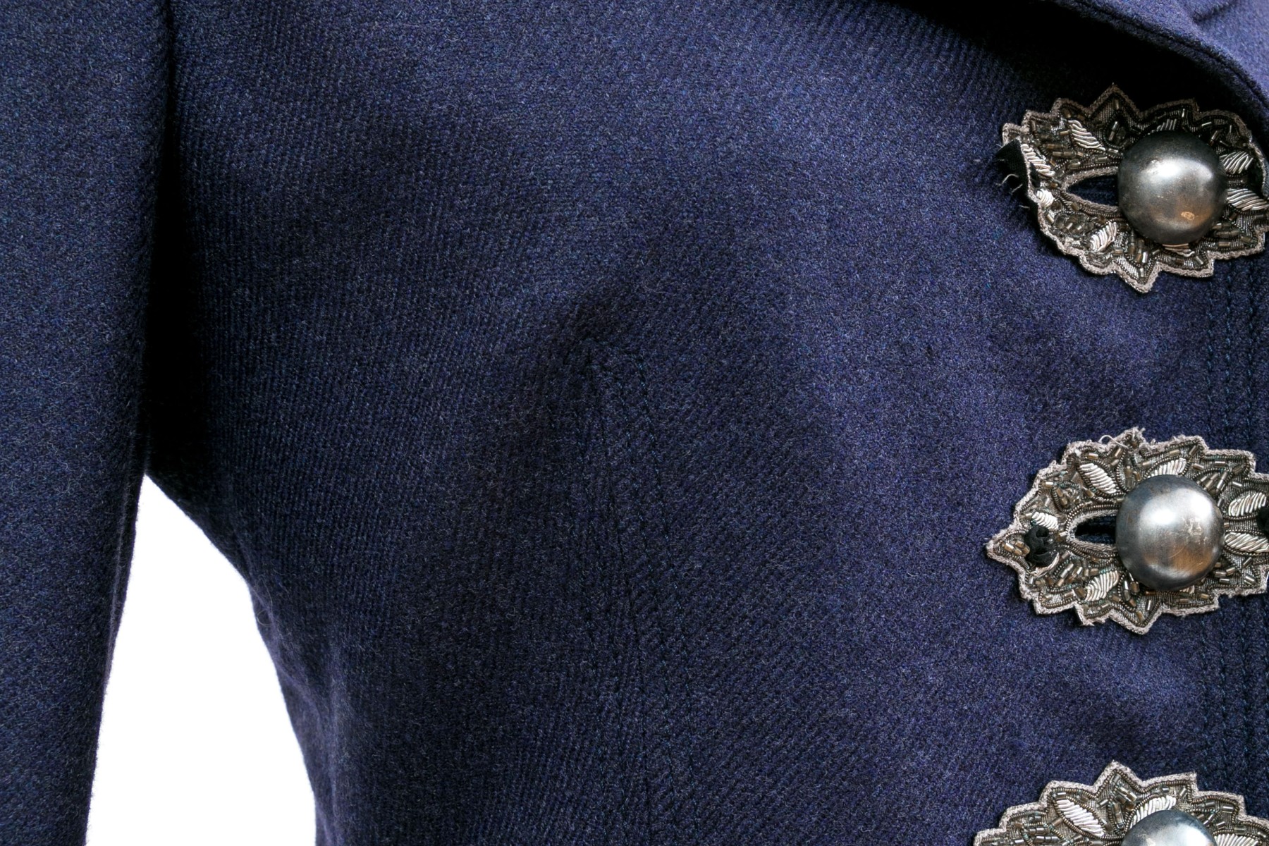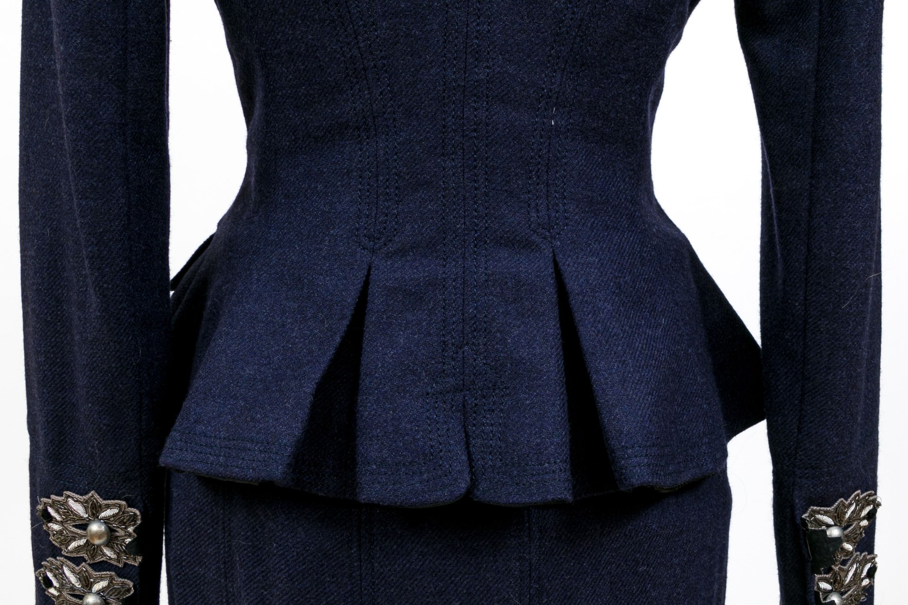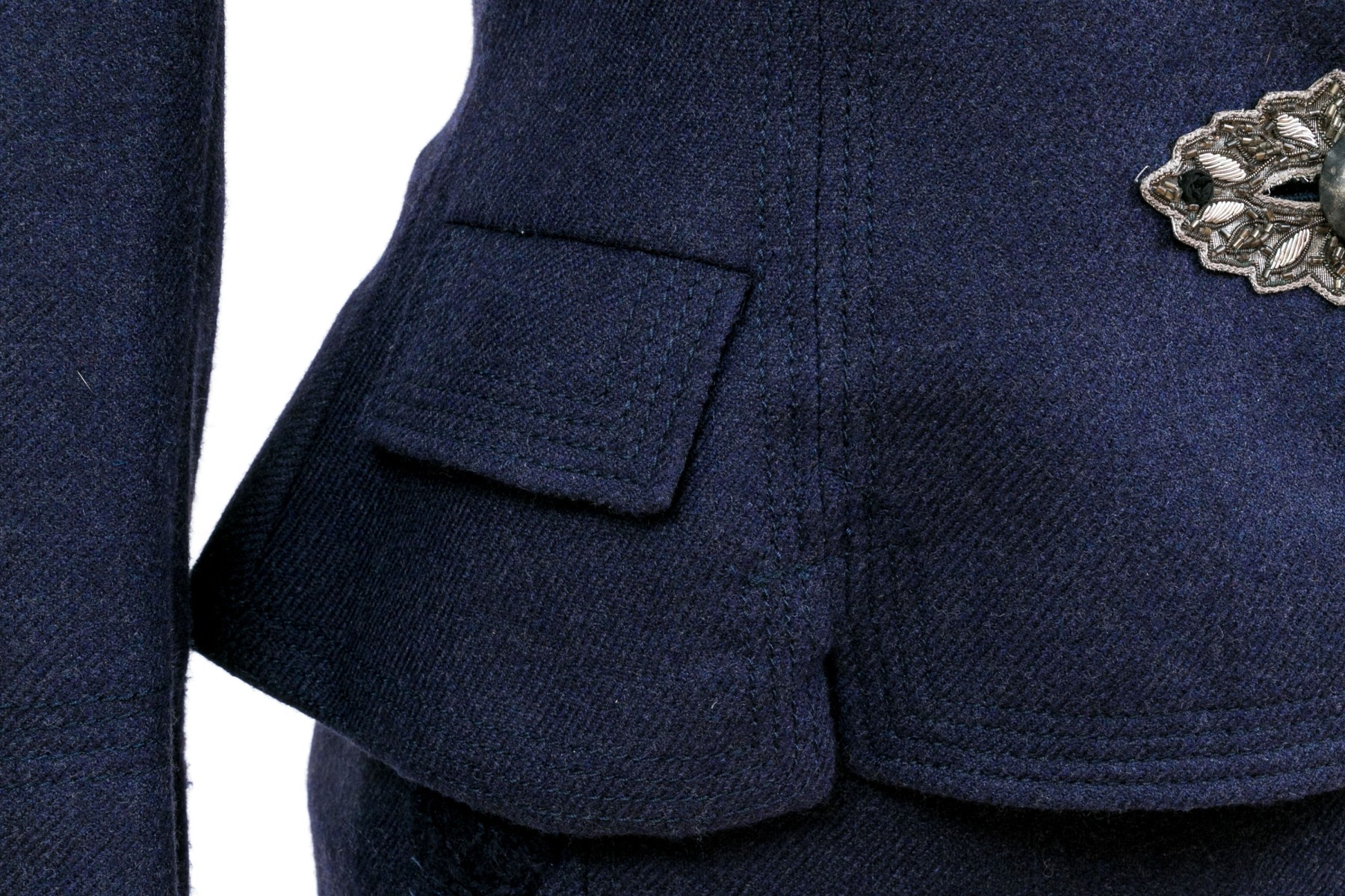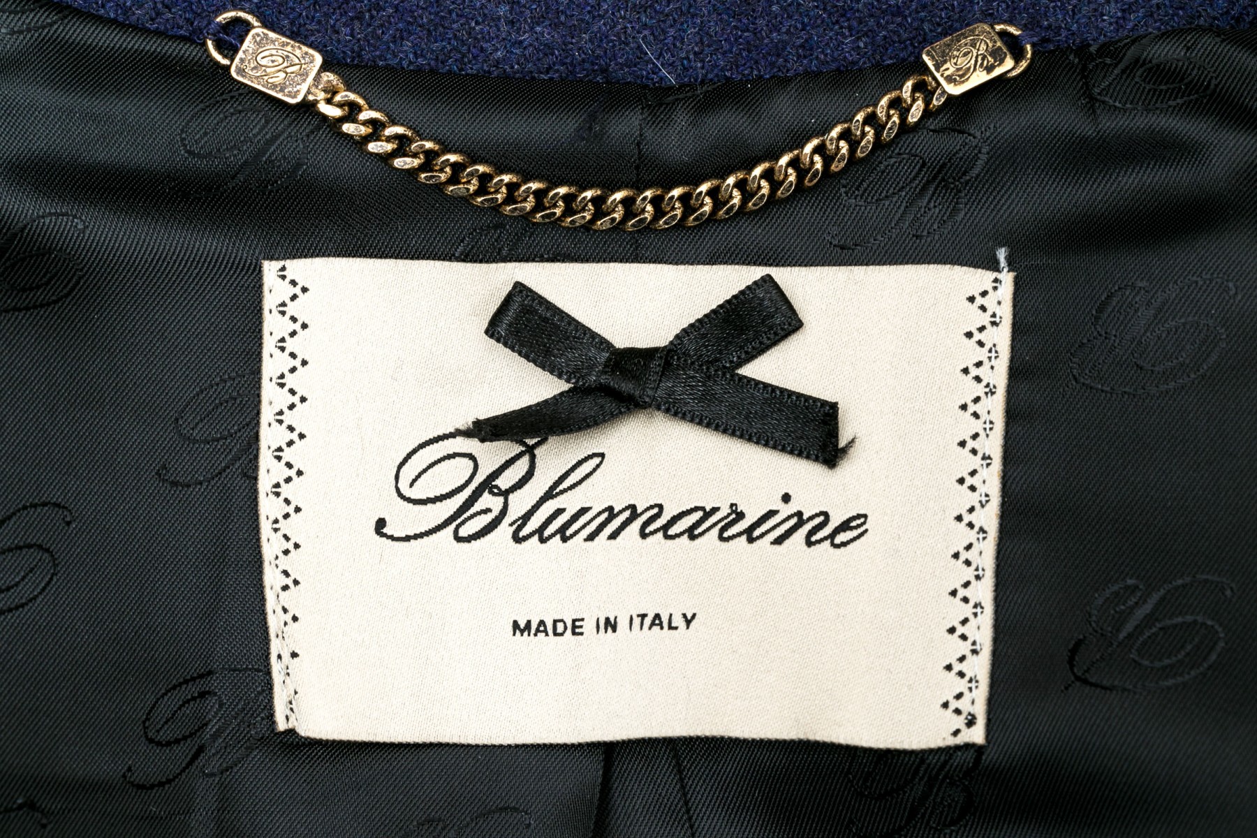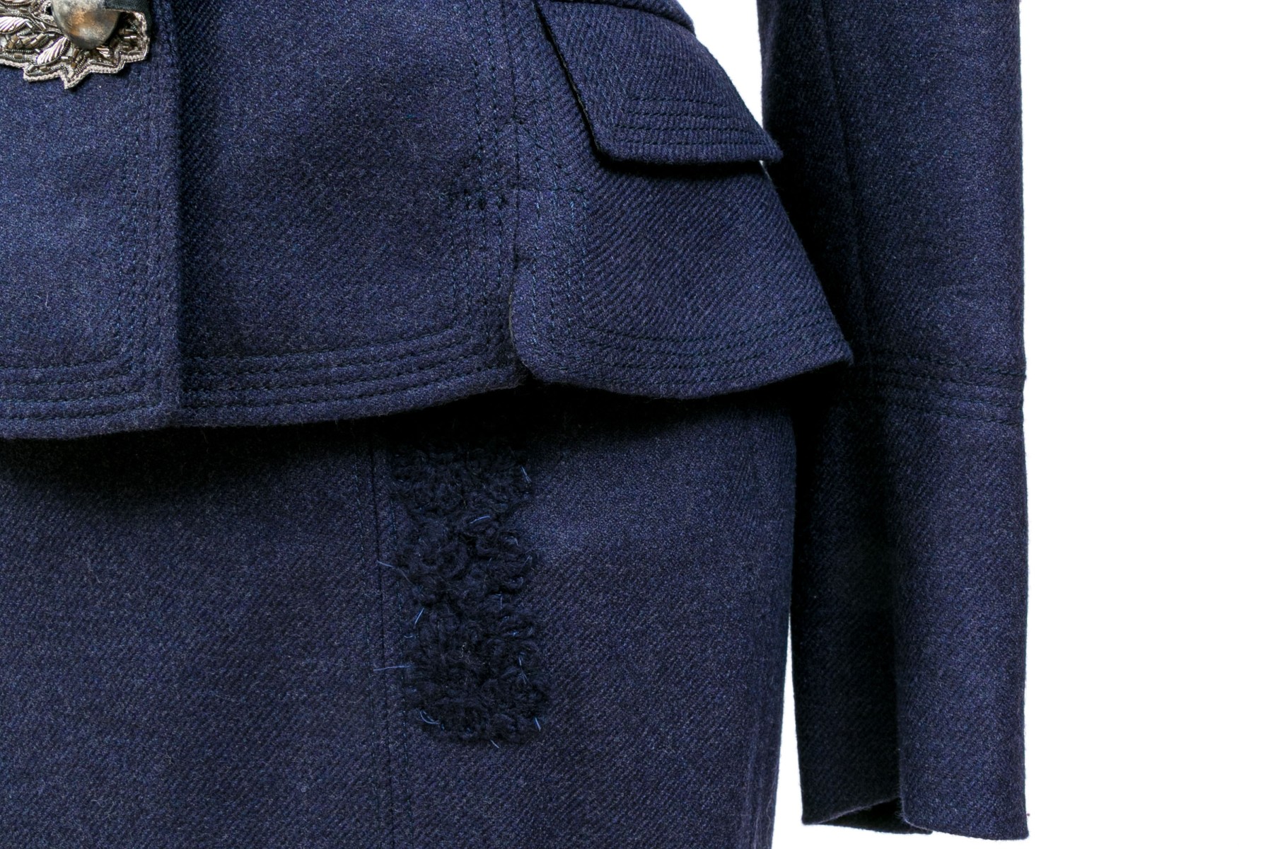 Blumarine eye-catching blue wool and cashmere skirt suit, size 44 Italy (USA 8), bedazzled grey buttons