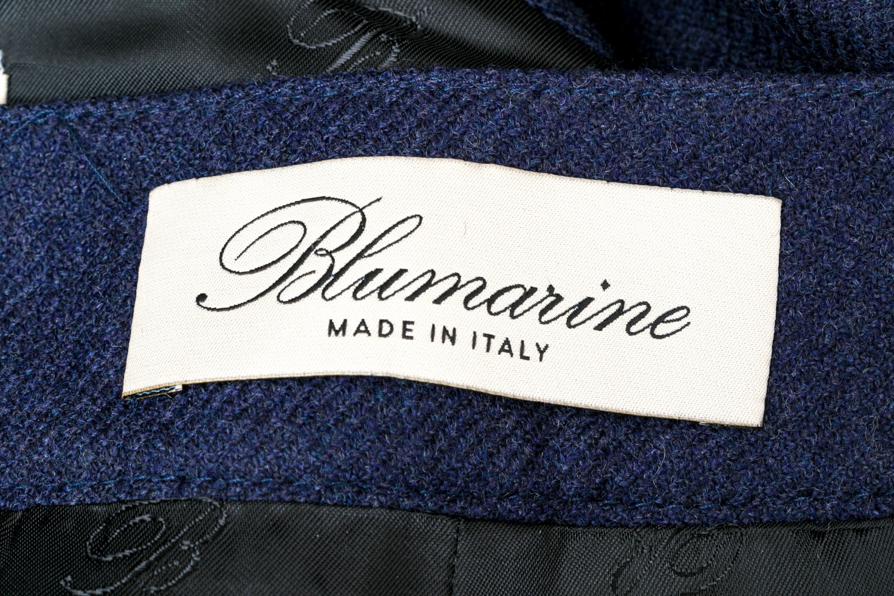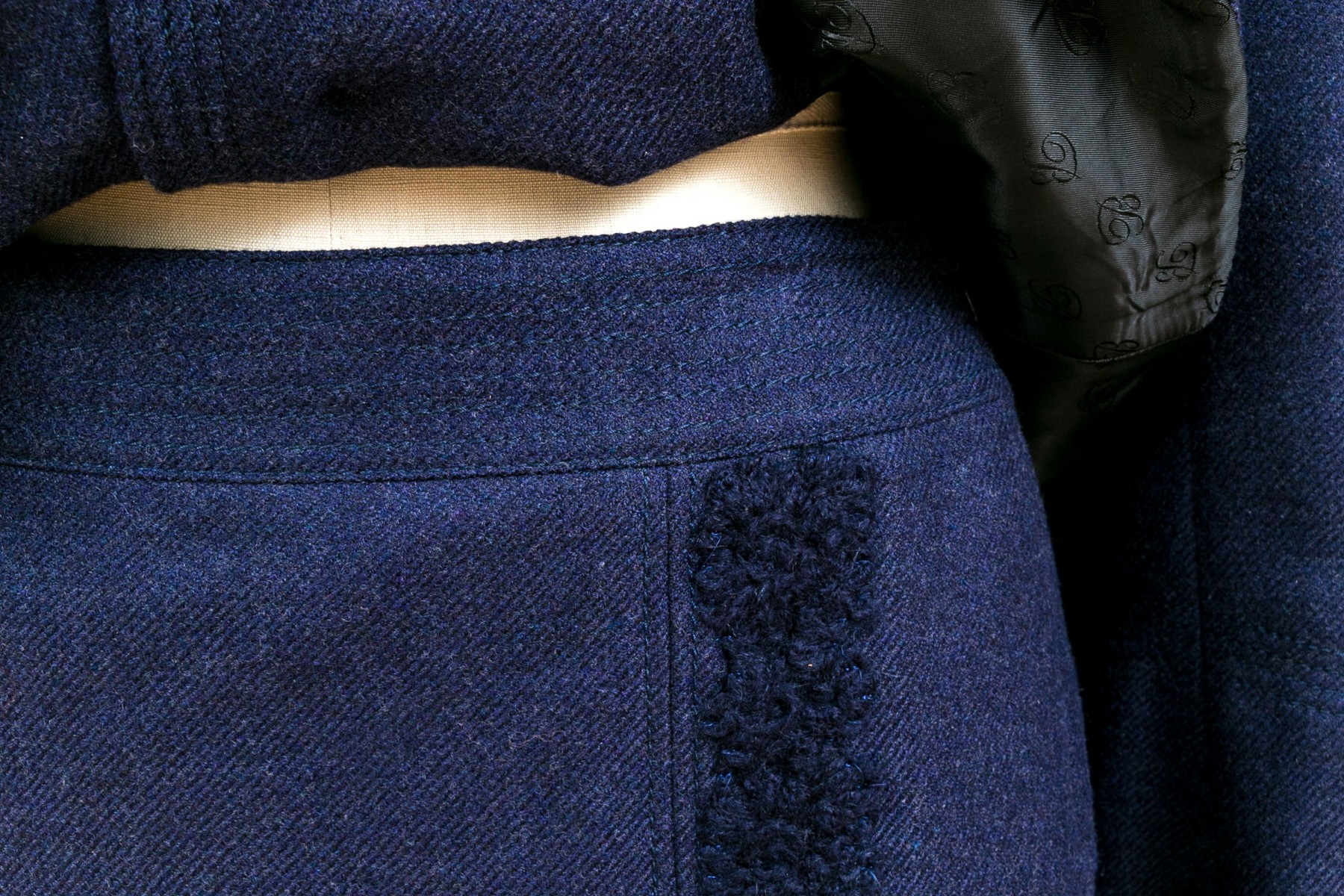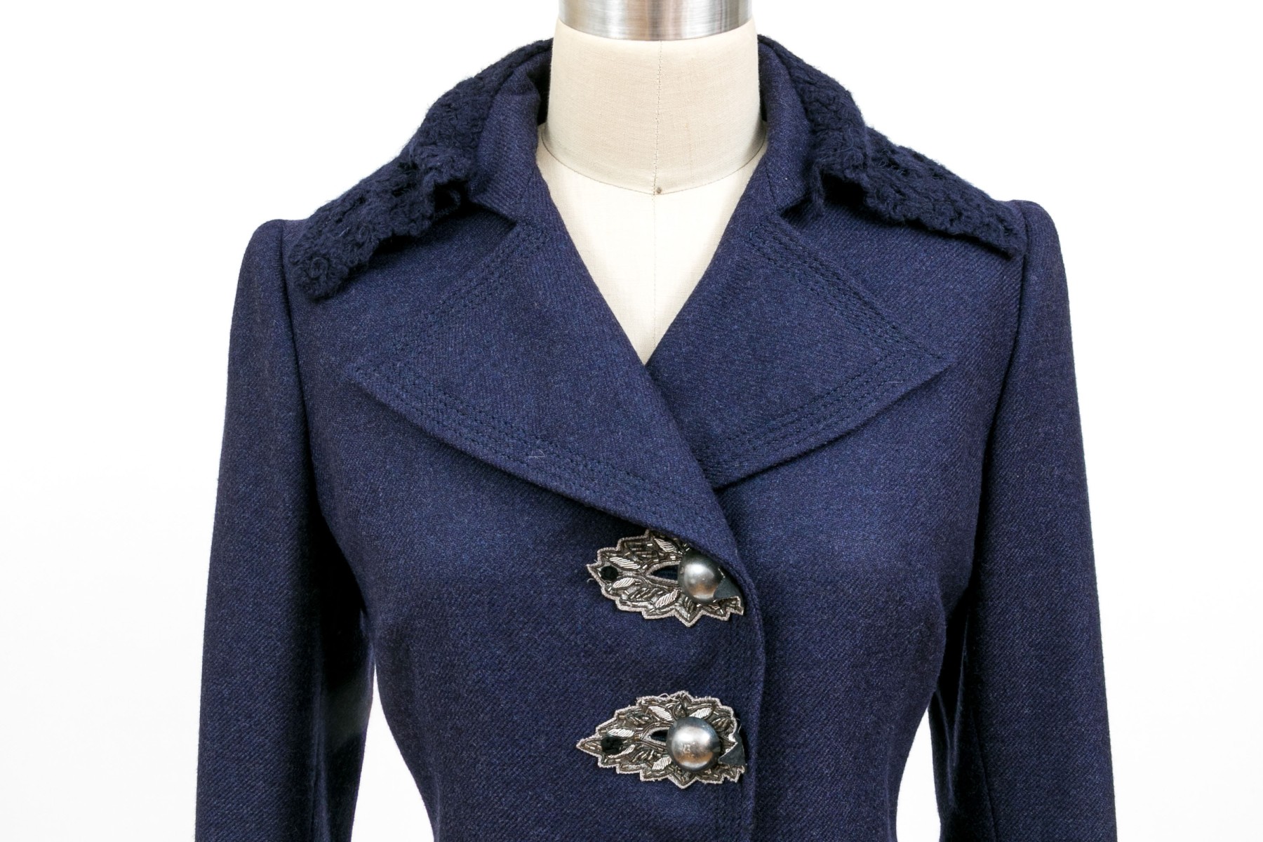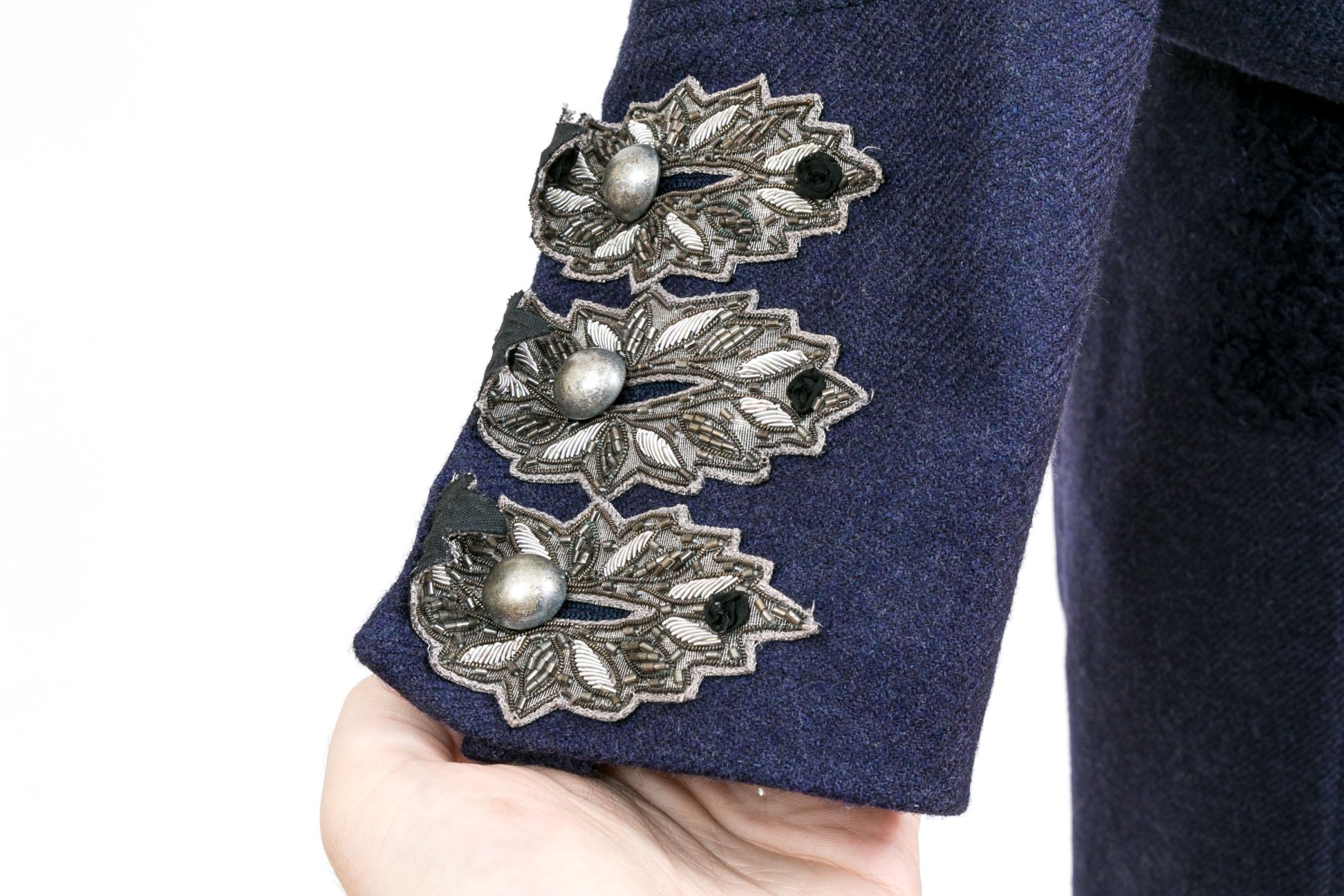 Blumarine eye-catching blue wool and cashmere skirt suit, size 44 Italy (USA 8), bedazzled grey buttons