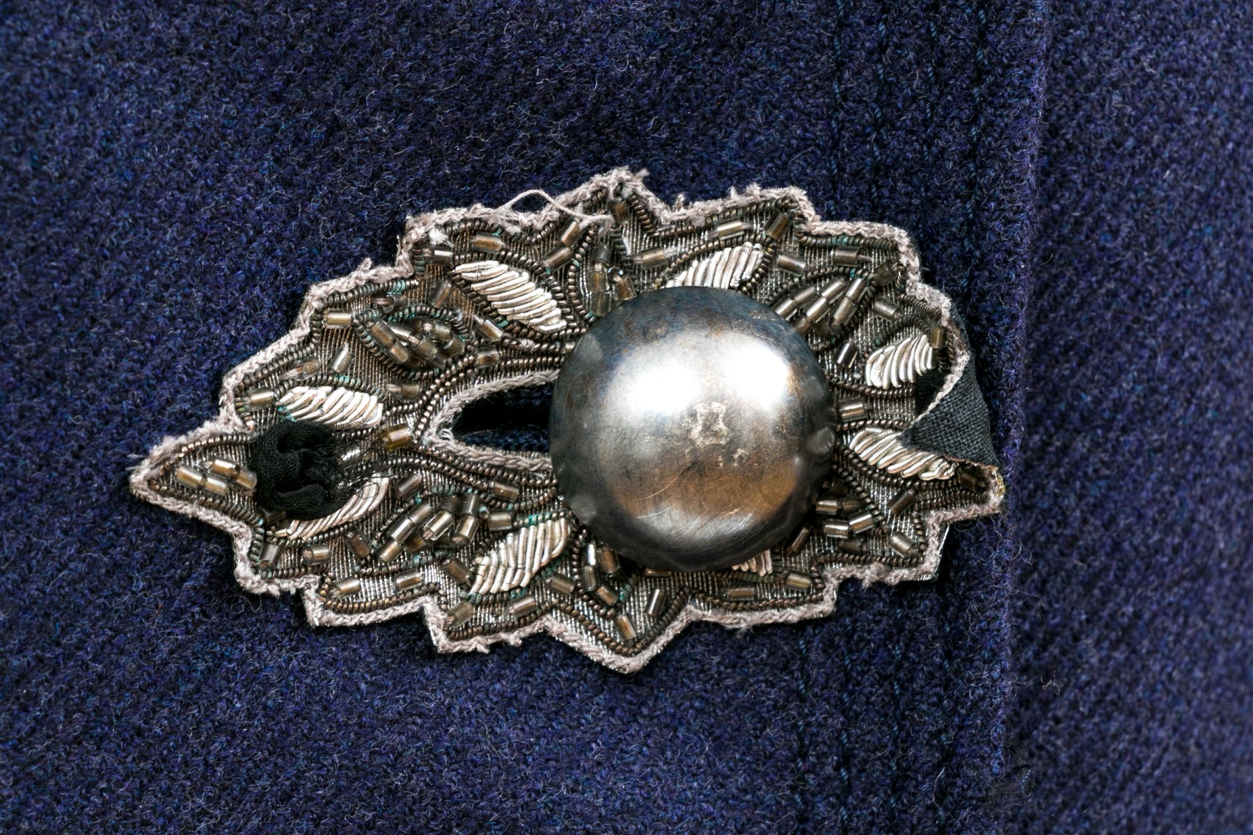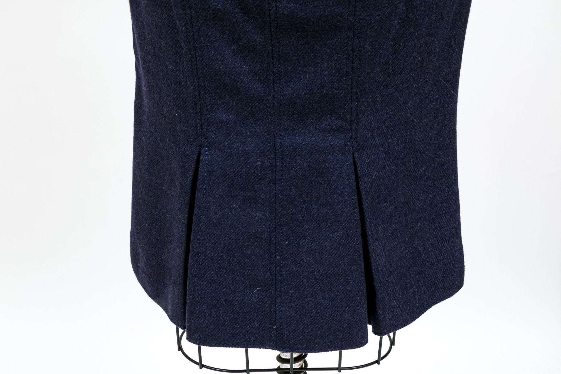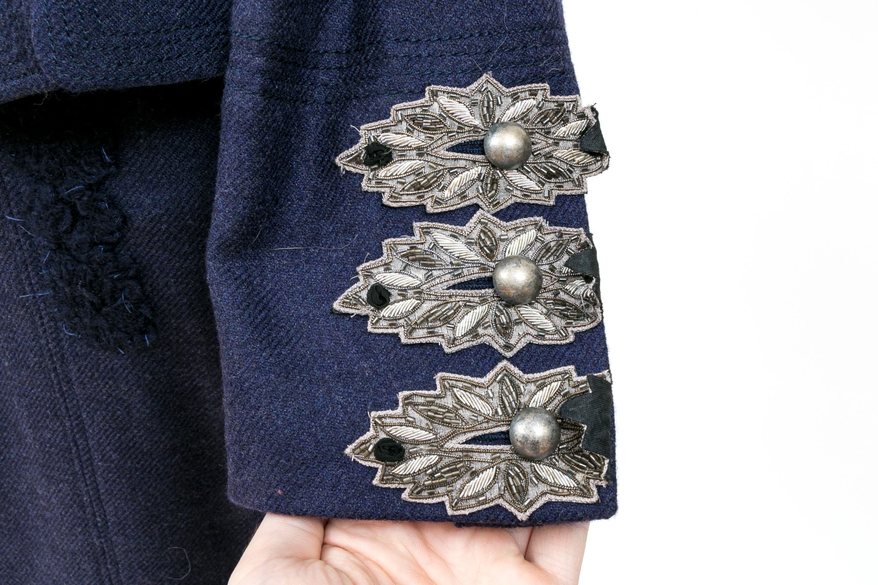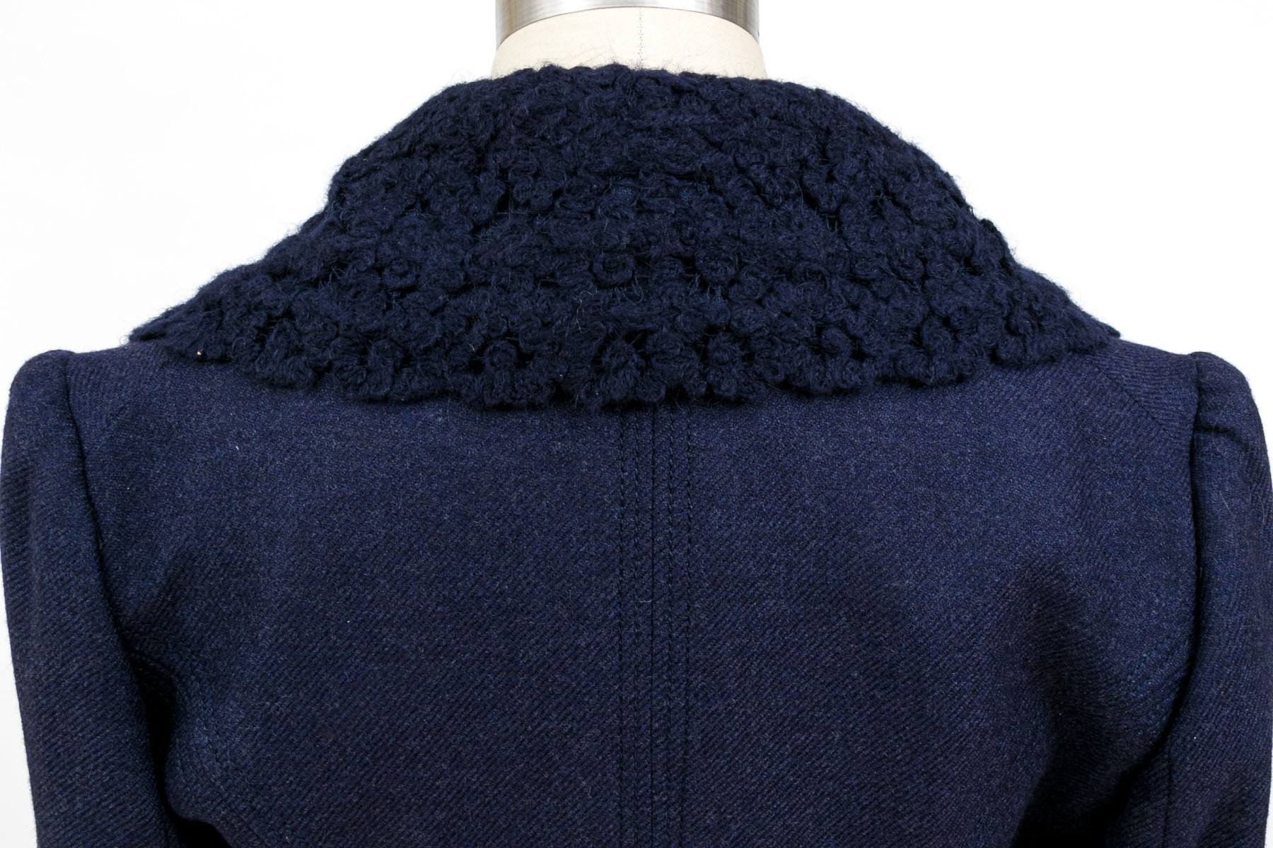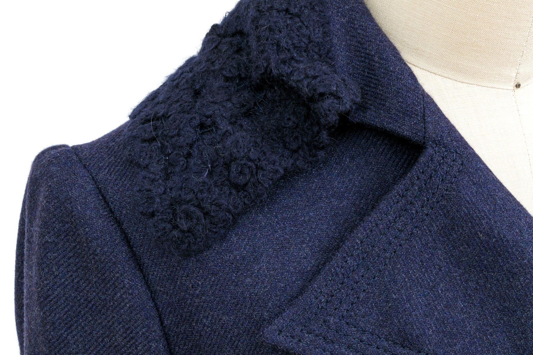 Blumarine eye-catching blue wool and cashmere skirt suit, size 44 Italy (USA 8), bedazzled grey buttons