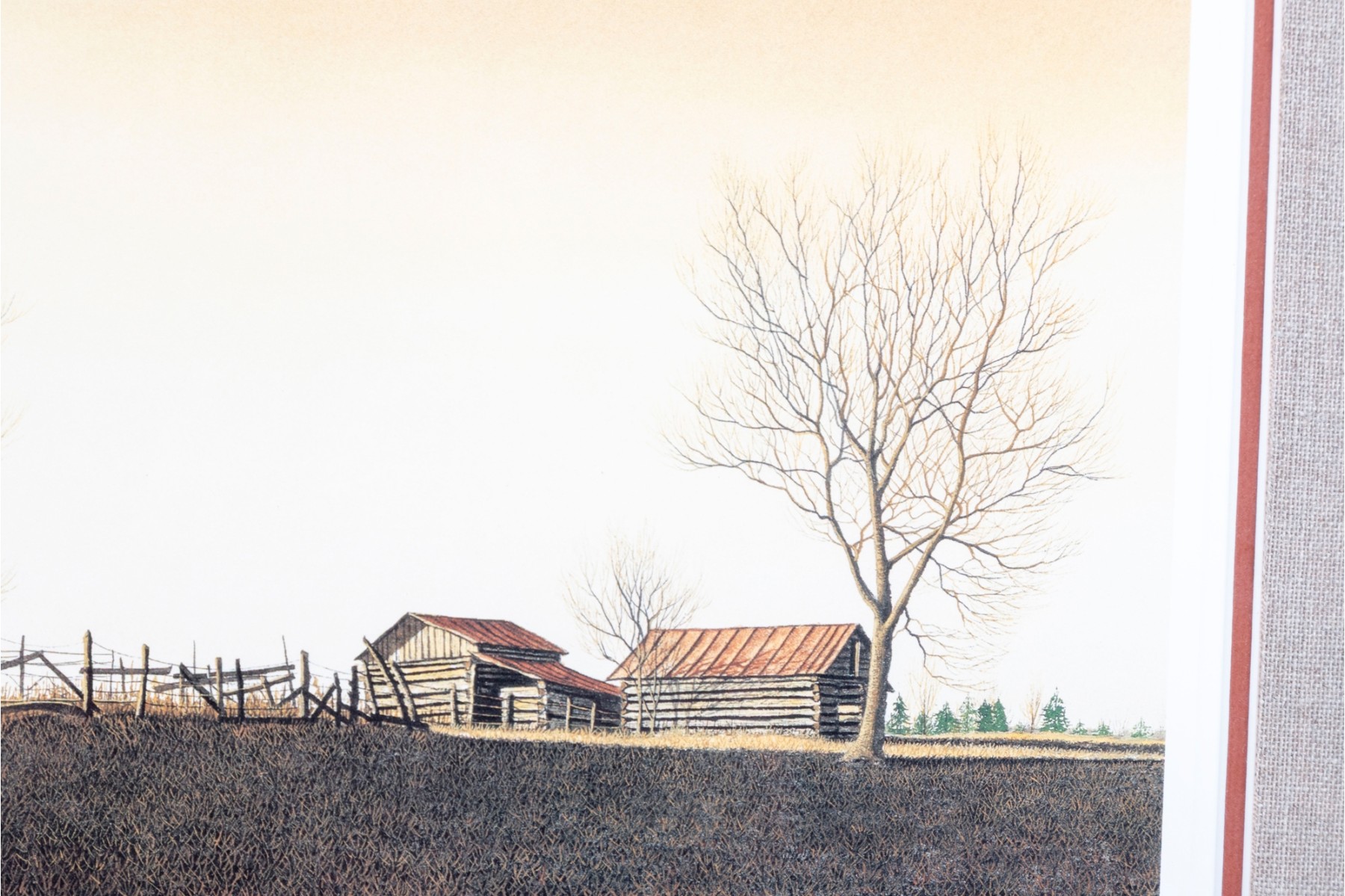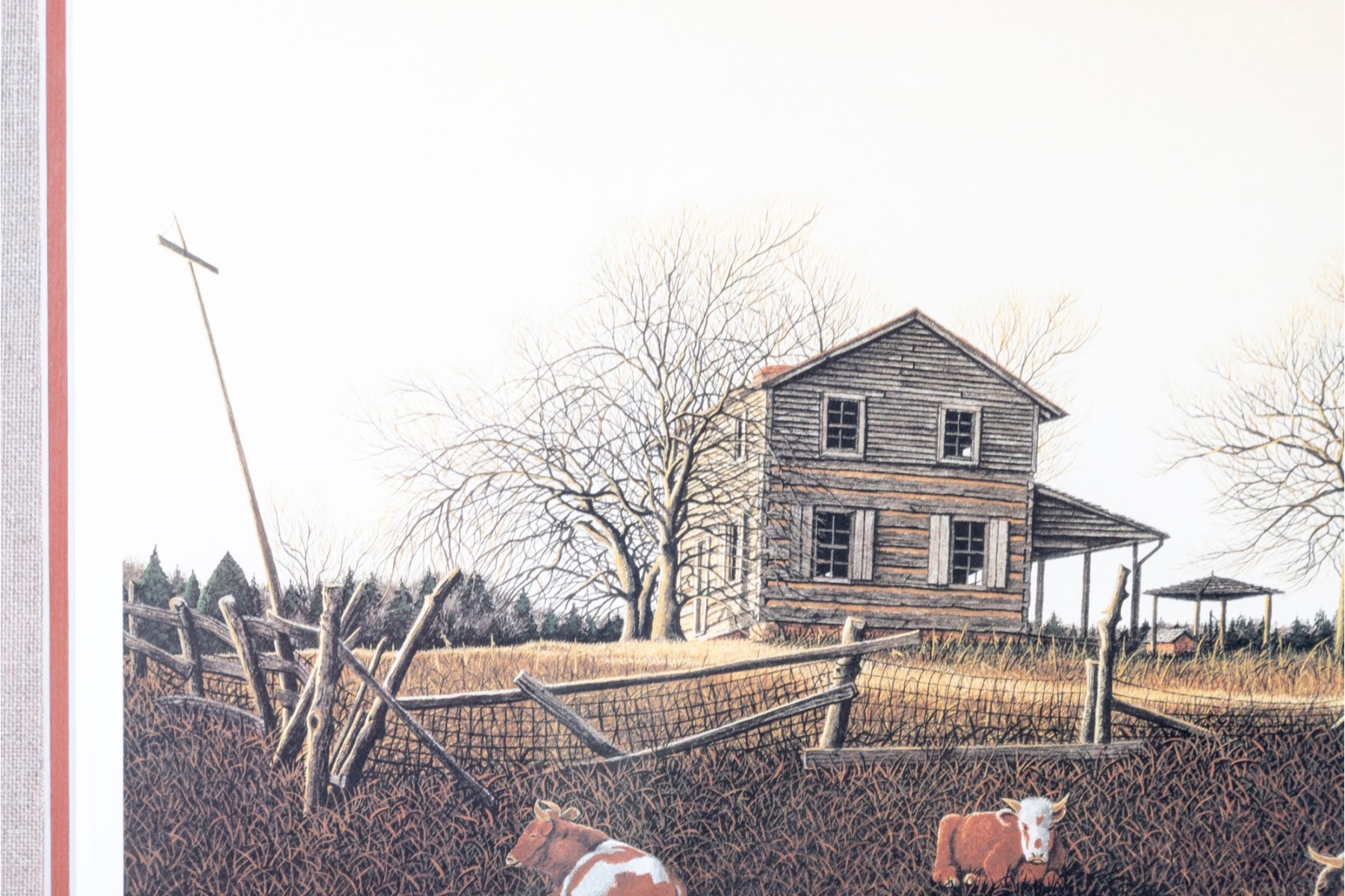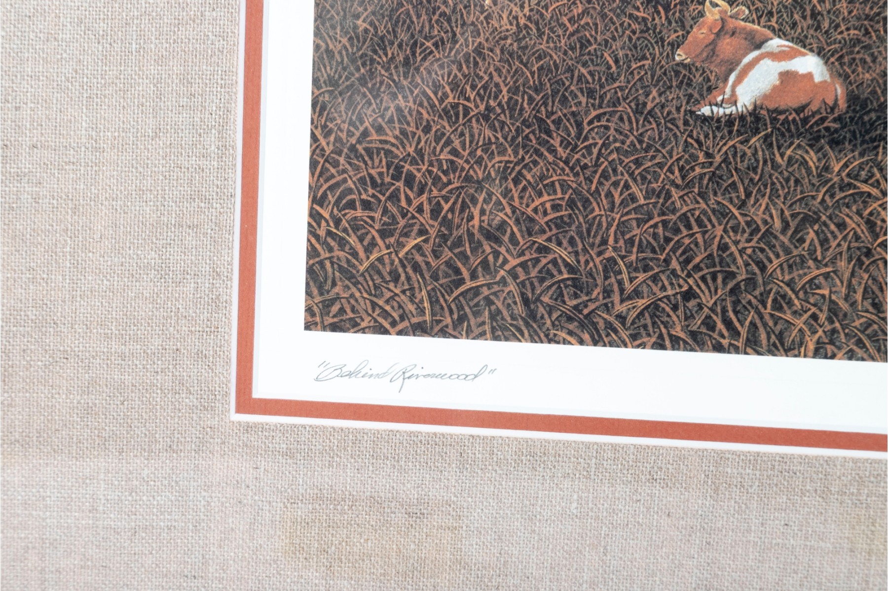 Limited edition pencil-signed lithograph print titled "Behind Riverwood" by renowned American realist artist Bob Timberlake (b. 1937). Presented in a handsome wooden frame