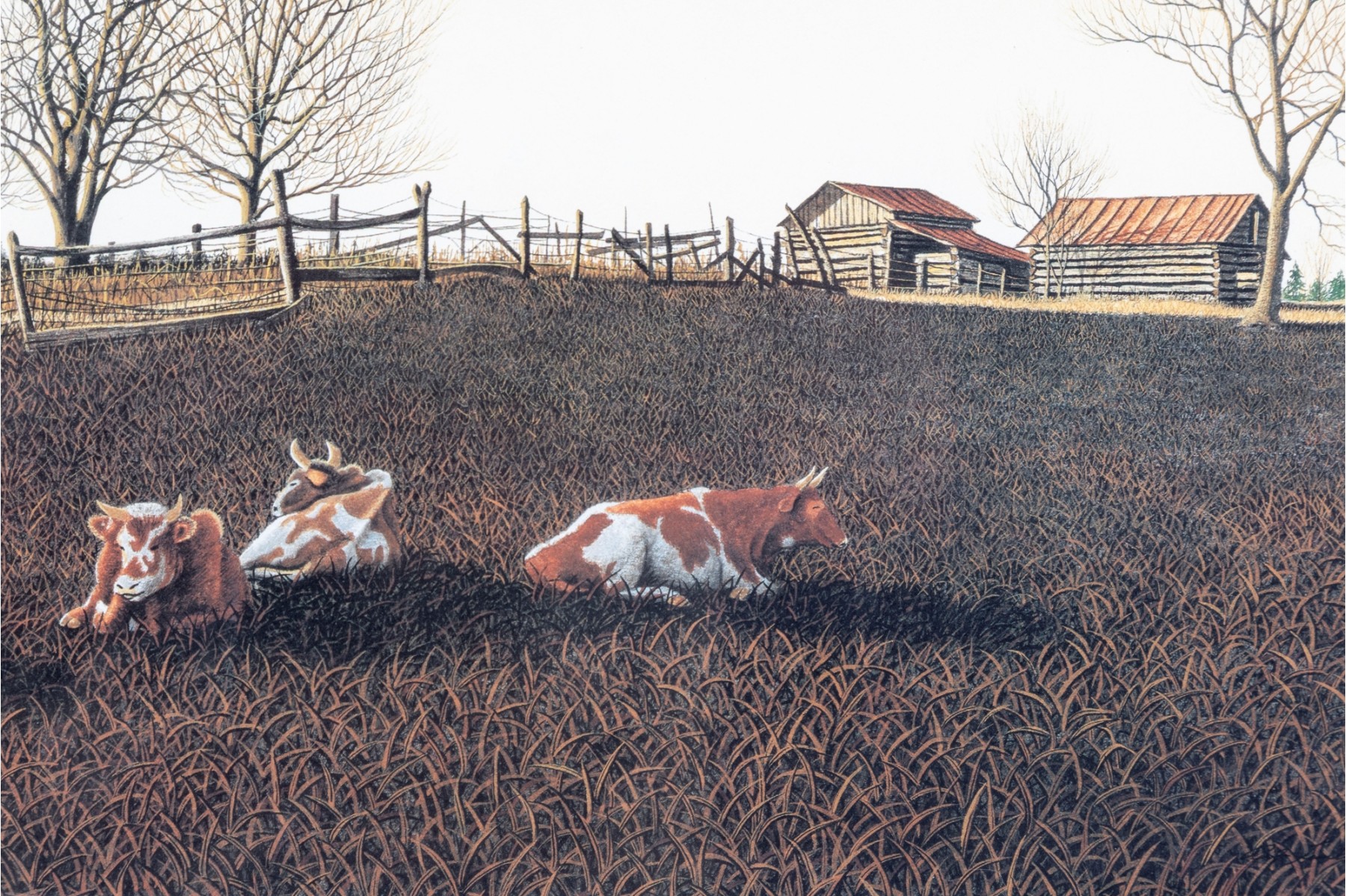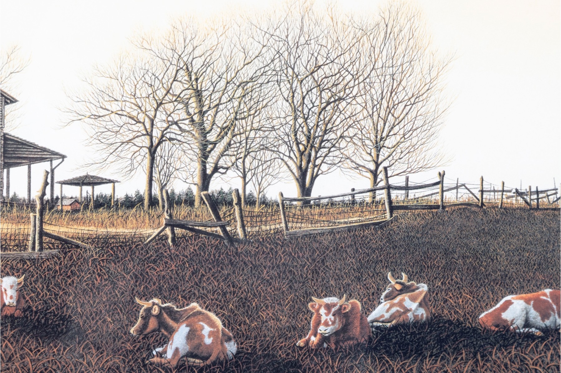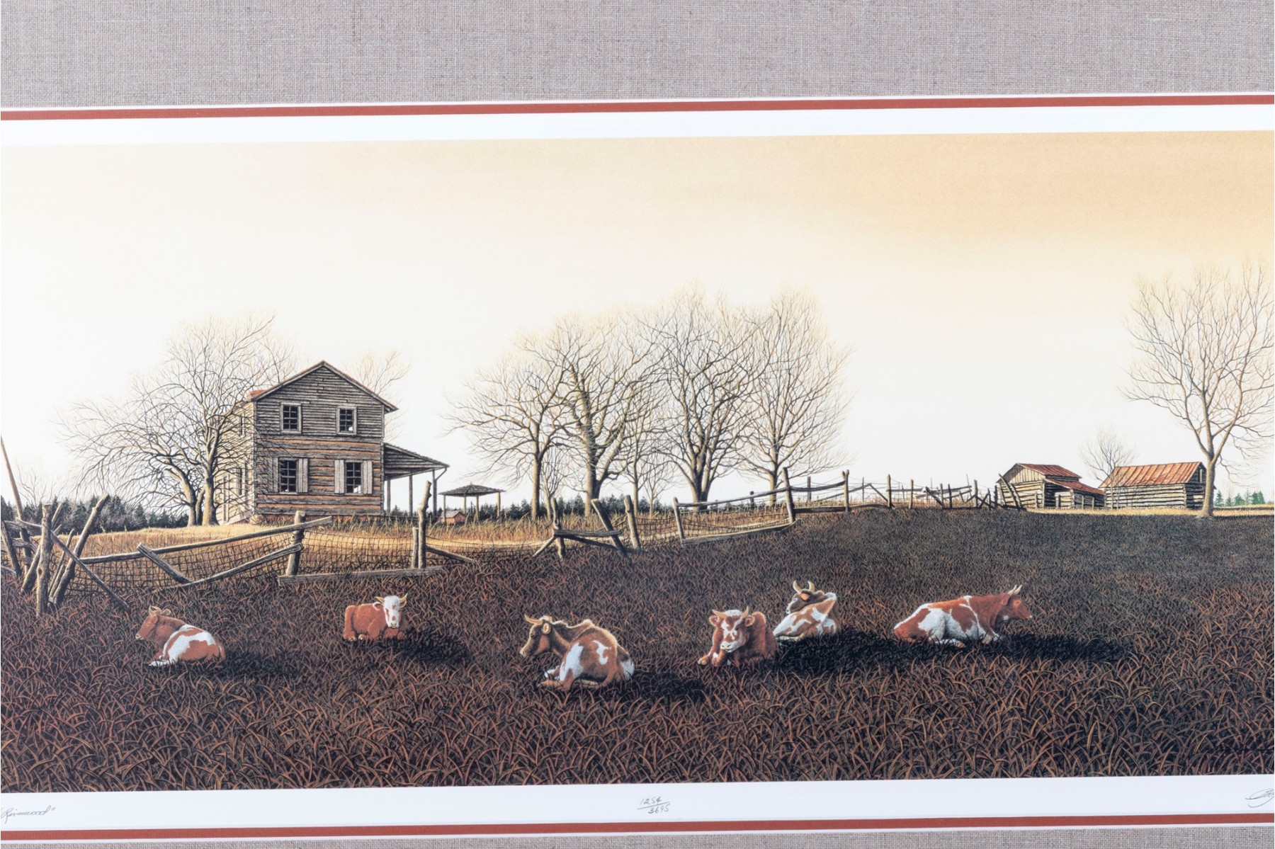 Limited edition pencil-signed lithograph print titled "Behind Riverwood" by renowned American realist artist Bob Timberlake (b. 1937). Presented in a handsome wooden frame