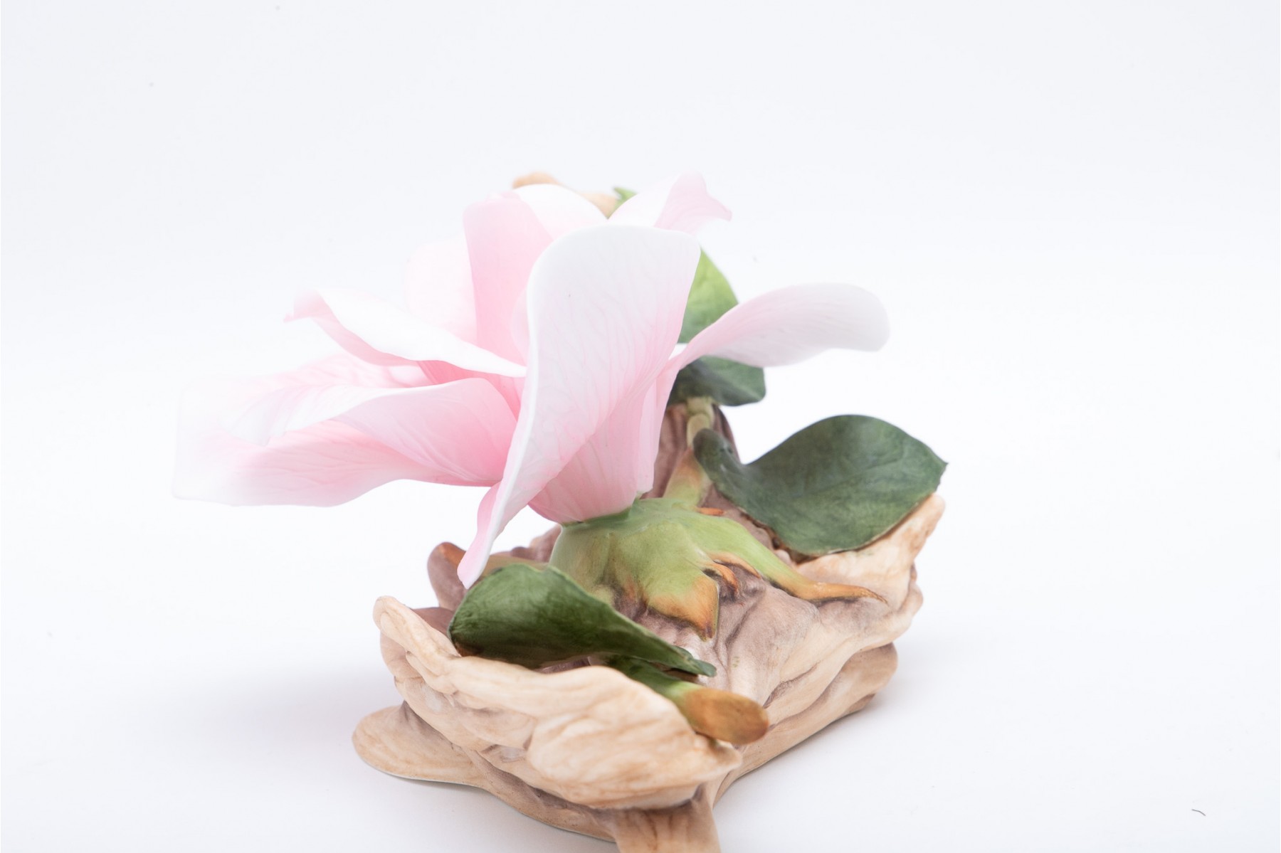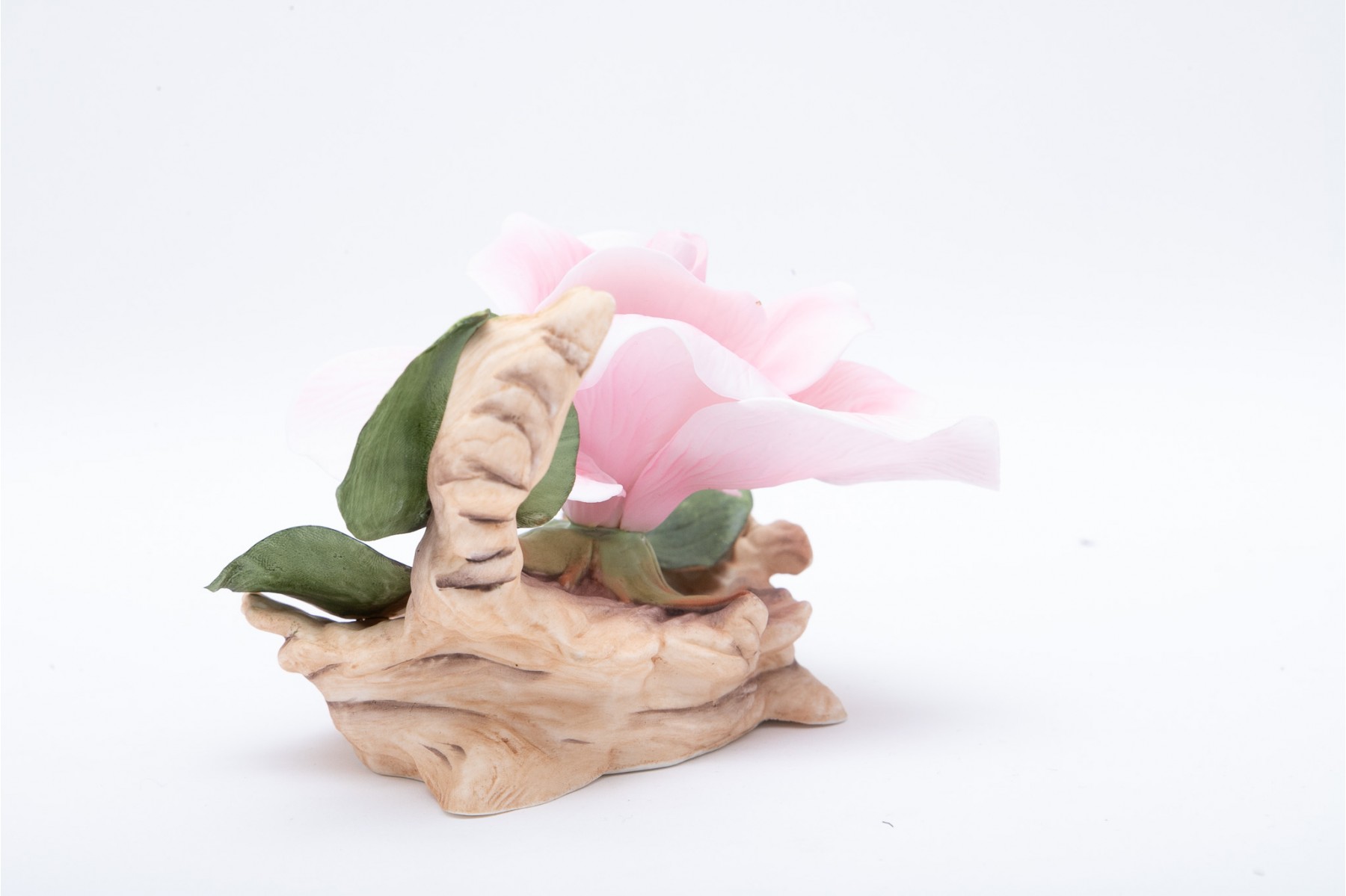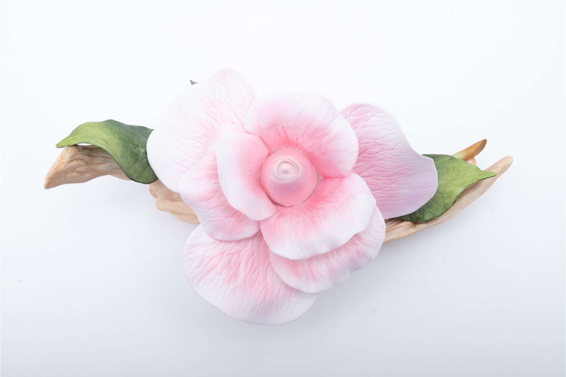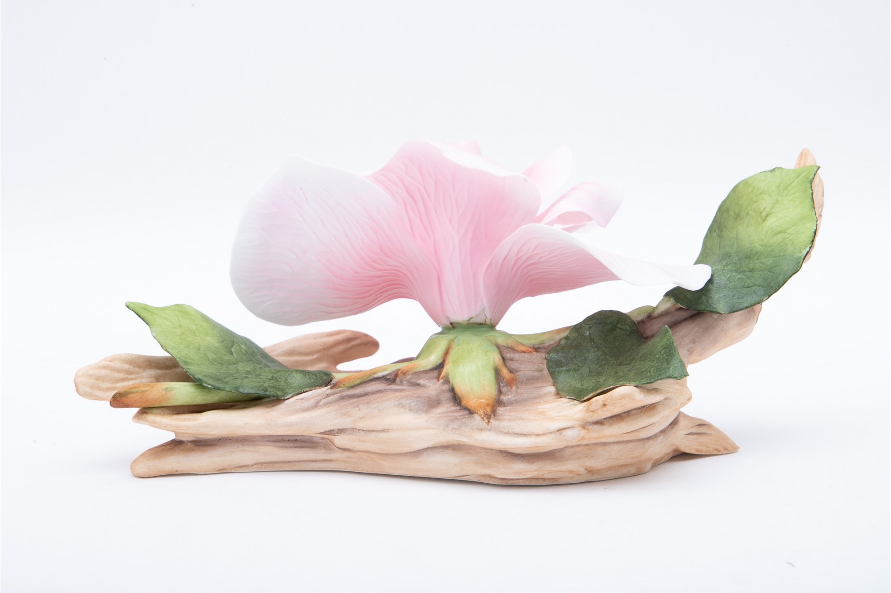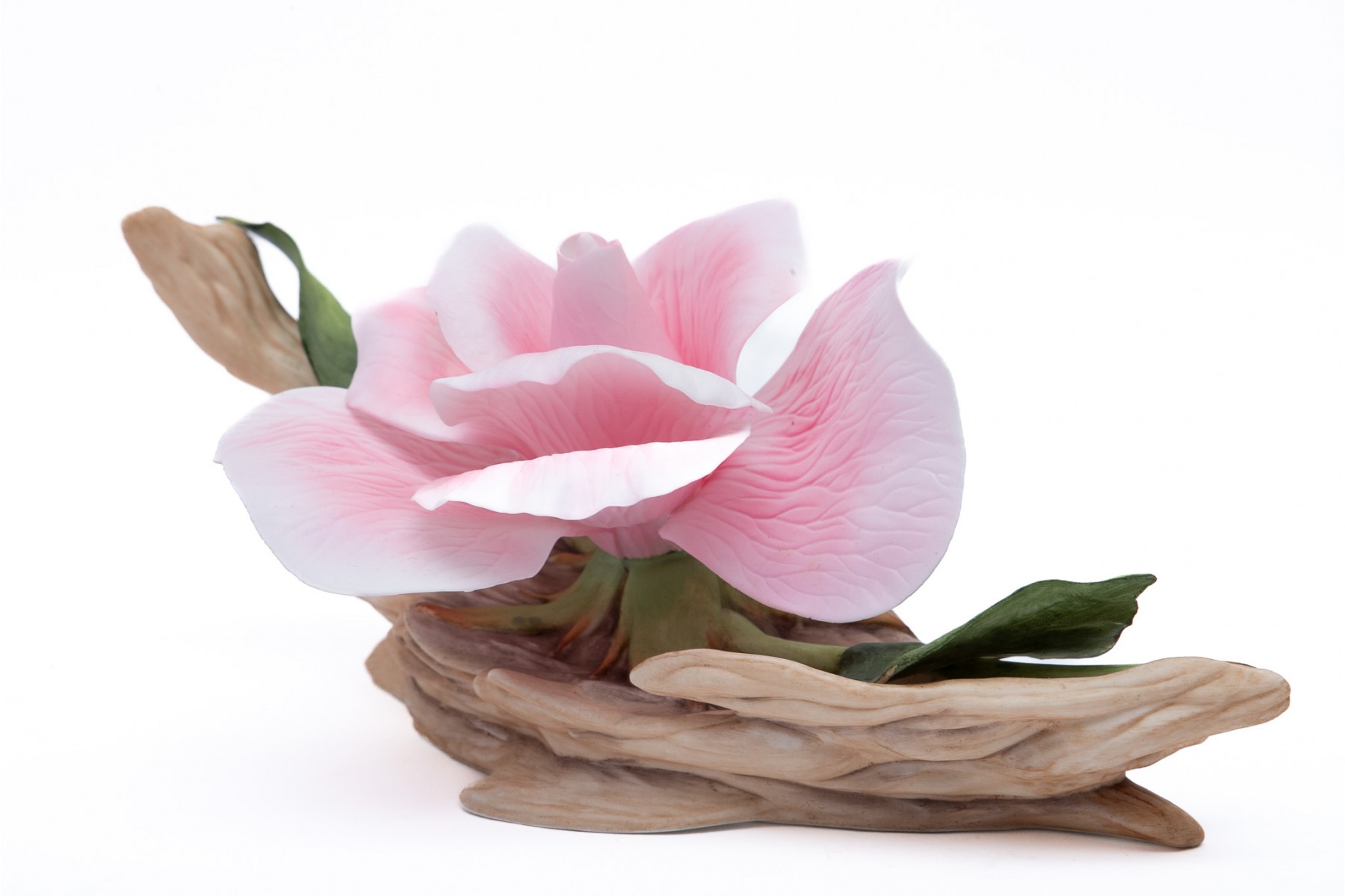 A beautifully detailed Boehm porcelain "American Express Rose" sculpture of a dainty single bloom in pale pink over white, surrounded by green leaves emerging from a naturalistic bark-like base. Marked and numbered 110 on the underside.