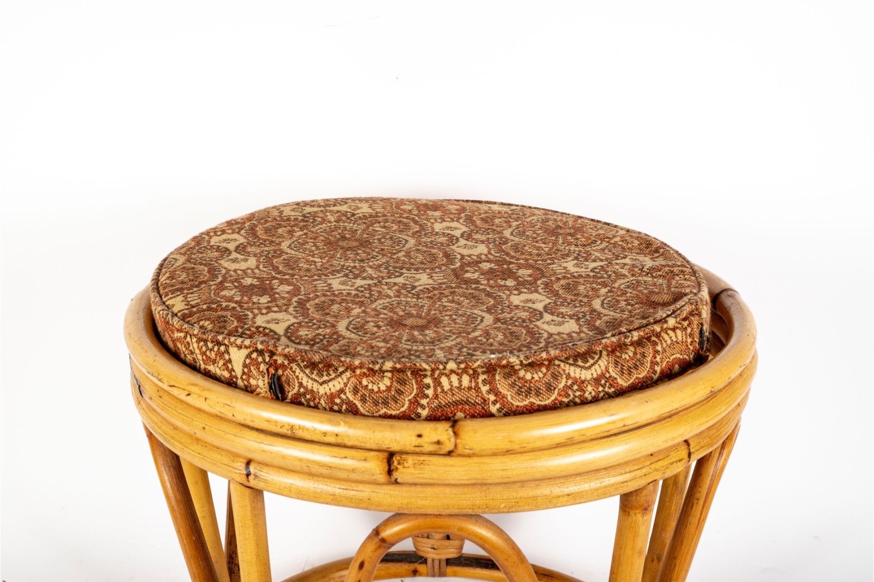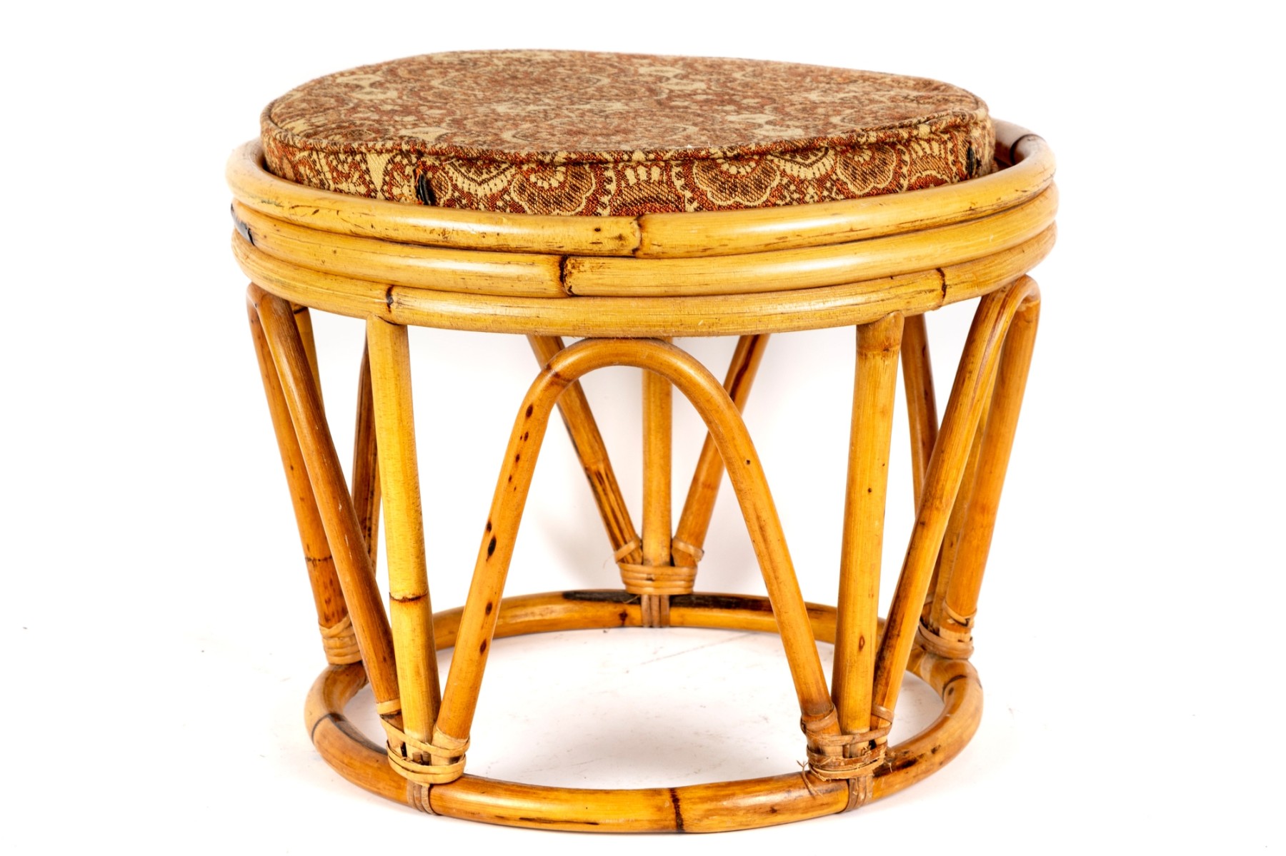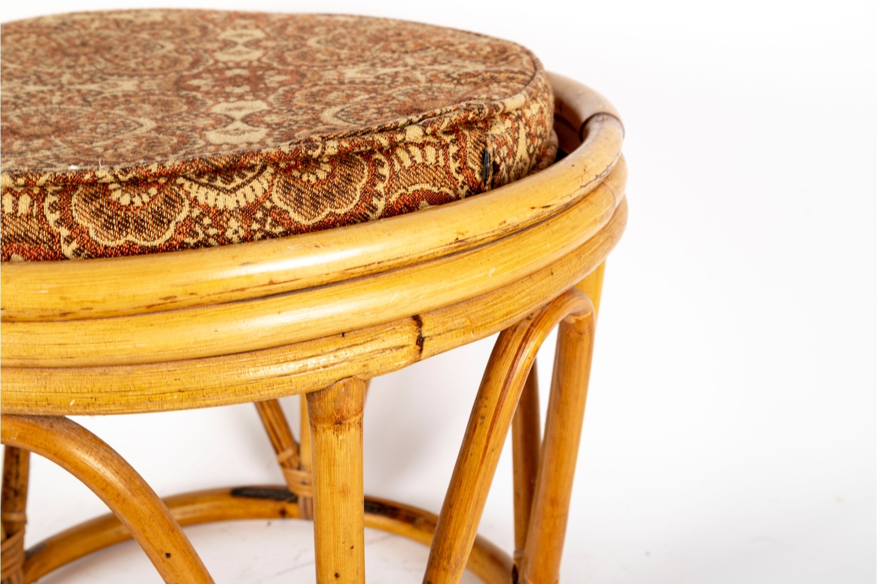 A vintage bamboo ottoman featuring a sturdy woven frame and an upholstered cushion pad for comfort. Lightweight yet durable, it adds a natural, bohemian touch to any space.