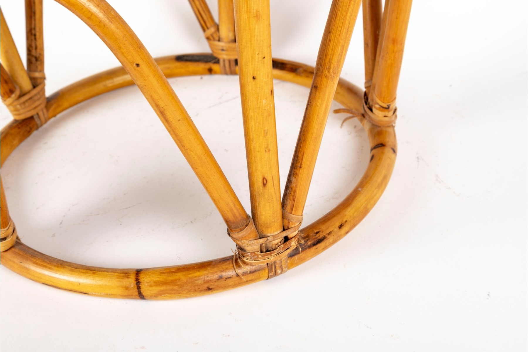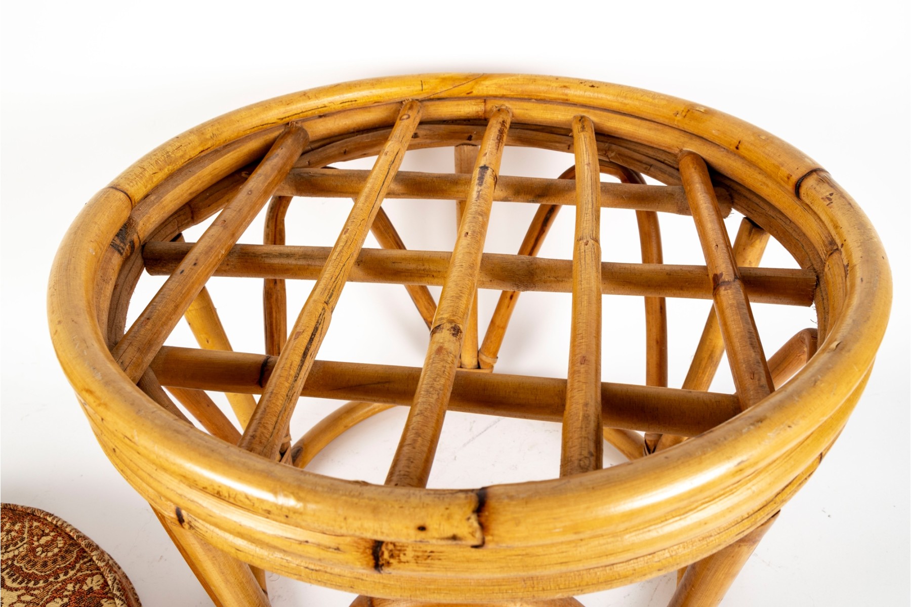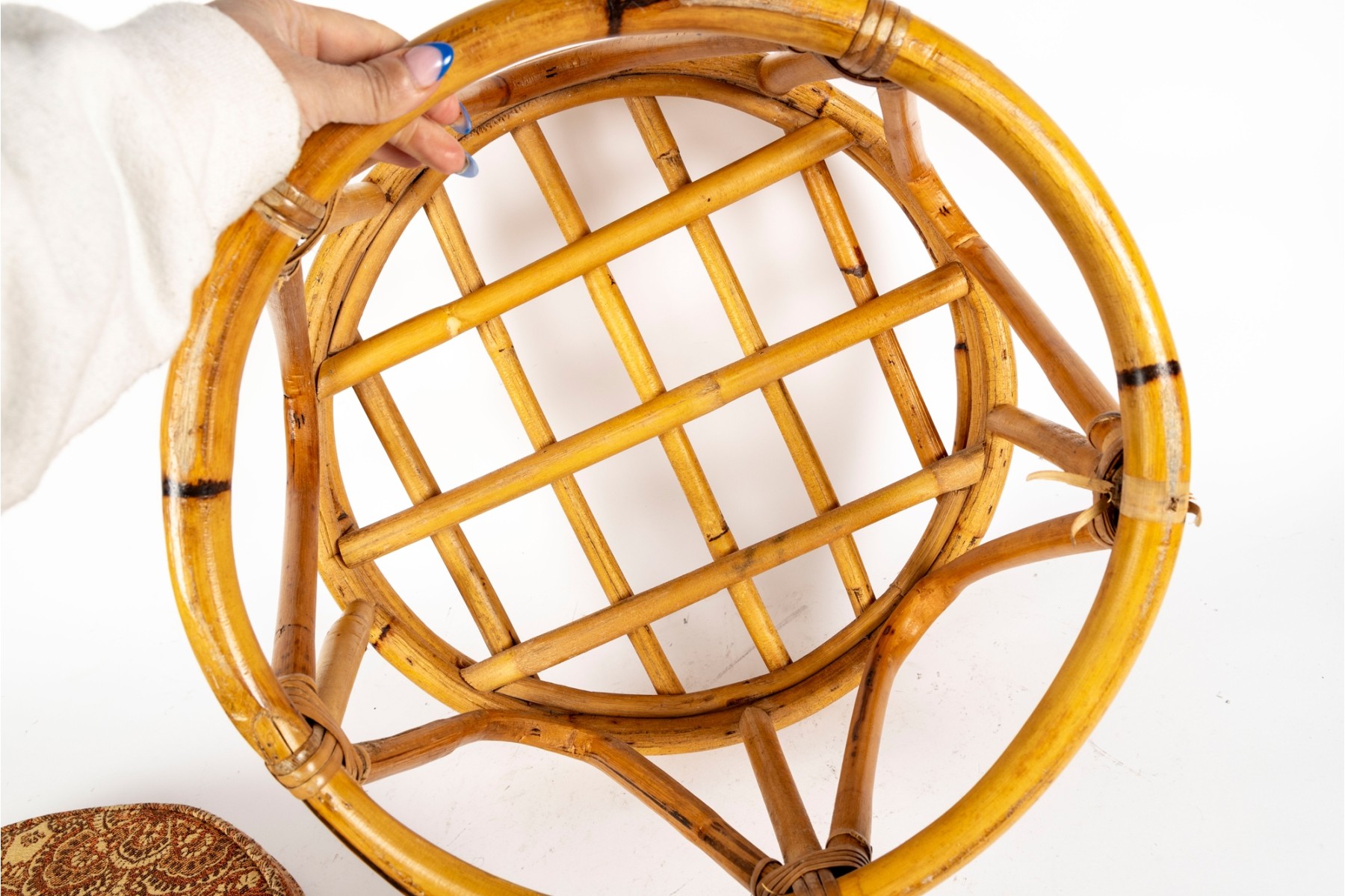 A vintage bamboo ottoman featuring a sturdy woven frame and an upholstered cushion pad for comfort. Lightweight yet durable, it adds a natural, bohemian touch to any space.