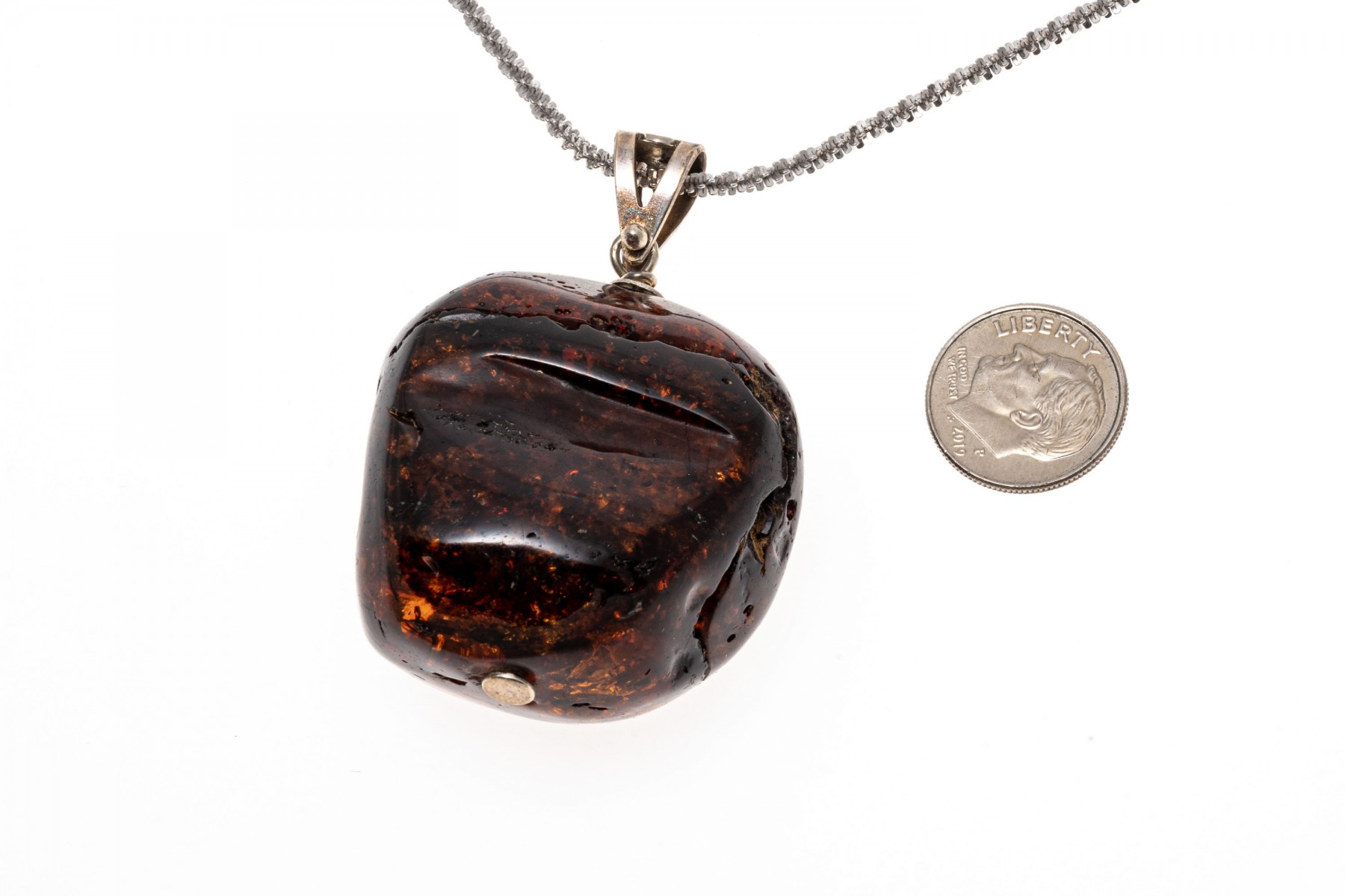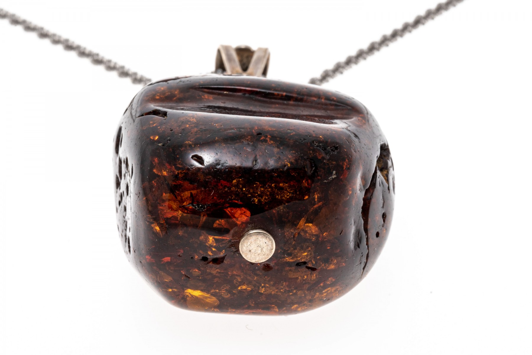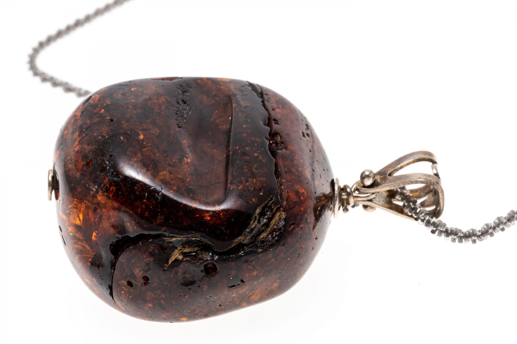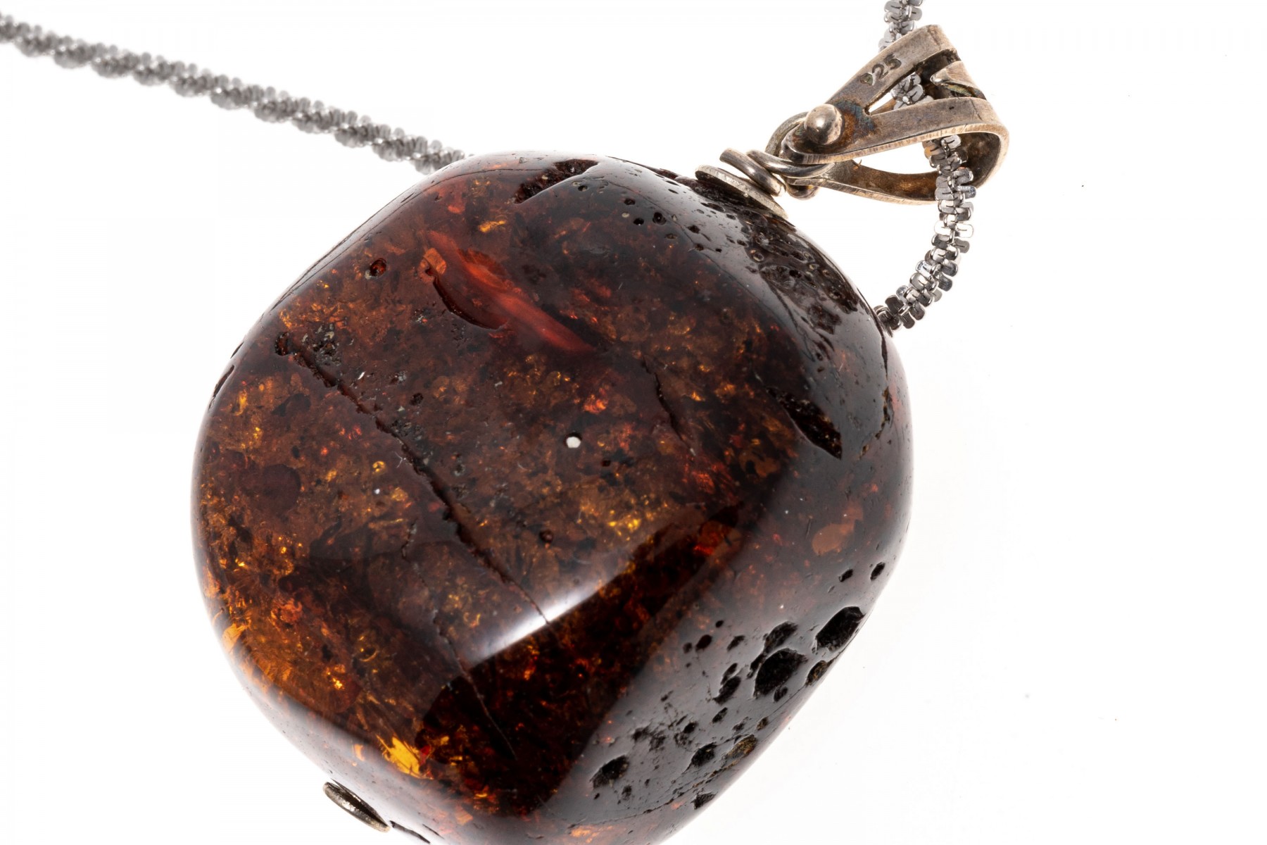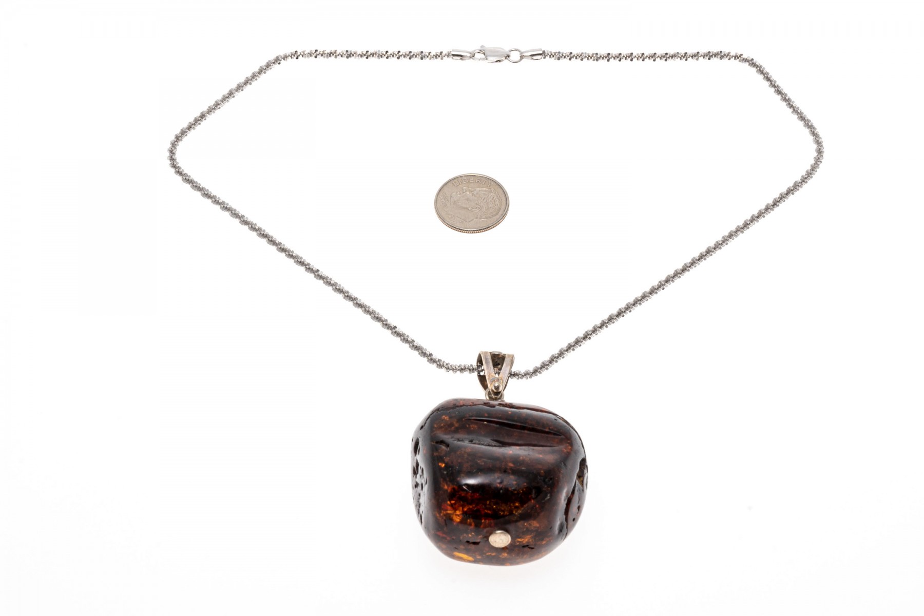 A large amber pendant (with sterling bale) is suspended from a shimmering sterling chain necklace. Necklace secures with a lobster claw clasp.