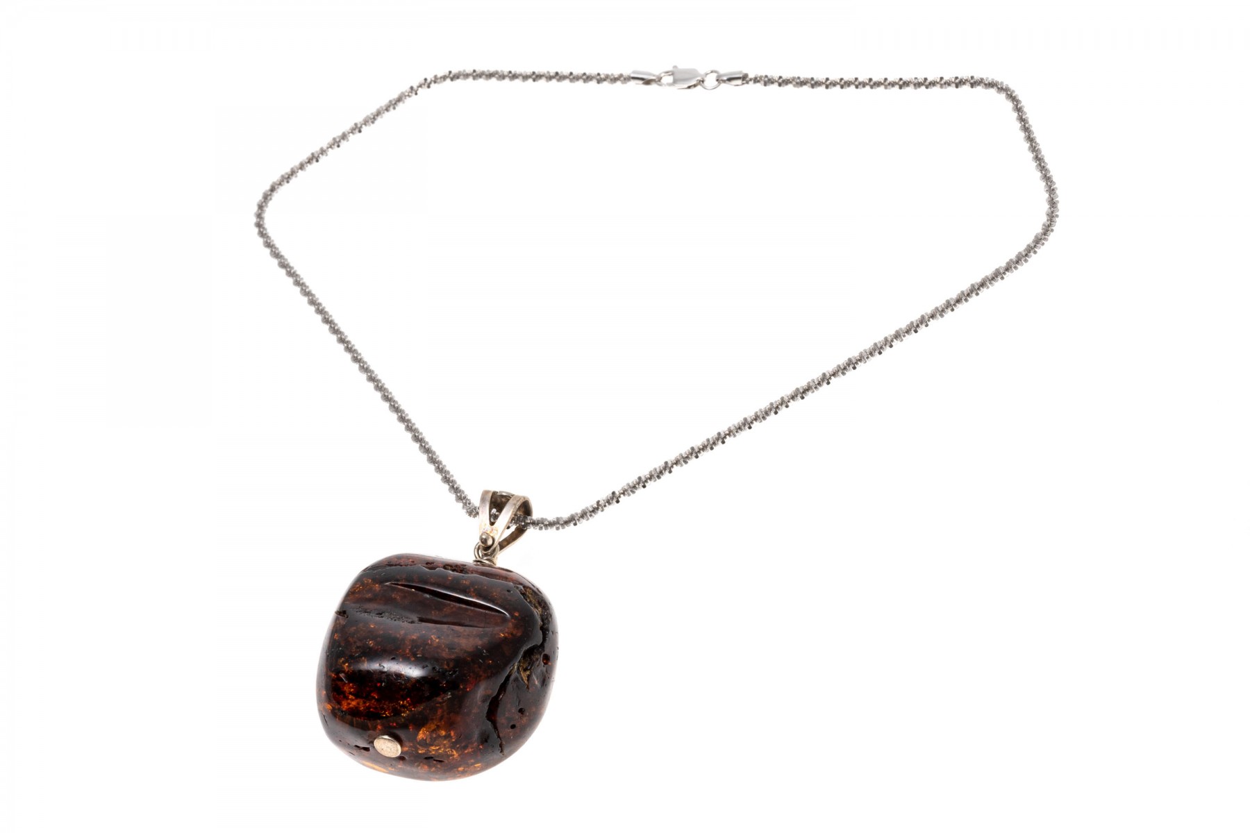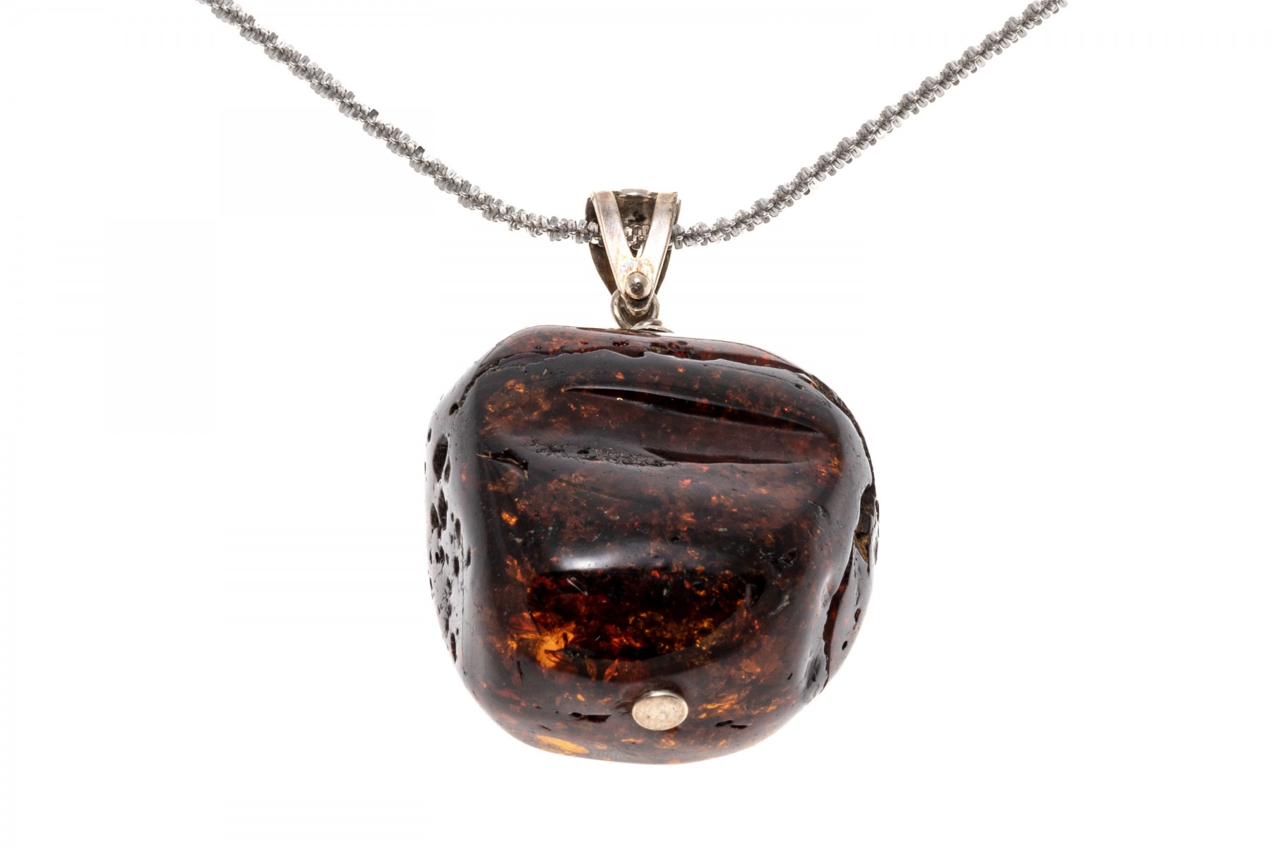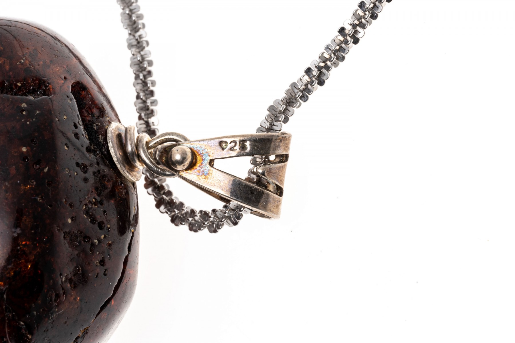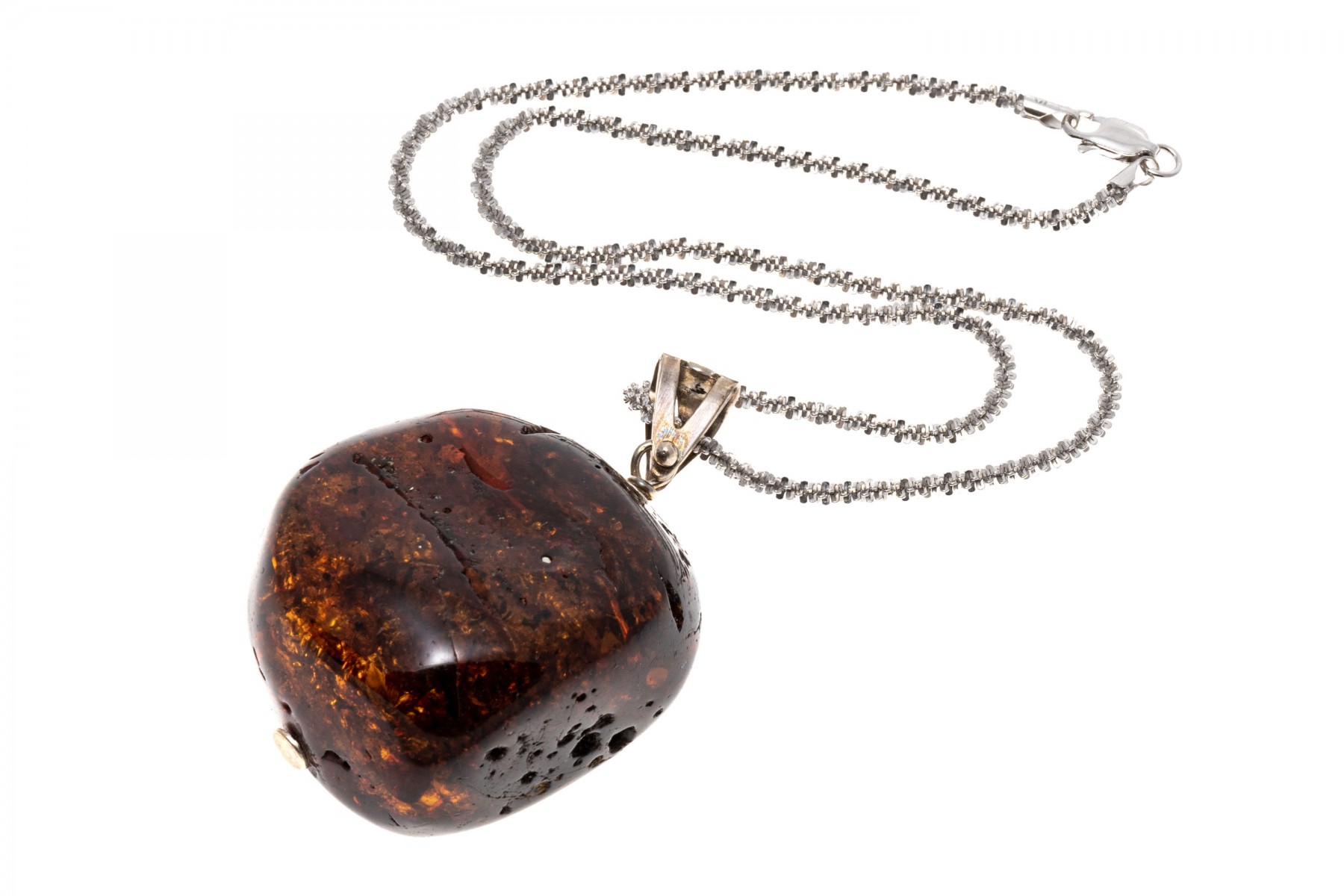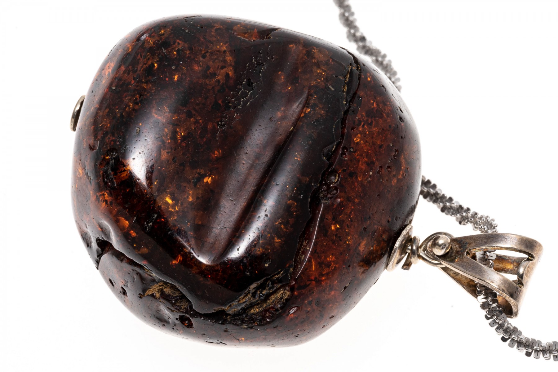 A large amber pendant (with sterling bale) is suspended from a shimmering sterling chain necklace. Necklace secures with a lobster claw clasp.