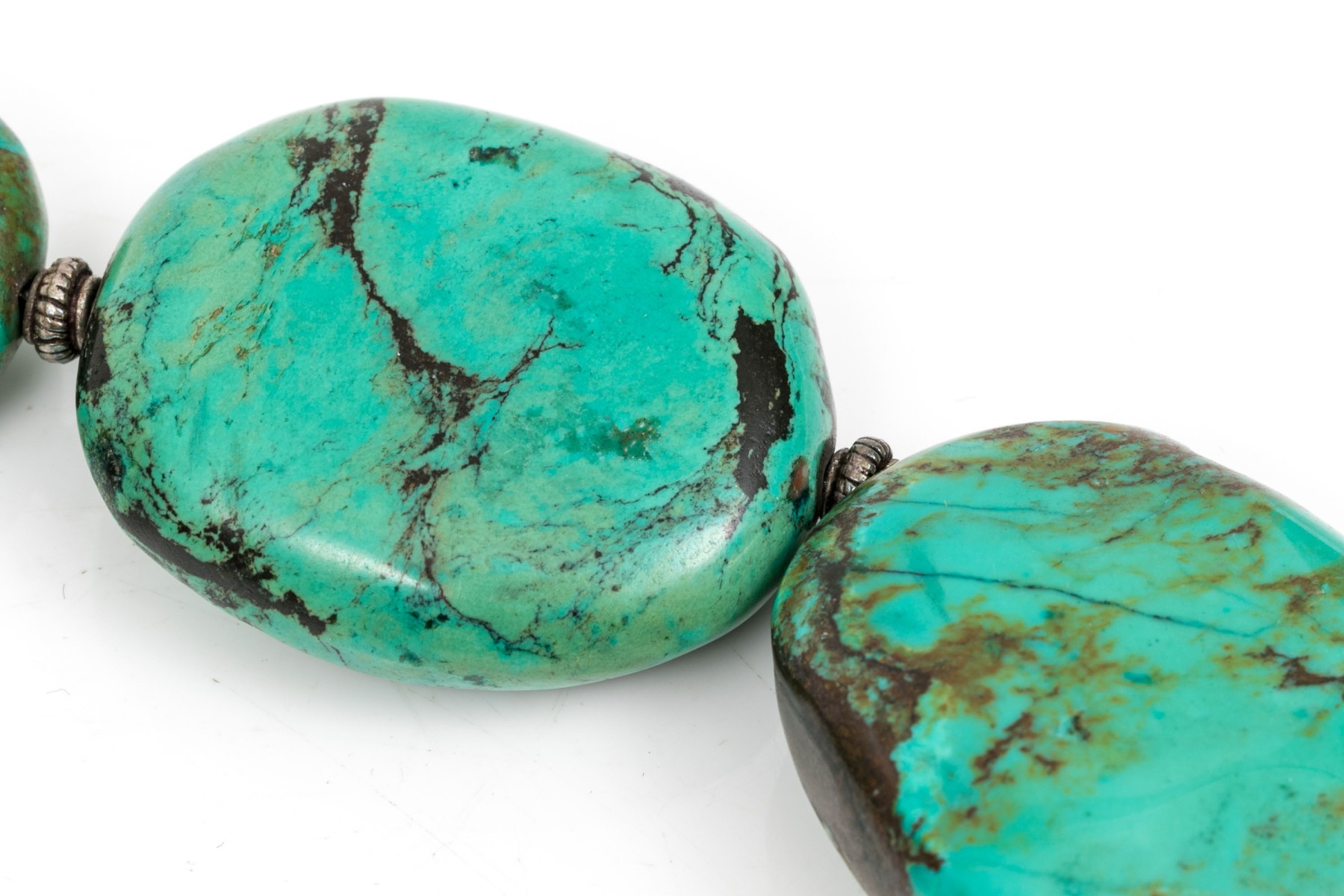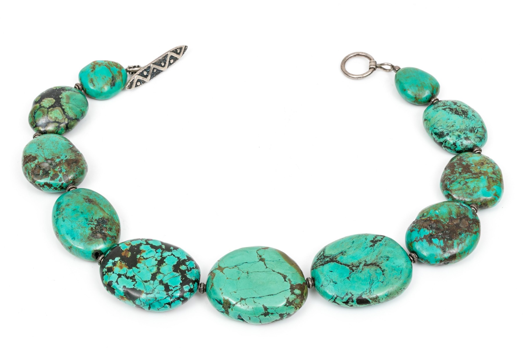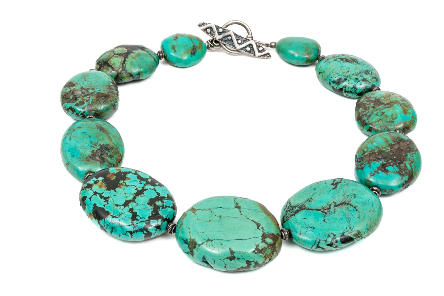 Bold statement necklace. Large graduated turquoise stones alternate with small sterling silver beads. Securing the necklace is a toggle clasp.