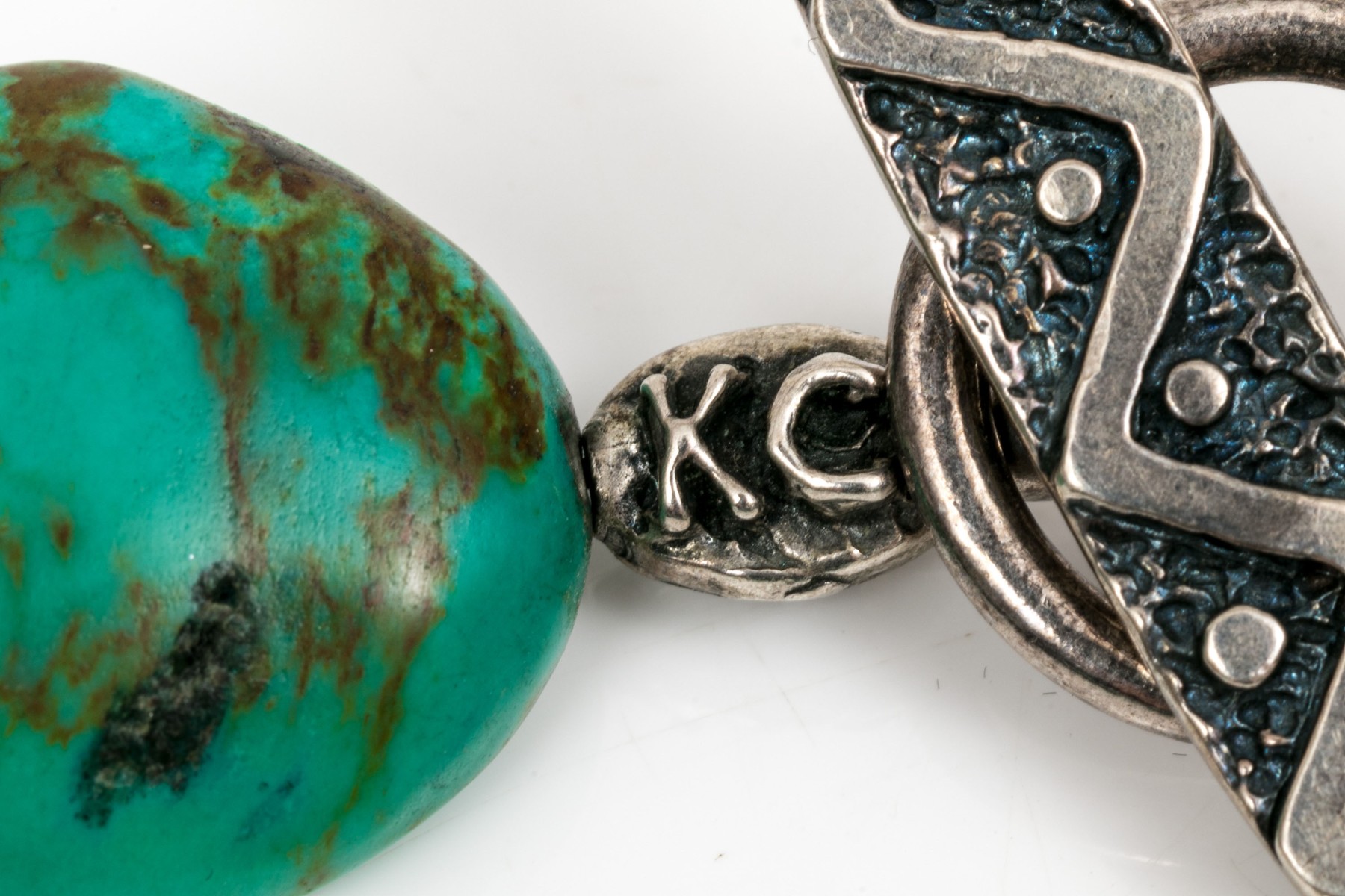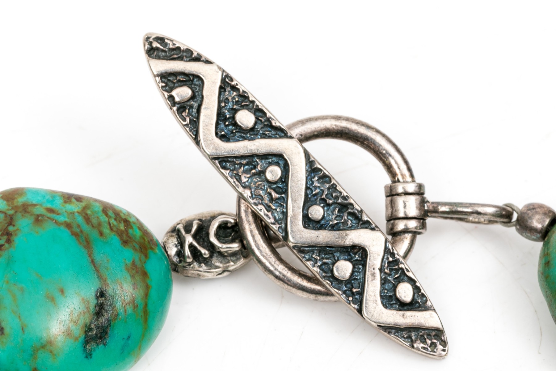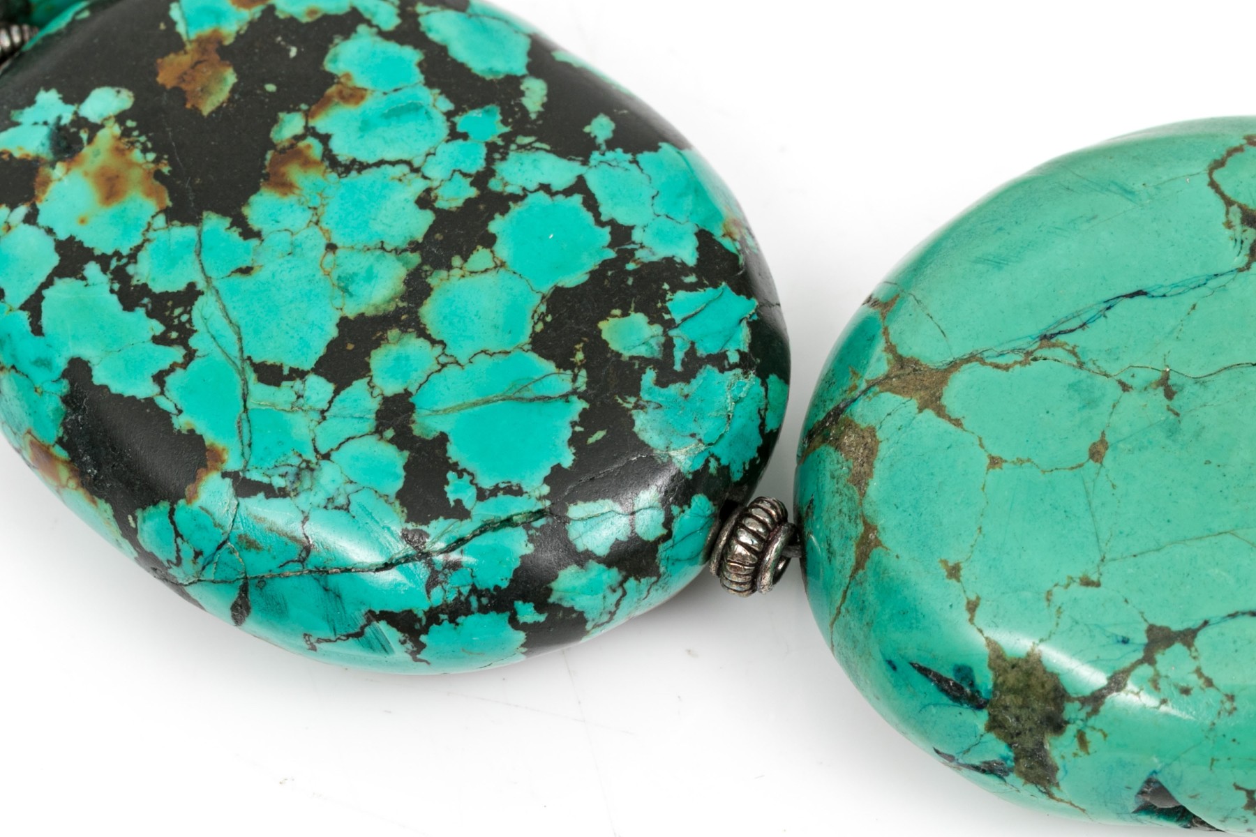 Bold statement necklace. Large graduated turquoise stones alternate with small sterling silver beads. Securing the necklace is a toggle clasp.