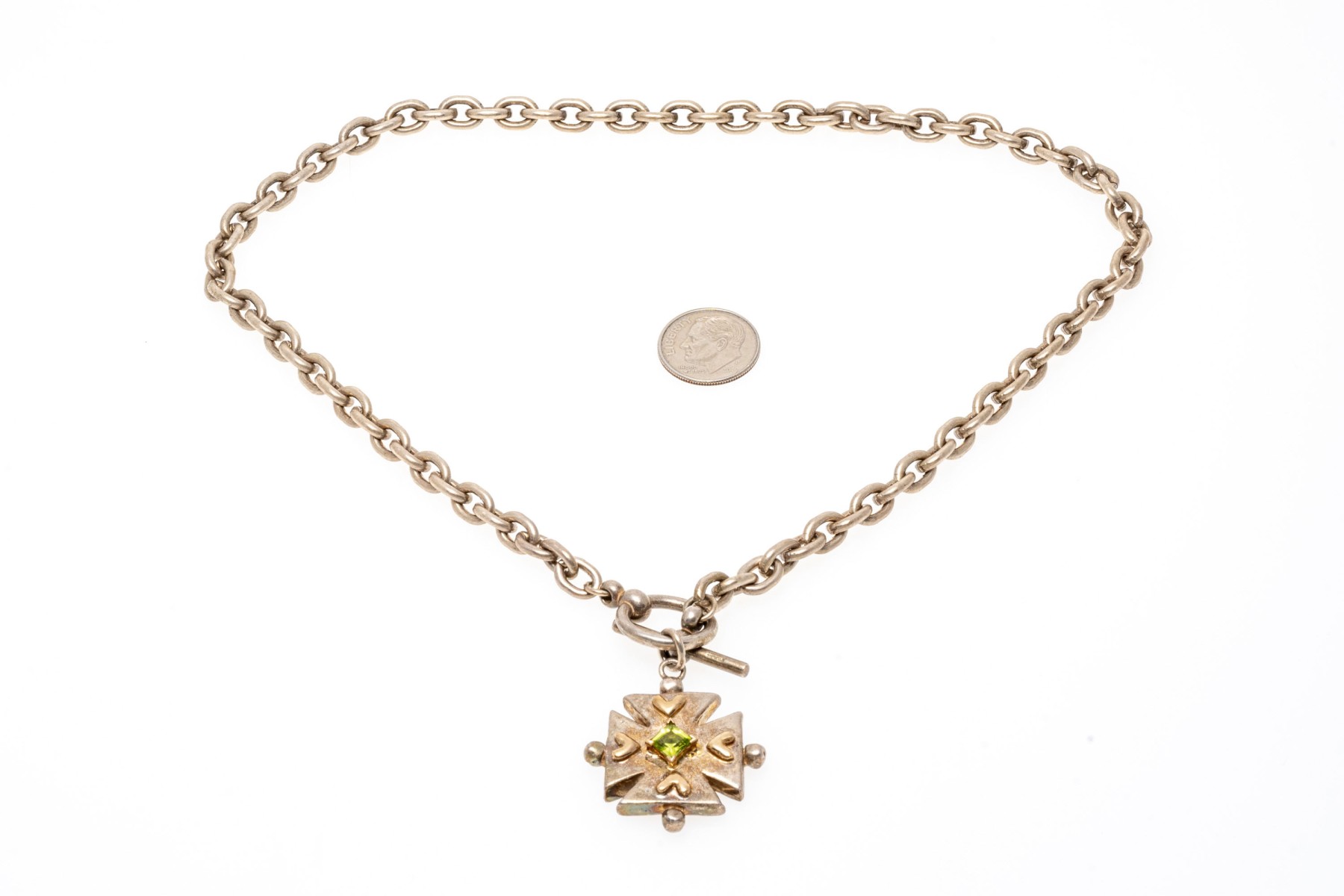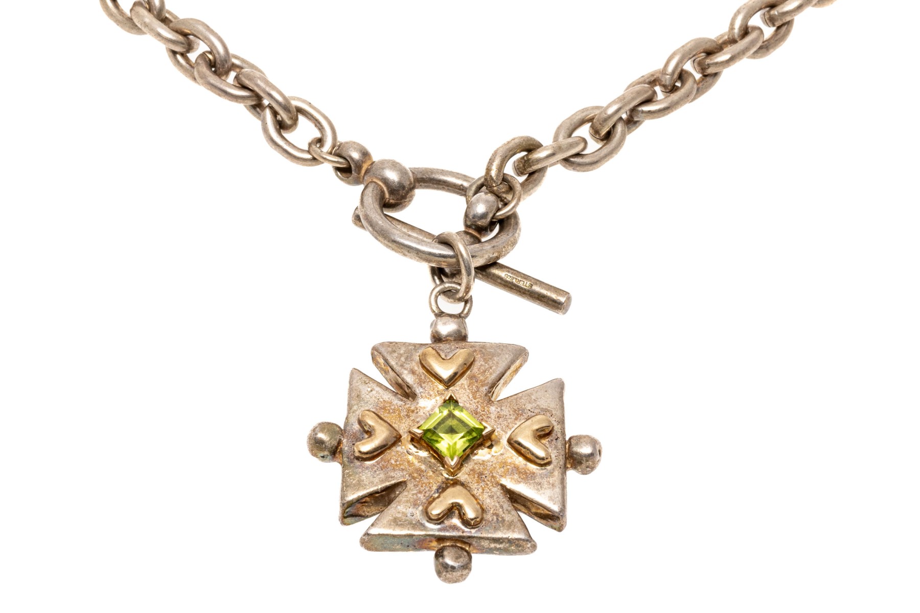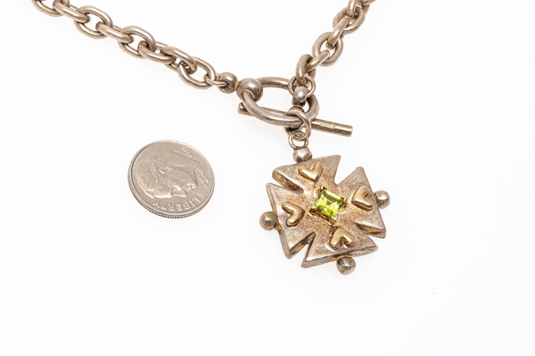 Bold sterling silver pendant necklace. Cable link chain displays a cross pendant with and etched design and a single square cut peridot stone at the center. Toggle clasp.