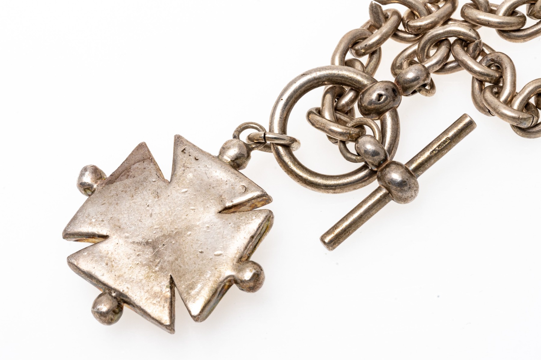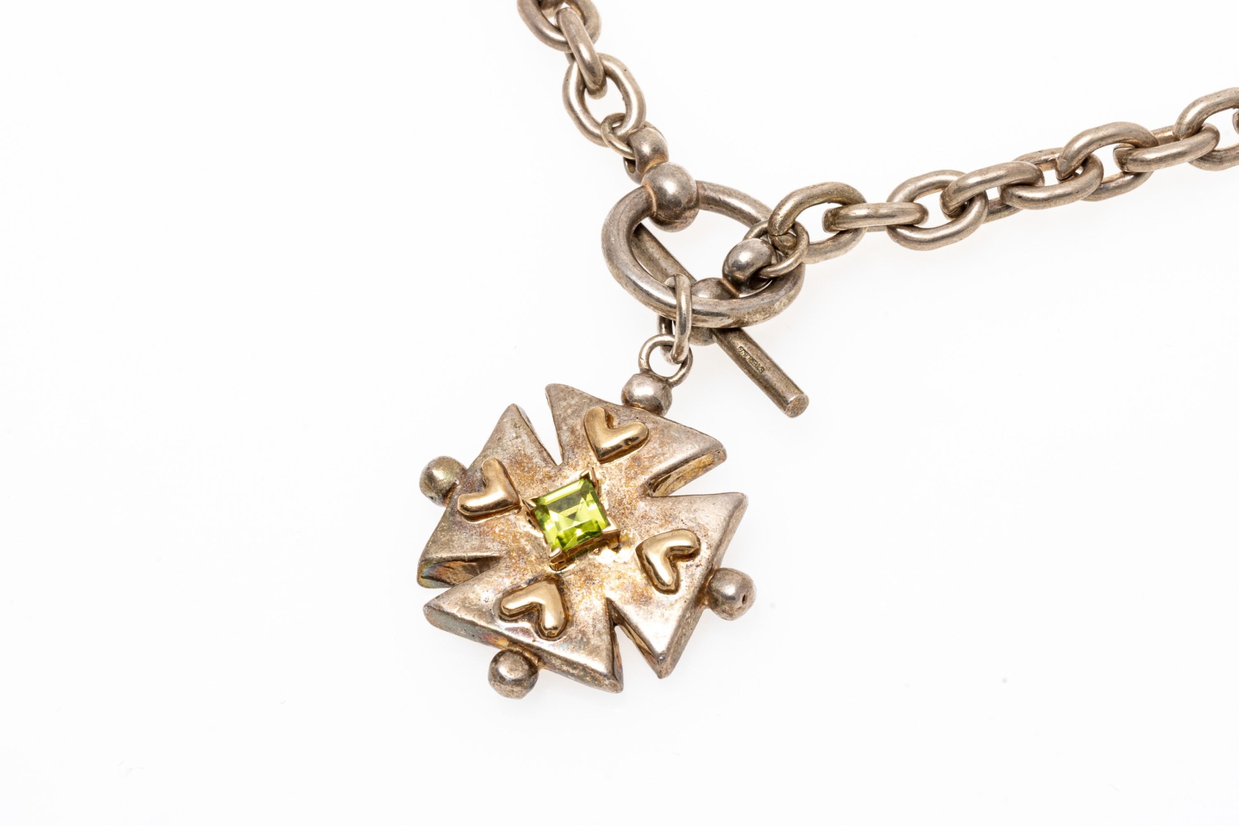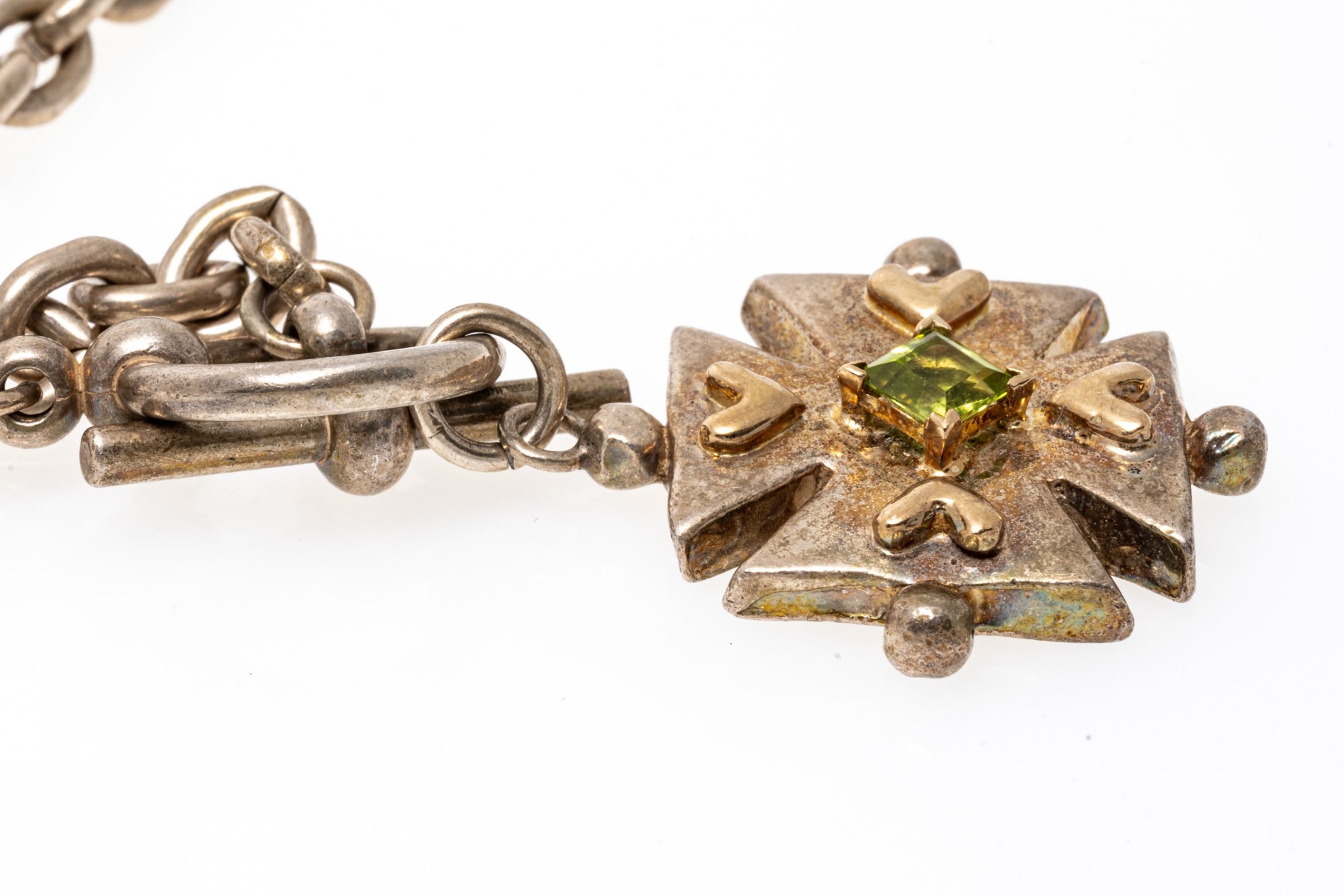 Bold sterling silver pendant necklace. Cable link chain displays a cross pendant with and etched design and a single square cut peridot stone at the center. Toggle clasp.