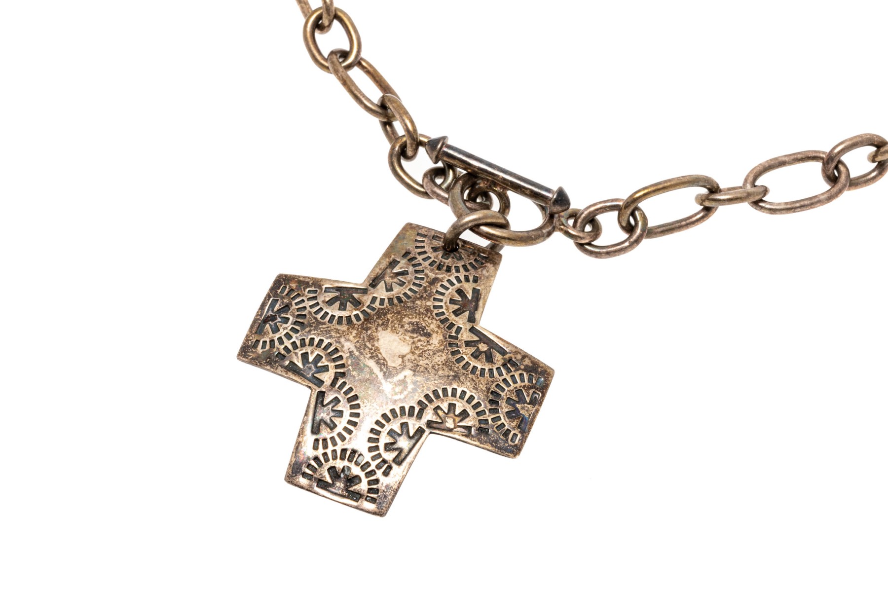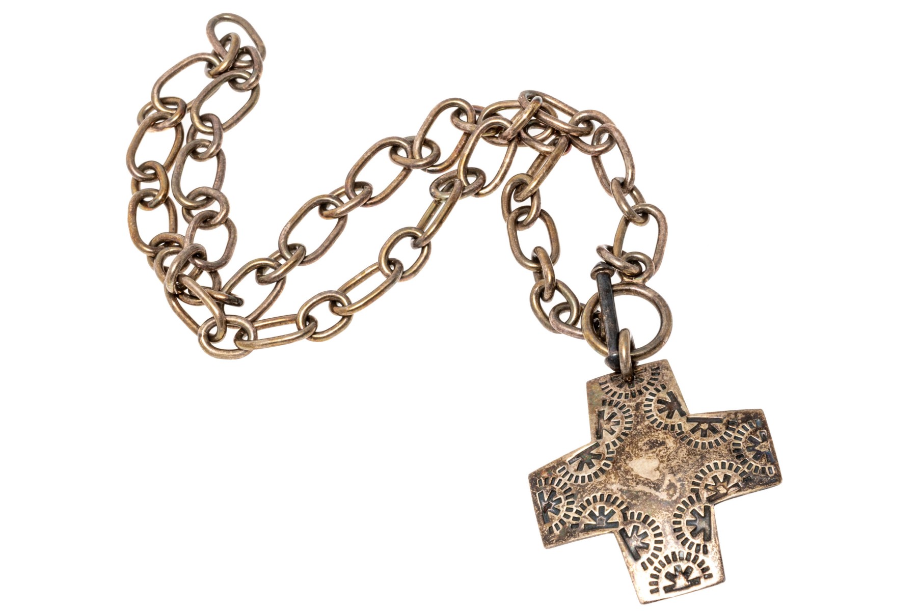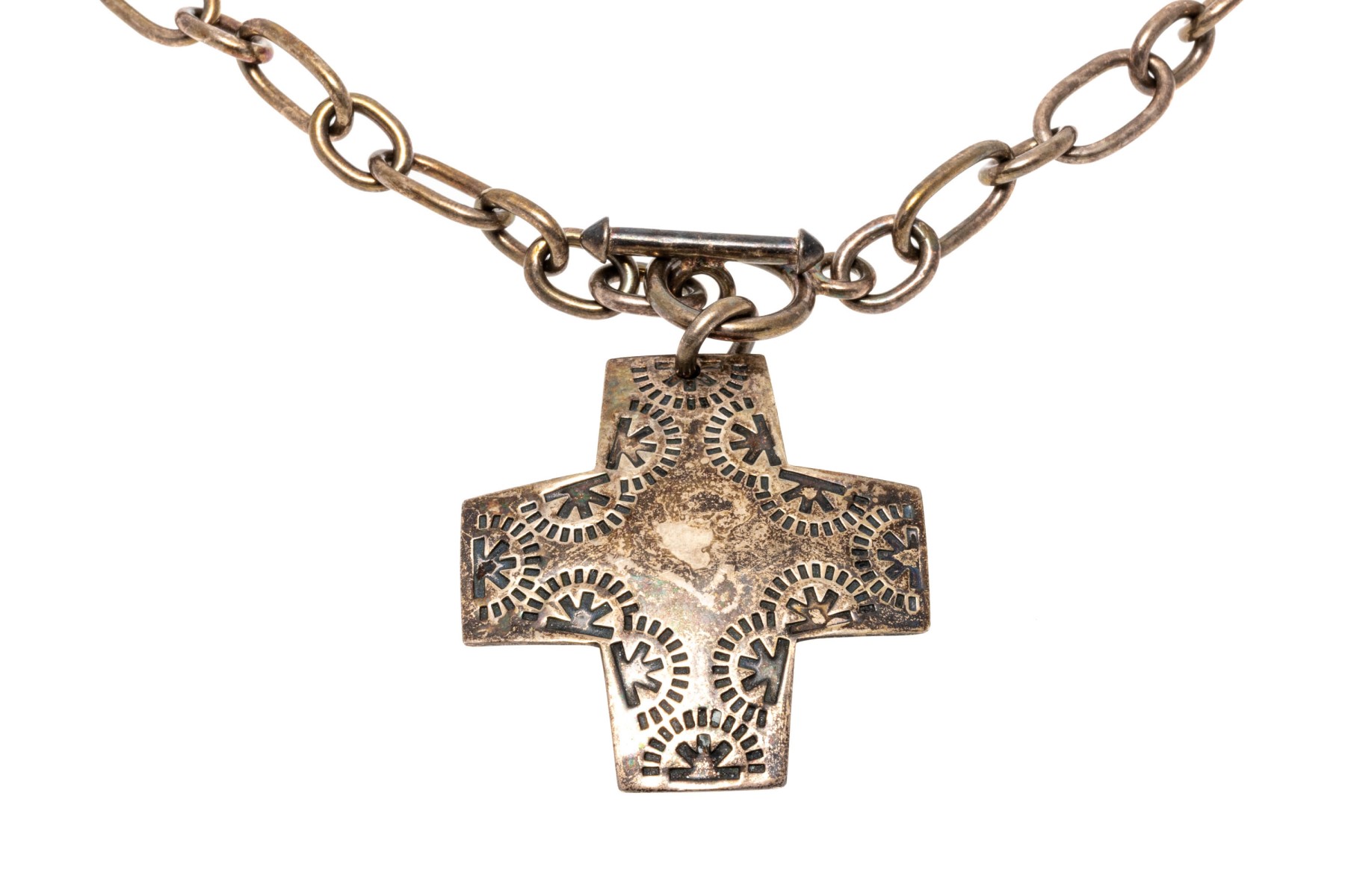 Bold sterling silver pendant necklace. Large cable link style chain with etched cross pendant. Toggle clasp.
